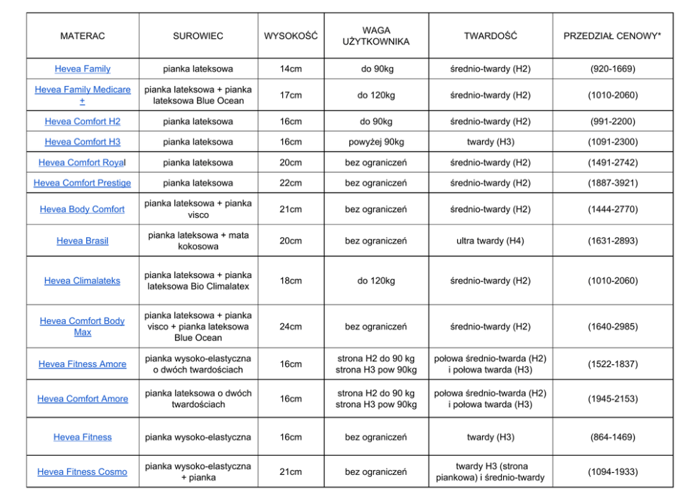 Zestawienie materacy - Hevea
