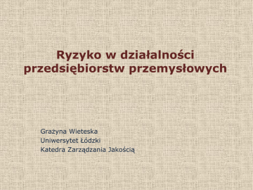 Ryzyko w działalności przedsiębiorstw przemysłowych Grażyna Wieteska Uniwersytet Łódzki Katedra Zarządzania Jakością Plan Prezentacji • • • • • • • Cel artykułu Dlaczego działalność przemysłowa wiąże się z ryzykiem? Relacja: poziom działania a rodzaj ryzyka w przedsiębiorstwie przemysłowym. Jakie są podstawowe źródła ryzyka, czyli zagrożenia, dla działalności przemysłowej? Identyfikacja zagrożeń – mapa procesów i zasada 5M+E. Trzy podstawowe metody ograniczania ryzyka. Wnioski Cel Celem artykułu jest wskazanie najważniejszych obszarów występowania źródeł ryzyka dla działalności przemysłowej. Dlaczego działalność przemysłowa wiąże się z ryzykiem? 1. Obserwuje się wzrost ilości zagrożeń dla działalności przemysłowej w wyniku np.: – pojawiania się nowych technologii, często całkowicie nierozpoznanych, – powszechnej mechanizacji i automatyzacji procesów, – powszechnego stosowania rozwiązań informatycznych. 2. Procesy, technologie, systemy informatyczne zarządzane i sterowane są przez człowieka, który popełnia błędy. Dlaczego działalność przemysłowa wiąże się z ryzykiem? 3. Skutki zagrożeń przemysłowych dotykają nie tylko samo przedsiębiorstwo, lecz mogą także: jego partnerów handlowych w wyniku powstawania zależności pomiędzy podmiotami gospodarczymi, pracowników i podmioty, które znajdują się w sąsiedztwie zakładu. 4. Przemysł angażuje elementy, których funkcjonowanie łączy się często z wysokim ryzykiem np. wieloetapowe procesy produkcyjne, wymagające ekstremalnych warunków temperatury (T), ciśnienia (p). Dlaczego działalność przemysłowa wiąże się z ryzykiem? 5. Przemysł obarczony jest dużą odpowiedzialnością. 6. Przemysł związany jest z zagrożeniami będącymi źródłem ryzyka indywidualnego, zawodowego, ryzyka utraty mienia i strat ekonomicznych i ryzyka środowiskowego. Relacja: poziom działania a rodzaj ryzyka w przedsiębiorstwie przemysłowym. Poziom działania przedsiębiorstwa Rodzaj ryzyka i jego skutek Strategiczny – związany z celami długofalowymi i strategią przedsiębiorstwa ryzyko spekulatywne (zysk lub strata), na które przedsiębiorstwo celowo się decyduje, aby osiągnąć korzyści np. poprzez produkcję danego wyrobu Operacyjny – związany z codziennym funkcjonowaniem przedsiębiorstwa ryzyko czyste (strata lub jej brak), którego źródłem są zagrożenia niezależne od woli człowieka (losowość np. pożar, awarie) i spekulatywne (człowiek decyduje się na nie dobrowolnie) Źródło – opracowanie własne Jakie są podstawowe źródła ryzyka, czyli zagrożenia, dla działalności przemysłowej? 1.Zagrożenia związane z produkcją - z. technologiczne np. niewłaściwa, nierozpoznana technologia, awarie, - z. organizacyjne np. niewłaściwe zharmonizowanie procesu produkcji, -z. zarządzania np. niepewność dostaw, wąska grupa dostawców lub odbiorców. 2. Zagrożenia związane z handlem np. zagrożenia transportu, transakcji handlowej. 3. Zagrożenia związane z finansami np. zmiany cen, liczba źródeł finansowania. Zarządzanie ryzykiem jako proces Zarządzanie ryzykiem rozpatrywane jest jako zespół etapów. Etapy te to: • Identyfikacja miejsca i obszarów występowania zagrożeń. • Identyfikacja skutków zagrożeń. • Określenie prawdopodobieństwa wystąpienia skutków tych zagrożeń. • Ocena poziomu ryzyka. 5. Sterowanie ryzykiem. 6. Kontrola i monitoring ryzyka. Identyfikacji zagrożeń – mapa procesów • Mapa zidentyfikowanych procesów/etapów procesu, może służyć do wskazania konkretnych miejsc występowania potencjalnych zagrożeń i obserwacji ich wpływu na całość systemu. • Do mapowania ryzyka niezbędna jest informacja (wiedza, doświadczenie, wywiady). • Przedsiębiorstwa, które wdrożyły systemy zarządzania (jakością, środowiskiem i bezpieczeństwem), identyfikują wszystkie działania jako procesy powiązane ze sobą w całość. Identyfikacja zagrożeń –zasada 5M+E Zasada 5E+M warunkuje prawidłowy przebieg procesu. Nawiązuje ona do sześciu elementów, które mogą być źródłem zakłóceń dla procesu, czyli źródłem ryzyka – zagrożeniem: Człowiek MAN Maszyny MACHINES Materiał MATERIALS Metody METHODS Zarządzanie MANAGEMENT Środowisko ENVIRONMENT Dla każdego procesu należy zanalizować wszystkie sześć elementów. Metodyka ALARP (As Low As is Reasonably Pracitcable) Przyjmuje, iż istnieją trzy obszary zakresu ryzyka: • obszar ryzyka akceptowalnego, czyli nieznaczącego, zbliżonego do ryzyka dnia codziennego, • obszar ryzyka niedopuszczalnego, kiedy np. instalacja nie może być dopuszczona do ruchu, • obszar ryzyka tolerowanego, jeśli to ryzyko ALARP, a więc: – oszacowane z odpowiednią dokładnością – w trakcie minimalizowania ryzyka, doszło do sytuacji, w której istnieje duża dysproporcja pomiędzy zyskami ze zmniejszania ryzyka w stosunku do kosztów zmniejszania – ryzyko szacowane jest odpowiednio często. Trzy podstawowe metody ograniczania ryzyka. Istnieją trzy metody aktywnego ograniczania ryzyka: 3. Redukcja ryzyka – ukierunkowana na: zmniejszenie prawdopodobieństwa wystąpienia szkody (P) i zmniejszenie wysokości szkody (S,) – polega na działaniach zabezpieczających i ochronnych, – jest to forma jak najbardziej korzystna, gdyż ma na celu działania zapobiegające wystąpieniu strat, – stosowana zwłaszcza wtedy, gdy poziom ryzyka został określony jako niedopuszczalny. Przykłady redukcji ryzyka • Gdy źródłem zagrożenia jest człowiek: bezwzględne przestrzeganie przepisów BHP. • Gdy źródłem zagrożenia jest maszyna: stosowanie norm, najnowszych technologii (BAT). • Gdy źródłem zagrożenia jest materiał: kontrola jakości materiałów stosowanych do produkcji, transport i przechowywanie tych materiałów w odpowiednich warunkach (np. temperatura). Przykłady redukcji ryzyka • Gdy