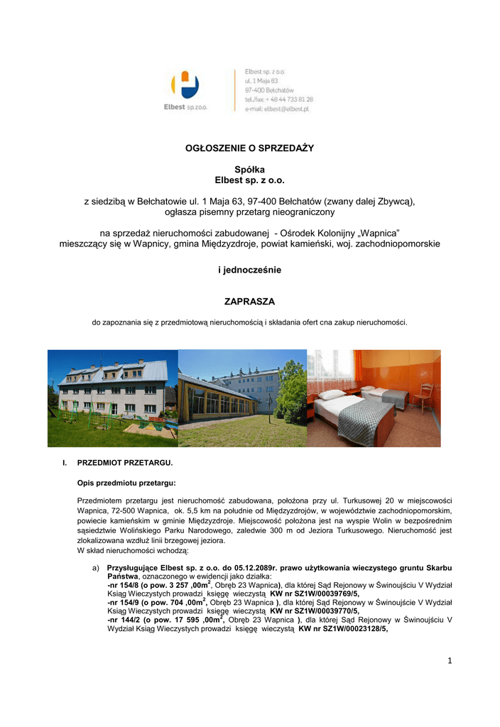 OGŁOSZENIE O SPRZEDAŻY Spółka Elbest sp. z o.o. z siedzibą w Bełchatowie ul. 1 Maja 63, 97-400 Bełchatów (zwany dalej Zbywcą), ogłasza pisemny przetarg nieograniczony na sprzedaż nieruchomości zabudowanej - Ośrodek Kolonijny „Wapnica” mieszczący się w Wapnicy, gmina Międzyzdroje, powiat kamieński, woj. zachodniopomorskie i jednocześnie ZAPRASZA do zapoznania się z przedmiotową nieruchomością i składania ofert cna zakup nieruchomości. I. PRZEDMIOT PRZETARGU. Opis przedmiotu przetargu: Przedmiotem przetargu jest nieruchomość zabudowana, położona przy ul. Turkusowej 20 w miejscowości Wapnica, 72-500 Wapnica, ok. 5,5 km na południe od Międzyzdrojów, w województwie zachodniopomorskim, powiecie kamieńskim w gminie Międzyzdroje. Miejscowość położona jest na wyspie Wolin w bezpośrednim sąsiedztwie Wolińskiego Parku Narodowego, zaledwie 300 m od Jeziora Turkusowego. Nieruchomość jest zlokalizowana wzdłuż linii brzegowej jeziora. W skład nieruchomości wchodzą: a) Przysługujące Elbest sp. z o.o. do 05.12.2089r. prawo użytkowania wieczystego gruntu Skarbu Państwa, oznaczonego w ewidencji jako działka: 2 -nr 154/8 (o pow. 3 257 ,00m , Obręb 23 Wapnica), dla której Sąd Rejonowy w Świnoujściu V Wydział Ksiąg Wieczystych prowadzi księgę wieczystą KW nr SZ1W/00039769/5, 2 -nr 154/9 (o pow. 704 ,00m , Obręb 23 Wapnica ), dla której Sąd Rejonowy w Świnoujście V Wydział Ksiąg Wieczystych prowadzi księgę wieczystą KW nr SZ1W/00039770/5, 2 -nr 144/2 (o pow. 17 595 ,00m , Obręb 23 Wapnica ), dla której Sąd Rejonowy w Świnoujściu V Wydział Ksiąg Wieczystych prowadzi księgę wieczystą KW nr SZ1W/00023128/5, 1 b) prawo własności budynku kolonijnego. Budynek kolonijny o powierzchni 941,45 m² wykonany jest w technologii tradycyjnej, fundamenty żelbetonowe. Stolarka okienna i drzwiowa typowa, ściany zewnętrzne piwnic – betonowe, o grubości 40 cm, nadziemia- z cegły ceramicznej pełnej i siporeksu o grubości 38 cm. c) prawo własności domu mieszkalnego. Dom, o powierzchni 228,90 m² wybudowany w technologii tradycyjnej o fundamentach żelbetonowych. Stolarka okienna i drzwiowa nietypowa. Ściany z cegły ceramicznej pełnej o grubości 51-38 cm. Dom mieszkalny połączony jest z budynkiem kolonijnym pomieszczeniem stołówki. W budynku kolonijnym znajdują się 104 miejsca noclegowe. Na terenie ośrodka znajduje się boisko do piłki nożnej oraz plac zabaw. Teren ośrodka jest częściowo zalesiony. Otoczenie nieruchomości stanowią tereny leśne, zbiorniki wodne oraz zabudowania. Bezpośredni dostęp do nieruchomości zapewniony jest przez drogę asfaltową, łączącą się w odległości ok. 4,5 km w kierunku wschodnim z drogą krajową nr 3, prowadzącą ze Szczecina do Świnoujścia. Ze względu na brak ogrzewania ośrodek funkcjonuje sezonowo tj. tylko w okresie letnim. Do dyspozycji gości znajduje się około 20 miejsc parkingowych. Wykaz wyposażenia udostępniony zostanie na pisemny wniosek Oferenta. Przeznaczenie w planie zagospodarowania przestrzennego. Dla nieruchomości objętej przetargiem nie obowiązuje plan zagospodarowania przestrzennego określający funkcję tego obszaru. Zgodnie z zapisami Studium Uwarunkowań i Kierunków Zagospodarowania Przestrzennego Gminy Międzyzdroje (Uchwała Nr LV/573/10 Rady Miejskiej w Międzyzdrojach z dnia 29 czerwca 2010 roku) przedmiotowa nieruchomość zlokalizowana jest na terenie oznaczonym na rysunku Studium symbolem „M” opisanym jako tereny o funkcji zabudowy mieszkaniowej jedno i wielorodzinnej oraz symbolem „UT” opisanym jako tereny o funkcji usługowej turystyki (pensjonaty, motele, ośrodki wypoczynkowe). Udział poszczególnych użytków w ogólnej powierzchni działek Lp. Nr działki Opis użytku Oznaczenie użytków Pow. użytku [ha] Pow. działki [ha] 1. 154/8 Inne tereny zabudowane 0.3257 0.3257 2. 154/9 144/2 0.0704 1.4923 0.0189 0.2483 2.1556 0.0704 3. Tereny mieszkaniowe Grunty rolne Inne tereny zabudowane Grunty zadrzewione Bi B RV Bi Lz RAZEM: 1.7595 2.1556 Ciężary i ograniczenia dotyczące nieruchomości: a) Nieruchomość jest dzierżawiona. Umowa dzierżawy zostanie rozwiązania i rozliczona przed zawarciem umowy przenoszącej własność Nieruchomości. b) Dzierżawcy przysługuje prawo pierwokupu. Nieruchomość jest wolna od obciążeń hipotecznych. II. CENA WYWOŁAWCZA NIERUCHOMOŚCI: Cena wywoławcza netto wynosi: 742.913,00 zł 2 Sprzedaż nieruchomości podlega opodatkowaniu podatkiem VAT wg. stawki właściwej dla przedmiotu transakcji. Oferowana cena zakupu netto nie powinna być niższa aniżeli cena wywoławcza. III. Warunkiem uczestnictwa w przetargu jest złożenie oferty zgodnie z „ Regulaminem sprzedaży nieruchomości „ELBEST” sp. z o.o.” ( załącznik nr 1 – wzór oferty), który dostępny jest na stronie internetowej www.elbest.pl Pisemne oferty w języku polskim należy składać w sekretariacie Elbest sp. z o.o., ul. 1 Maja 63 97-400 Bełchatów, w zabezpieczonych kopertach opatrzonych nazwą: >> sprzedaż nieruchomości: Ośrodek Kolonijny Wapnica << w nieprzekraczalnym terminie do dnia 29.04.2016r. godz. 11.00, decyduje data wpływu. Oferty zostaną otwarte dnia 29.04.2016r. o godz. 13.00 w siedzibie Spółki, przez Komisję Przetargową na posiedzeniu niejawnym. Termin związania ofertą wynosi 180 dni. IV. Za najkorzystniejszą ofertę zostanie uznana oferta zawierająca najwyższą cenę nabycia nieruchomości. Warunkiem zawarcia umowy przenoszącej prawo użytkowania wieczystego gruntu wraz z prawem własności budynków jest zatwierdzenie wyników przetargu przez Zarząd Spółki , uzyskanie wymaganej Umową Spółki zgody na transakcję odpowiednio Rady Nadzorczej lub Zgromadzenia Wspólników oraz nieskorzystanie przez Dzierżawcę z prawa pierwokupu. Uczestnik przetargu, wybrany jako nabywca nieruchomości zostanie zawiadomiony na piśmie o terminie i miejscu zawarcia umowy sprzedaży. Nabywca