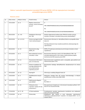 Zakres i warunki raportowania transakcji ETD przez KDPW_CCP do repozytorium transakcji prowadzonego przez KDPW. Historia zmian Lp. Data zmiany Miejsce zmiany Powód zmiany Zmiana 1 27.01.2014 str. 8 Błędnie umieszczona wartość „strona transakcji dla UR” Z: TRN: 000KDPW000E20140212PL0GF000466300000256S Na: TRN: 000KDPW000ES20140212PL0GF000466300000256 2 04.02.2014 str. 6-8 Dodatkowe informacje dot. TRN Dodanie algorytmów budowy kodu TRN dla transferu pozycji, transferu transakcji i transakcji historycznej („backloading”) 3 04.02.2014 str. 4, 12-13 Zmiana wymagań do NKK i kont rozliczeniowych Rozszerzenie informacji nt. identyfikacji klienta w przypadku braku kodu LEI. Wymóg podawania kraju rezydencji podmiotu zobowiązanego do raportowania. 4 04.02.2014 str. 15 Rozszerzenie usług KDPW_TR KDPW_TR wykonuje automatyczną terminację transakcji w dacie zapadalności. 5 07.02.2014 str. 6 Brak unikalności numeru transakcji z rynku Rozszerzenie informacji o polu 21-32 identyfikatora TRN - dla transakcji pakietowych w tym miejscu wykorzystywany będzie techniczny kod ISIN używany przez GPW 6 07.02.2014 str. 13 Rozszerzenie informacji o polu 2.9.3 (branża) Brak konieczności wypełnienia pola w przypadku, gdy podmiot jest niefinansowy (pole 2.9.4) 7 07.02.2014 str. 12 Zmiana w podejściu do wymogu podawania LEI przy przyjmowaniu raportów przez RT Rozszerzenie katalogu identyfikatorów akceptowanych do zmiany flagi 8 07.02.2014 str. 12 Wymóg RT Informacja o walidacji długości kodu LEI 9 13.02.2014 str. 3 Opublikowanie nowych Q&A Wskazanie nowego linku dla serwisu internetowego, w którym opublikowane zostały nowe Q&A ESMA 10 13.02.2014 str. 6 Zdefiniowanie długości pola MktRef Z: 8 Na: Maks. 8 11 13.02.2014 str. 10 Wskazanie stron raportów i kodów UTI dla scenariusza 3 Dla scenariusza 3 (raporty 11 i 12) stronami transakcji są Klient i CCP. Kod UTI ma rozszerzenie 005. 12 17.04.2014 str. 9 – 10 UTI dla transferów 13 17.04.2014 str. 14 Zmiana daty Przedstawienie sposobu raportowania transferów oraz nadawanie kodu UTI (rozszerzenie 006) Modyfikacja daty wejścia w życie obowiązku raportowania informacji o zabezpieczeniach i wycenie z 12 sierpnia 2014 r. na 11 sierpnia 2014 r. 1 14 17.04.2014 str. 14 Terminacja w RT Repozytorium przeprowadza terminację ISIN w t+1 15 02.05.2014 str. 14 Zmiana daty 16 20.05.2014 str. 14 Raportowanie zabezpieczeń klientów 17 05.06.2014 str. 13 - 14 Raportowanie zabezpieczeń klientów 18 05.06.2014 str. 15 19 20 18.07.2014 30.07.2014 str. 14 str. 14 21 29.10.2015 str.5-6 Raportowanie transakcji historycznych Korekta nazw statusów Zmiana terminu przyjmowania komunikatów o zabezpieczeniach klienckich Dostosowanie do level 2 validation Modyfikacja terminu udostępnienia struktury komunikatu służącego do przekazywania do KDPW_CCP informacji o zabezpieczeniach zdeponowanych u Uczestnika Rozliczającego przez jego klienta z czerwca br. na 19 maja br. Opis procesu przekazywania do KDPW_CCP informacji o zabezpieczeniach klientów wniesionych do Uczestników Rozliczających. Przekazywana ma być wartość zabezpieczeń klientów, a nie różnica między poziomem środków zdeponowanych u Uczestnika, a poziomem środków zdeponowanych w KDPW_CCP. Szczegółowa informacja o backloadingu dla transakcji aktywnych i nieaktywnych 12 lutego 2014 r. Zmiana nazwy statusu PEND na PACK, oraz statusu PACK na COMP Wszystkie komunikaty zawierające wartość zabezpieczeń klientów z dnia T, dostarczone do systemu kdpw_stream do godz. 7.30 w dniu T+1, zostaną przekazane w tym dniu do Repozytorium Transakcji KDPW_TR. 22 18.01.2017 str. 6 i 8 23 18.01.2017 str. 3 i 15 Redakcyjny błąd w przykładach TRN i UTI Zmiana rozporządzenia wykonawczego Komisji Europejskiej Dostosowanie algorytmu budowy TRN i UTI do VL2. Wskazanie nowego linku dla serwisu internetowego, w którym opublikowane zostały nowe Q&A ESMA Wykasowanie zer w przykładowych kodach TRN i UTI. Przesunięcie z 3 na 5 lat daty granicznej zaraportowania transakcji zawartych przed 16 sierpnia 2012 i obowiązujących w dniu 16 sierpnia 2012 oraz kontraktów zawartych w dniu lub po dniu 16 sierpnia 2012 r. od ‘Reporting Start Day’. 2 1. Obowiązek sprawozdawczy – informacje ogólne Rozporządzenie Parlamentu Europejskiego i Rady (UE) nr 648/2012 w sprawie instrumentów pochodnych będących przedmiotem obrotu poza rynkiem regulowanym, kontrahentów centralnych i repozytoriów transakcji ( EMIR) nakłada określone obowiązki sprawozdawcze na izby rozliczeniowe CCP i kontrahentów będących stroną transakcji pochodnych zarówno w obrocie zorganizowanym (ETD) jak i poza nim (OTC). a. Wejście w życie obowiązku raportowania Obowiązek raportowania transakcji pochodnych do repozytorium transakcji wszedł w życie z dniem 12 lutego 2014 r. (Reporting Start Day - RSD). Podmioty zobowiązane do raportowania transakcji pochodnych miały obowiązek backloadingu transakcji aktywnych w dniu wejścia w życie obowiązku raportowania, wg stanu na koniec dnia 11 lutego 2014 r., (możliwy był backloading pozycji wg stanu na koniec tego dnia). Jednocześnie obowiązek zaraportowania informacji o transakcjach aktywnych w dniu 16 sierpnia 2012 r. i aktywnych w dniu 12 lutego 2014 r., wymagał zgłoszenia ich do repozytorium transakcji w terminie 90 dni. Natomiast transakcje pochodne, które były aktywne w dniu 16 sierpnia 2012 r. i nie były aktywne w dniu 12 lutego 2014 r. wymagają zgłoszenia do repozytorium transakcji w terminie 5 lat. KDPW_CCP zaproponuje Uczestnikom Rozliczającym, a za ich pośrednictwem innym podmiotom zobowiązanym do raportowania, dodatkową usługę w zakresie raportowania transakcji historycznych. Obowiązek zgłaszania do repozytorium transakcji informacji o wycenie instrumentów pochodnych, jak również informacji o złożonych zabezpieczeniach był przedłużony o 180 dni (data startu: 11 sierpnia 2014 r.). b. Dokumentacja procesu raportowania Odpowiednie normy techni