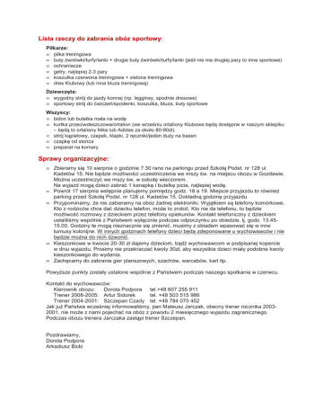 Lista rzeczy do zabrania obóz sportowy: Piłkarze: • piłka treningowa • buty żwirówki/turfy/lanki + drugie buty żwirówki/turfy/lanki (jeśli nie ma drugiej pary to inne sportowe) • ochraniacze • getry, najlepiej 2-3 pary • koszulka czerwona treningowa + zielona treningowa • dres Klubowy (lub inna bluza treningową) Dziewczęta: • wygodny strój do jazdy konnej (np. legginsy, spodnie dresowe) • sportowy strój do ćwiczeń/spodenki, koszulka, bluza, buty sportowe Wszyscy: • bidon lub butelka mała na wodę • kurtka przeciwdeszczowa/ortalion (we wrześniu ortaliony Klubowe będą dostępne w naszym sklepiku – będą to ortaliony Nike lub Adidas za około 80-90zł). • strój kąpielowy, czepek, klapki, 2 ręczniki/jeden duży na basen • czapkę od słońca • preparat na komary Sprawy organizacyjne: • • • • • Zbieramy się 10 sierpnia o godzinie 7.30 rano na parkingu przed Szkołą Podst. nr 128 ul. Kadetów 15. Nie będzie możliwości uczestniczenia we mszy św. na miejscu obozu w Gozdawie. Można uczestniczyć we mszy św. w sobotę wieczorem. Na wyjazd mogą dzieci zabrać 1 kanapkę i butelkę picia, najlepiej wodę. Powrót 17 sierpnia wstępnie planujemy pomiędzy godz. 18 a 19. Miejsce przyjazdu to również parking przed Szkołą Podst. nr 128 ul. Kadetów 15. Dokładną godzinę przyjazdu Przypominamy, że nie zabieramy na obóz żadnej elektroniki. Wyjątkiem są telefony komórkowe. Kto z rodziców chce dać dziecku telefon, może to zrobić. Kto nie da telefonu, to będzie możliwość rozmowy z dzieckiem przez telefony opiekunów. Kontakt telefoniczny z dzieckiem ustaliliśmy wspólnie z Państwem wyłącznie podczas odpoczynku po obiedzie, tj. godz. 13.4515.00. Godziny te mogą nieznacznie się zmienić, musimy z obiadem wpasować się w inne turnusy kolonijne. W innych godzinach telefony dzieci będą zdeponowane u wychowawców i nie będzie można do nich dzwonić. Kieszonkowe w kwocie 20-30 zł dajemy dzieciom, bądź wychowawcom w podpisanej kopercie w dniu wyjazdu. Prosimy nie przekraczać kwoty 30zł, aby wszystkie dzieci miały podobne kwoty kieszonkowego do wydania. Zachęcamy do zabrania gier planszowych, szachów, warcabów, kart itp. Powyższe punkty zostały ustalone wspólnie z Państwem podczas naszego spotkania w czerwcu. Kontakt do wychowawców: Kierownik obozu: Dorota Podpora tel.+48 607 255 911 Trener 2008-2005: Artur Sidorek tel. +48 503 515 986 Trener 2004-2001: Szczepan Czady tel. +48 784 070 452 Jak już Państwa wcześniej informowaliśmy, pan Mateusz Jarczak, obecny trener rocznika 20032001, nie może z nami pojechać na obóz z powodu 2 miesięcznego wyjazdu zagranicznego. Podczas obozu trenera Jarczaka zastąpi trener Szczepan. Pozdrawiamy, Dorota Podpora Arkadiusz Bicki