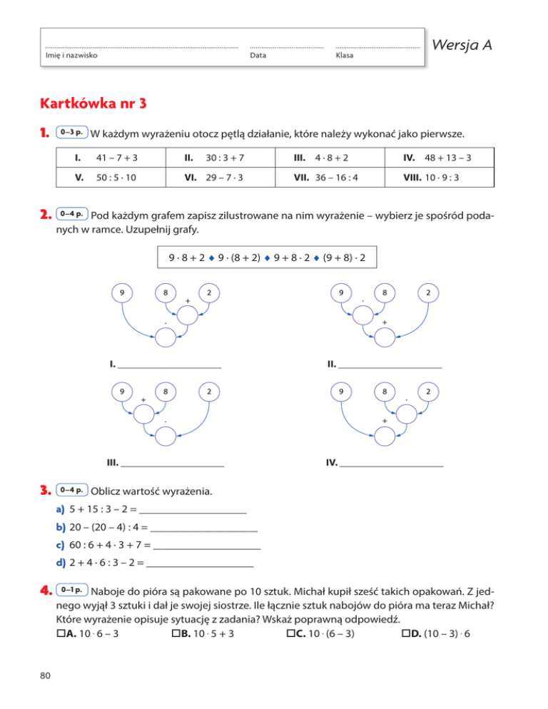 Imię i nazwisko Data Wersja A Klasa Kartkówka nr 3 1. 2. 0–3 p. W każdym wyrażeniu otocz pętlą działanie, które należy wykonać jako pierwsze. I. 41 – 7 + 3 II. 30 : 3 + 7 V. 50 : 5 · 10 VI. 29 – 7 · 3 III. 4 · 8 + 2 IV. 48 + 13 – 3 VII. 36 – 16 : 4 VIII. 10 · 9 : 3 0–4 p. Pod każdym grafem zapisz zilustrowane na nim wyrażenie – wybierz je spośród podanych w ramce. Uzupełnij grafy. 9 · 8 + 2 i 9 · (8 + 2) i 9 + 8 · 2 i (9 + 8) · 2 9 0–4 p. + 2 9 . 8 2 . + I. ____________________ II. ____________________ 9 3. 8 + 8 2 9 8 . 2 . + III. ____________________ IV. ____________________ Oblicz wartość wyrażenia. a) 5 + 15 : 3 – 2 = ___________________ b) 20 – (20 – 4) : 4 = ___________________ c) 60 : 6 + 4 · 3 + 7 = ___________________ d) 2 + 4 · 6 : 3 – 2 = ___________________ 4. 80 0–1 p. Naboje do pióra są pakowane po 10 sztuk. Michał kupił sześć takich opakowań. Z jednego wyjął 3 sztuki i dał je swojej siostrze. Ile łącznie sztuk nabojów do pióra ma teraz Michał? Które wyrażenie opisuje sytuację z zadania? Wskaż poprawną odpowiedź. A. 10 . 6 – 3 B. 10 . 5 + 3 C. 10 . (6 – 3) D. (10 – 3) . 6 Imię i nazwisko Data Wersja B Klasa Kartkówka nr 3 1. 2. 0–3 p. W każdym wyrażeniu otocz pętlą działanie, które należy wykonać jako pierwsze. I. 41 – 3 + 7 II. 7 + 30 : 3 V. 5 · 10 : 50 VI. 29 – 3 · 7 III. 2 + 4 · 8 IV. 13 – 3 + 48 VII. 36 : 4 – 6 VIII. 9 : 3 · 10 0–4 p. Pod każdym grafem zapisz zilustrowane na nim wyrażenie – wybierz je spośród podanych w ramce. Uzupełnij grafy. 7 · 5 + 3 i 7 · (5 + 3) i 7 + 5 · 3 i (7 + 5) · 3 7 0–4 p. + 3 7 . 5 3 . + I. ____________________ II. ____________________ 7 3. 5 + 5 3 7 5 . 3 . + III. ____________________ IV. ____________________ Oblicz wartość wyrażenia. a) 5 – 15 : 3 + 2 = ___________________ b) 20 + (20 + 4) : 4 = ___________________ c) 8 · 3 – 60 : 6 – 7 = ___________________ d) 8 + 3 · 6 : 9 – 8 = ___________________ 4. 0–1 p. Cukierki są pakowane w torebki po 10 sztuk. Maciek dostał na urodziny pięć takich opakowań – torebek. Z jednej wyjął 7 cukierków i dał je swojej siostrze. Ile łącznie cukierków ma teraz Maciek? Które wyrażenie opisuje sytuację z zadania? Wskaż poprawną odpowiedź. A. 10 . 5 – 7 B. 10 . 5 + 7 C. (7 – 5) . 10 D. (10 – 7) . 5 81 Odpowiedzi i schematy punktowania do kartkówek Poprawna odpowiedź Nr zad. Wersja A 1 I. II. III. IV. V. VI. VII. VIII. odejmowanie dzielenie mnożenie dodawanie dzielenie mnożenie dzielenie mnożenie 2 I. 9 · (8 + 2) 9 8 . I. II. III. IV. V. VI. VII. VIII. Wersja B Kartkówka nr 3 odejmowanie dzielenie mnożenie odejmowanie mnożenie mnożenie dzielenie dzielenie I. 7 · (5 + 3) – 2 7 5 10 . 90 . 72 8 2 7 . 35 + 17 5 + III. (7 + 5) · 3 8 2 7 + 12 . 5 36 IV. 9 + 8 · 2 IV. 7 + 5 · 3 8 + . 2 7 16 3 . 34 9 3 38 III. (9 + 8) · 2 + 8 II. 7 · 5 + 3 74 9 3 Za poprawne zaznaczenia działania twe wszystkich przykładach – 3 punkty, ttylko w 6 lub 7 przykładach – 2 punkty, ttylko w 3, 4 lub 5 przykładach – 1 punkt, tw mniej niż 3 przykładach – 0 punktów. Za każdy poprawnie wykonany przykład – 1 punkt. 56 II. 9 · 8 + 2 9 + Zasady punktowania 5 + . 3 15 25 22 3 a) 8, b) 16, c) 29, d) 8 a) 2, b) 26, c) 7, d) 2 4 A A Za każdy poprawnie wykonany przykład – 1 punkt. Za wskazanie poprawnej odpowiedzi – 1 punkt. 111