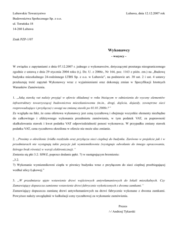 Lubawskie Towarzystwo Lubawa, dnia 12.12.2007 rok Budownictwa Społecznego Sp. z o.o. ul. Toruńska 18 14-260 Lubawa Znak PZP-1/07 Wykonawcy - wszyscy W związku z zapytaniami z dnia 07.12.2007 r. jednego z wykonawców, dotyczącymi przetargu nieograniczonego zgodnie z ustawą z dnia 29 stycznia 2004 roku (t.j. Dz. U. z 2006r., Nr 164, poz. 1163 z późn. zm.) na „Budowę budynku mieszkalnego 24-rodzinnego LTBS Sp. z o.o. w Lubawie”, na podstawie art. 38 ust. 2 i ust. 4 ustawy przekazuję treść zapytań Wykonawcy wraz z wyjaśnieniami oraz dokonuję zmian w Specyfikacji Istotnych Warunków Zamówienia. 1. „Jaką stawkę vat należy przyjąć w ofercie składanej w roku bieżącym w odniesieniu do wyceny elementów infrastruktury towarzyszącej budownictwu mieszkaniowemu (m.in., drogi, dojścia, dojazdy, zewnętrzne sieci rozprowadzające i przyłącza) z uwagi na zmianę stawki po 01.01.2008r.?” Ze względu na fakt, że cena ofertowa wykonawcy jest ceną ryczałtową i obejmuje wszystkie elementy niezbędne do całkowitego i efektywnego wykonania przedmiotu zamówienia, w tym podatek VAT, za poprawność skalkulowania stawek i kwot podatku VAT odpowiedzialność ponosi wykonawca. W przypadku zmiany stawek podatku VAT, cena ryczałtowa określona w ofercie nie może ulec zmianie. 2. „Prosimy o określenie źródła rozdziału oraz przyłącza sieci cieplnej do budynku. Zarówno w projekcie jak i w przedmiarach nie występują takie pozycje jak wymiennikownia (występuje odwołanie do innego opracowania, którego brak również w wersji elektronicznej).” Zmienia się pkt 3.2. SIWZ, poprzez dodanie ppkt. 7) w następującym brzmieniu: „3.2. 7) Wykonanie wymiennikowni ciepła w piwnicy budynku wraz z przyłączem do sieci cieplnej przebiegającej wzdłuż ulicy Łąkowej.” 3. „W przedmiarze ujęto wstawienie drzwi wejściowych antywłamaniowych do lokali mieszkalnych. Czy Zamawiający dopuszcza zamienne wstawienie drzwi fabrycznie wykończonych z dwoma zamkami.” Zamawiający dopuszcza zamianę drzwi antywłamaniowych na drzwi fabrycznie wykonane z dwoma zamkami. Powyższe należy uwzględnić w kalkulacji ceny ryczałtowej za wykonanie zamówienia. Prezes /-/ Andrzej Tykarski