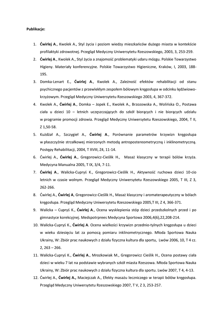 Publikacje: 1. Ćwirlej A., Kwolek A., Styl życia i poziom wiedzy mieszkańców dużego miasta w kontekście profilaktyki zdrowotnej. Przegląd Medyczny Uniwersytetu Rzeszowskiego, 2003, 3, 253-259. 2. Ćwirlej A., Kwolek A., Styl życia a znajomość problematyki udaru mózgu. Polskie Towarzystwo Higieny. Materiały konferencyjne. Polskie Towarzystwo Higieniczne, Kraków, I, 2003, 188195. 3. Domka-Lenart E., Ćwirlej A., Kwolek A., Zależność efektów rehabilitacji od stanu psychicznego pacjentów z przewlekłym zespołem bólowym kręgosłupa w odcinku lędźwiowokrzyżowym. Przegląd Medyczny Uniwersytetu Rzeszowskiego 2003, 4, 367-372. 4. Kwolek A., Ćwirlej A., Domka – Jopek E., Kwolek A., Brzozowska A., Wolińska O., Postawa ciała u dzieci 10 – letnich uczęszczających do szkół biorących i nie biorących udziału w programie promocji zdrowia. Przegląd Medyczny Uniwersytetu Rzeszowskiego, 2004, T II, Z 1,50-58. 5. Kużdżał A., Szczygieł A., Ćwirlej A., Porównanie parametrów krzywizn kręgosłupa w płaszczyźnie strzałkowej mierzonych metodą antropostereometryczną i inklinometryczną. Postępy Rehabilitacji, 2004, T XVIII, Z4, 11-14. 6. Ćwirlej A., Ćwirlej A., Gregorowicz-Cieślik H., Masaż klasyczny w terapii bólów krzyża. Medycyna Manualna 2005, T IX, 3/4, 7-11. 7. Ćwirlej A., Walicka-Cupryś K., Gregorowicz-Cieślik H., Aktywność ruchowa dzieci 10-cio letnich w czasie wolnym. Przegląd Medyczny Uniwersytetu Rzeszowskiego 2005, T III, Z 3, 262-266. 8. Ćwirlej A., Ćwirlej A, Gregorowicz-Cieślik H., Masaż klasyczny i aromaterapeutyczny w bólach kręgosłupa. Przegląd Medyczny Uniwersytetu Rzeszowskiego 2005,T III, Z 4, 366-371. 9. Walicka – Cupryś K., Ćwirlej A., Ocena wysklepienia stóp dzieci przedszkolnych przed i po gimnastyce korekcyjnej. Medspotrprees Medycyna Sportowa 2006,4(6),22,208-214. 10. Walicka-Cupryś K., Ćwirlej A. Ocena wielkości krzywizn przednio-tylnych kręgosłupa u dzieci w wieku dziesięciu lat za pomocą pomiaru inklinometrycznego. Młoda Sportowa Nauka Ukrainy, W: Zbiór prac naukowych z działu fizyczna kultura dla sportu, Lwów 2006, 10, T 4 cz. 2, 263 – 266. 11. Walicka-Cupryś K., Ćwirlej A., Mrozkowiak M., Gregorowicz Cieślik H., Ocena postawy ciała dzieci w wieku 7 lat na podstawie wybranych szkół miasta Rzeszowa. Młoda Sportowa Nauka Ukrainy, W: Zbiór prac naukowych z działu fizyczna kultura dla sportu. Lwów 2007, T 4, 4-13. 12. Ćwirlej A., Ćwirlej A., Maciejczak A., Efekty masażu leczniczego w terapii bólów kręgosłupa. Przegląd Medyczny Uniwersytetu Rzeszowskiego 2007, T V, Z 3, 253-257. 13. Ćwirlej A., Domka-Jopek E., Walicka-Cupryś K., Wilmowska-Pietruszyńska A., Problem rehabilitacji pacjentów z przewlekłym bólem dolnego odcinka kręgosłupa, Przegląd Medyczny Uniwersytetu Rzeszowskiego 2007, 4, 355-359. 14. Stach A., Walicka-Cupryś K., Ćwirlej A. Gimnastyka korekcyjna a wady postawy w obrębie tułowia dzieci w wieku przedszkolnym. Zdrowie Publiczne, 2007,4. 15. Ćwirlej A., Wilmowska-Pietruszyńska A., Znaczenie aktywności fizycznej w profilaktyce osteoporozy, Przegląd Medyczny Uniwersytetu Rzeszowskiego 2008, 1. 16. Ćwirlej A., Kużdżał A. Diagnostyka obrazowa osteoporozy oraz ocena ryzyka złamania. Wydawnictwo Forum, Skuteczna Rehabilitacja: Wydawnictwo Forum, Skuteczna Rehabilitacja 2009, Nr.3: 4-7, Poznań. 17. Ćwirlej A., Kużdżał A. Dieta i leczenie farmakologiczne osteoporozy. Wydawnictwo Forum, Skuteczna Rehabilitacja: Wydawnictwo Forum, Skuteczna Rehabilitacja 2009, Nr.3: 8-11, Poznań. 18. Ćwirlej A., Kużdżał A., Rehabilitacja w osteoporozie. W: Kużdżał A. (red.), Atlas Rehabilitacji Ruchowej. Zestawy praktycznych ćwiczeń dla pacjentów ze schorzeniami kręgosłupa, kończyn oraz stawów, Atlas Rehabilitacji Ruchowej Forum 2009, Poznań, rozdz.6: 6/4. 19. Kużdżał A., Gancarz W., Ridan T., Walicka – Cupryś K., Ćwirlej A., „Najczęstsze przyczyny oraz typy uszkodzenia stawu barkowego wśród piłkarzy ręcznych oraz ich konsekwencje psycho – fizyczne”, Yong Sport Science of Ukraine 2010, 14, 1, 170 – 175. 20. Walicka – Cupryś K., Ćwirlej A., Kużdżał A., Zawadzka D., „Aktywność ruchowa młodzieży z terenów wiejskich i małych miast”, Yong Sport Science of Ukraine, 2010, 14, 2, 32 – 39. 21. Ćwirlej A., Walicka – Cupryś K., Kużdżał A., „Ocena wpływu trybu życia na sprawność fizyczną kobiet po menopauzie”, Yong Sport Science of Ukraine, 2010, 14, 4, 171 -178. 22. Ćwirlej A.,Wilmowska A., „Ocena wpływu systematycznej aktywności fizycznej na jakość życia kobiet po menopauzie”, Yong Sport Science of Ukraine, 2010, 14, 4, 179- 185. 23. Walicka – Cupryś K, Ćwirlej – Sozańska A., Adamiak J., „Determinanty postawy ciała w obrębie kończyn dolnych”, Yong Sport Science of Ukraine, 2011, T.3, 58-64. 24. Ćwirlej – Sozańska A. „Ocena ryzyka złamań osteoporotycznych” (Assessment of the risk of osteoporotic fractures), Przegląd Medyczny Uniwersytetu Rzeszowskiego i Narodowego Instytutu Leków w Warszawie, 2013, 4, 515-524. 25. Ćwirlej – Sozańska A. „Aktywność fizyczna a stan zdrowia osób starszych” (Physical activity and health status of the elderly), Przegląd Medyczny Uniwersytetu Rzeszowskiego i Narodowego Instytutu Leków w Warszawie, 2014, 2, 173–181. 26. Zaborniak – Sobczak M., Walicka – Cupryś K., Ćwirlej – Sozanska A., Drzał – Grabiec J., Truszczyńska A. „Kompetencje społeczne fizjoterapeutów – wyniki badan pilotażowych”, Postępy rehabilitacji, 2014, Tom 28 Nr 2. 27. Wiśniowska A, Ćwirlej-Sozańska A. Styl życia a występowanie dolegliwości bólowych w odcinku lędźwiowo-krzyżowym u osób w wieku 40-50 lat, Badania Naukowe red. Teresa Pop 2014, 318-328. 28. Ćwirlej-Sozańska A. „Wpływ trybu życia na występowanie ograniczeń ruchu i dolegliwości bólowych stawów obwodowych u kobiet po 50 roku życia”, Przegląd Medyczny Uniwersyte