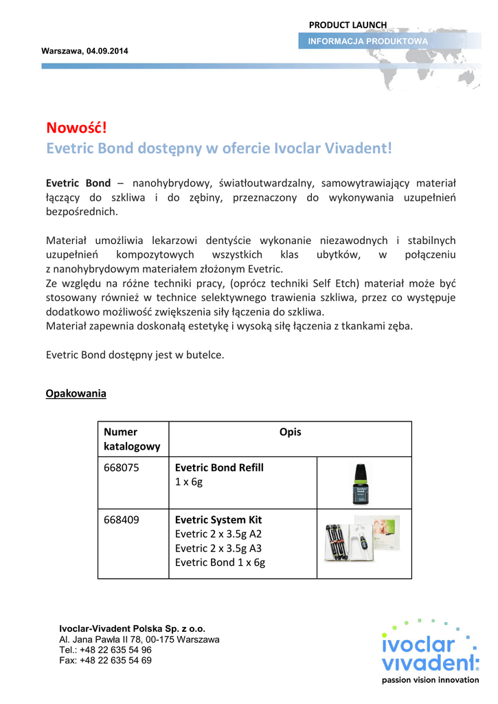 PRODUCT LAUNCH INFORMACJA PRODUKTOWA Warszawa, 04.09.2014 Nowość! Evetric Bond dostępny w ofercie Ivoclar Vivadent! Evetric Bond – nanohybrydowy, światłoutwardzalny, samowytrawiający materiał łączący do szkliwa i do zębiny, przeznaczony do wykonywania uzupełnień bezpośrednich. Materiał umożliwia lekarzowi dentyście wykonanie niezawodnych i stabilnych uzupełnień kompozytowych wszystkich klas ubytków, w połączeniu z nanohybrydowym materiałem złożonym Evetric. Ze względu na różne techniki pracy, (oprócz techniki Self Etch) materiał może być stosowany również w technice selektywnego trawienia szkliwa, przez co występuje dodatkowo możliwość zwiększenia siły łączenia do szkliwa. Materiał zapewnia doskonałą estetykę i wysoką siłę łączenia z tkankami zęba. Evetric Bond dostępny jest w butelce. Opakowania Numer katalogowy Opis 668075 Evetric Bond Refill 1 x 6g 668409 Evetric System Kit Evetric 2 x 3.5g A2 Evetric 2 x 3.5g A3 Evetric Bond 1 x 6g Ivoclar-Vivadent Polska Sp. z o.o. Al. Jana Pawła II 78, 00-175 Warszawa Tel.: +48 22 635 54 96 Fax: +48 22 635 54 69