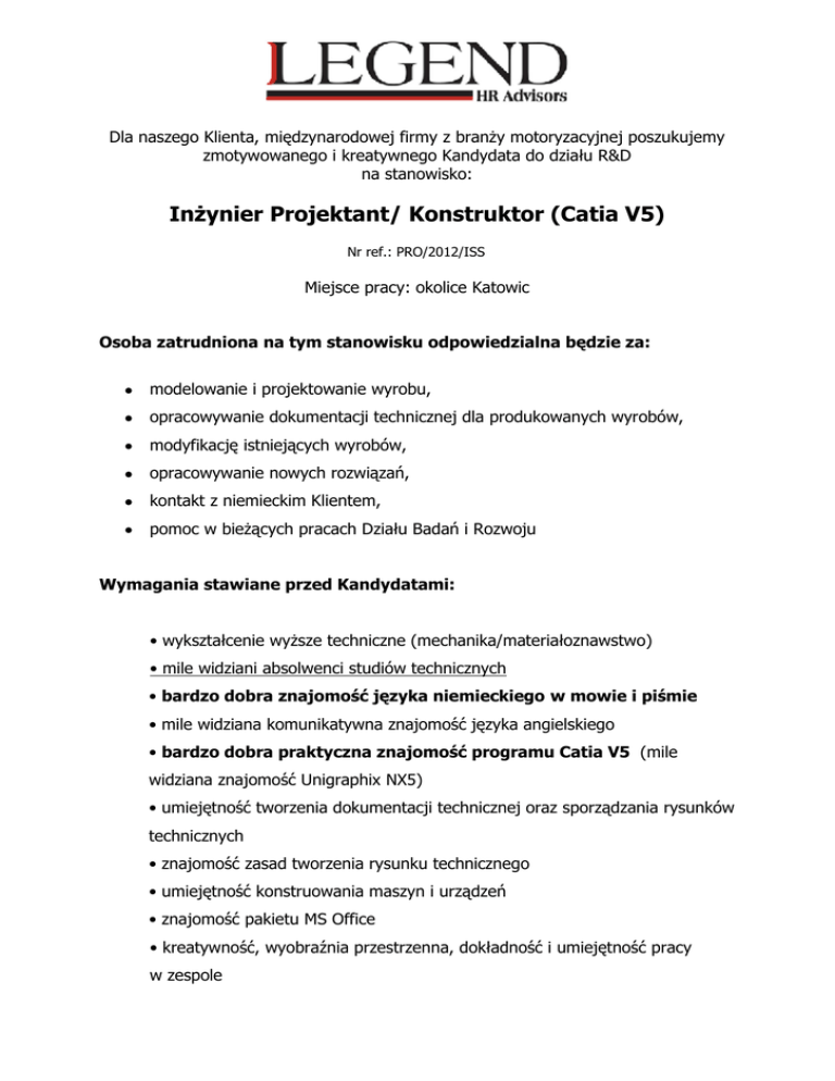 Dla naszego Klienta, międzynarodowej firmy z branży motoryzacyjnej poszukujemy zmotywowanego i kreatywnego Kandydata do działu R&D na stanowisko: Inżynier Projektant/ Konstruktor (Catia V5) Nr ref.: PRO/2012/ISS Miejsce pracy: okolice Katowic Osoba zatrudniona na tym stanowisku odpowiedzialna będzie za: modelowanie i projektowanie wyrobu, opracowywanie dokumentacji technicznej dla produkowanych wyrobów, modyfikację istniejących wyrobów, opracowywanie nowych rozwiązań, kontakt z niemieckim Klientem, pomoc w bieżących pracach Działu Badań i Rozwoju Wymagania stawiane przed Kandydatami: • wykształcenie wyższe techniczne (mechanika/materiałoznawstwo) • mile widziani absolwenci studiów technicznych • bardzo dobra znajomość języka niemieckiego w mowie i piśmie • mile widziana komunikatywna znajomość języka angielskiego • bardzo dobra praktyczna znajomość programu Catia V5 (mile widziana znajomość Unigraphix NX5) • umiejętność tworzenia dokumentacji technicznej oraz sporządzania rysunków technicznych • znajomość zasad tworzenia rysunku technicznego • umiejętność konstruowania maszyn i urządzeń • znajomość pakietu MS Office • kreatywność, wyobraźnia przestrzenna, dokładność i umiejętność pracy w zespole Nasz Klient oferuje: • stabilne zatrudnienie na podstawie umowy o pracę • możliwość rozwoju w międzynarodowym środowisku • możliwość zdobycia cennego doświadczenia w firmie o ugruntowanej pozycji na rynku motoryzacyjnym Osoby zainteresowane i spełniające powyższe wymagania prosimy o przesłanie CV w języku polskim oraz niemieckim wraz z zaznaczonym numerem referencyjnym na adres: [email protected] Na zgłoszeniach prosimy o umieszczenie klauzuli o następującej treści: „Wyrażam zgodę na przetwarzanie moich danych osobowych dla potrzeb niezbędnych do realizacji procesu rekrutacji zgodnie z Ustawą o Ochronie Danych Osobowych z dnia 29 sierpnia 1997 r., Nr 133, poz. 883". Uprzejmie informujemy, że skontaktujemy się tylko z wybranymi Kandydatami.