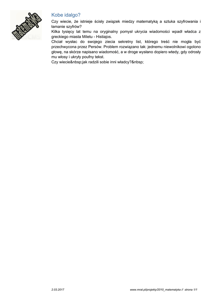 Kobe idalgo? Czy wiecie, że istnieje ścisły związek miedzy matematyką a sztuka szyfrowania i łamanie szyfrów? Kilka tysięcy lat temu na oryginalny pomysł ukrycia wiadomości wpadł władca z greckiego miasta Miletu - Histiajos. Chciał wysłac do swojego ziecia sekretny list, którego treść nie mogła być przechwycona przez Persów. Problem rozwiązano tak: jednemu niewolnikowi ogolono głowę, na skórze napisano wiadomość, a w droge wysłano dopiero wtedy, gdy odrosły mu włosy i ukryły poufny tekst. Czy wiecie jak radzili sobie inni władcy?  2.03.2017 www.mrat.pl/projekty/2010_matematyka // strona 1/1