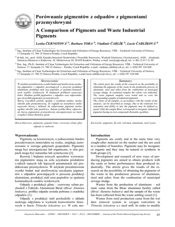 Porównanie pigmentów z odpadów z pigmentami przemysłowymi A Comparison of Pigments and Waste Industrial Pigments Lenka ČERNOTOVÁ 1), Barbara TORA 2), Vladimir ČABLÍK 3), Lucie ČABLÍKOVÁ 4) _________________________ 1) Ing.; Institute of Clean Technologies for Extraction and Utilization of Energy Resources, VŠB – Technical University of Ostrava, 17.listopadu 15, 708 33 Ostrava-Poruba, Czech Republic 2) dr hab. inż., prof. AGH; Katedra Inżynierii Środowiska i Przeróbki Surowców, Wydział Górnictwa i Geoinżynierii, AGH – Akademia Górniczo-Hutnicza w Krakowie, Al. Mickiewicza 30, 30-059 Kraków, Polska; e-mail: [email protected], tel.: (+48) 12 617 21 89 3) Doc. Ing., Ph.D.; Institute of Clean Technologies for Extraction and Utilization of Energy Resources, VŠB – Technical University of Ostrava, 17. listopadu 15, 708 33 Ostrava – Poruba, Czech Republic, e-mail: [email protected], tel.: (+420) 597 324 040 4) Ing.; Institute of Clean Technologies for Extraction and Utilization of Energy Resources, VŠB – Technical University of Ostrava, 17.listopadu 15, 708 33 Ostrava-Poruba, Czech Republic, e-mail [email protected], tel.: (+420) 597 324 040 Streszczenie Summary W artykule przedstawiono wyniki badań nad możliwością uzyskania pigmentów z odpadów powstających w procesie produkcji aluminium, produkcji stali oraz popiołów ze spalania komunalnych osadów ściekowych. W badanych próbkach oznaczono kolor. Zbadano próbki pigmentów z odpadów oraz odpowiadające im próbki pigmentów przemysłowych. Barwę wszystkich próbek, zgodnie z wynikami analizy, można określić jako pomarańczową. Ze względu na stosunkowo niskie nasycenie barwą i zdolność do zabarwiania pigmenty można ogólnie określić jako pastelowe. Jedynie próbka Birac odpowiada barwą pigmentom przemysłowym nieorganicznym na bazie związków żelaza (hematyt, getyt). The article gives the results of the research on the possibility of obtaining the pigments of the waste in the production process of aluminum, steel and ashes from the combustion of municipal sewage sludge. In examined samples the colour was indicated. The waste pigment samples were tested and so were the corresponding samples of industrial pigments. The colour of all samples, in accordance with the results of the analysis, can be described as orange. Due to the relatively low saturation and ability to tint, the pigments may be defined as pastel. Only the sample Birac corresponds to inorganic industrial pigments basing on iron compounds (hematite, goethite). Słowa kluczowe: pigmenty, popioły lotne, czerwony szlam, glin, odpady ze stalowni Keywords: pigments, fly ash, red mud, aluminum, steel waste Wprowadzenie Introduction Pigmenty są kosztownym, a jednocześnie bardzo poszukiwanym materiałem na rynku, znajdują zastosowanie w szeregu gałęziach gospodarki. Pigmenty moga być nieorganiczne lub organiczne, w obu grupach moga być naturalne lub syntetyczne [2]. Rozwój i badania nowych sposobów wytwarzania pigmentów mają na celu uzyskanie produktów o takich samych lub lepszych parametrach niż produkowane przemysłowio. W artykule przedstawiono wyniki badań nad możliwością uzyskania pigmentów z odpadów powstających w procesie produkcji aluminium, produkcji stali oraz popiołów ze spalania komunalnych osadów ściekowych. Odpady z produkcji glinu – czerwony szlam pochodził z Fabryki Aluminium Birač (Birač Alumina Industry), próbka odpadu została pobrana z osadnika odpadów [1]. Odpady z produkcji stali pochodziły z układu mokrego odpylania w wydziale konwertorów tlenowych w hucie Třinecke železárny a.s. W celu mo- Pigments are costly and at the same time very sought-after material on the market and the are used in a number of branches. Pigments may be inorganic or organic and they may be natural or synthetic in both groups [2]. Development and research of new ways of producing pigments are aimed to obtain products with the same or better performances than produced industrially. The article gives the results of the research on the possibility of obtaining the pigments of the waste in the production process of aluminum, steel and ashes from the combustion of municipal sewage sludge. Wastes from the production of aluminum – red mud, came from the Birac aluminum facility called (Birač Alumina Industry) and the sample of the waste has been collected from the waste settling vessel [1]. Wastes from steel production came from the wet dust removal system in oxygen converters in Třinecke železárny a.s steel mill. In order to modify Inżynieria Mineralna — LIPIEC – GRUDZIEŃ < 2012 > JULY – DECEMBER — Journal of the Polish Mineral Engineering Society 65 dyfikacji właściowości fizykochemicznych tych odpadów zastosowano metody przeróbcze: mielenie, regulacje pH, kalcynowanie w temperaturze 650°C i 850°C, ługowanie bakteryjne) [3]. Popiół lotny ze spalania osadów ściekowych, pochodził ze spalarni osadów ściekowych w Krakowie. Osady są spalane w temperaturze 850°C. Przygotowania próbki pigmrntów polegało na zmieleniu do uziarnienia poniżej 2μm w młynie wibracyjnym. Analiza właściwości optycznych sproszkowanych pigmentów oraz próbek pigmentów przemysłowych została przeprowadzona w firmie Precheza Přerov sp z o.o. W celu porównania właściwości pigmentów z odpadów z pigmentami przemysłowymi przygotowano panele na które nakładano farby z badanymi pigmentami, posługując sie technikami stosowanymi w restauracji malarstwa. physical-chemical properties of those wastes the processing methods were used: grinding, pH regulation, calcination at 650°C and 850°C, bacterial leaching [3]. Fly ash from sewage sludge combustion came from sewage sludge incineration plant in Krakow. Wastes are burned in temperature of 850°C. Preparation of the pigment sample was based on grinding the grains to size below 2 μm in vibration mill. Analysis of optical properties of powdered p