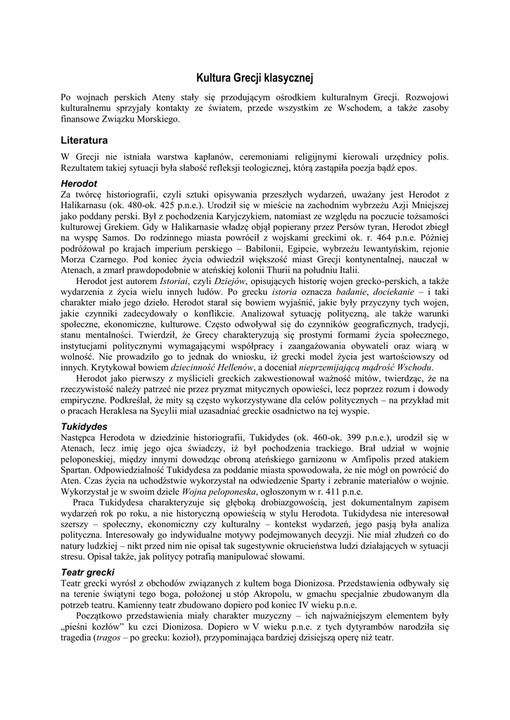 Kultura Grecji klasycznej Po wojnach perskich Ateny stały się przodującym ośrodkiem kulturalnym Grecji. Rozwojowi kulturalnemu sprzyjały kontakty ze światem, przede wszystkim ze Wschodem, a także zasoby finansowe Związku Morskiego. Literatura W Grecji nie istniała warstwa kapłanów, ceremoniami religijnymi kierowali urzędnicy polis. Rezultatem takiej sytuacji była słabość refleksji teologicznej, którą zastąpiła poezja bądź epos. Herodot Za twórcę historiografii, czyli sztuki opisywania przeszłych wydarzeń, uważany jest Herodot z Halikarnasu (ok. 480-ok. 425 p.n.e.). Urodził się w mieście na zachodnim wybrzeżu Azji Mniejszej jako poddany perski. Był z pochodzenia Karyjczykiem, natomiast ze względu na poczucie tożsamości kulturowej Grekiem. Gdy w Halikarnasie władzę objął popierany przez Persów tyran, Herodot zbiegł na wyspę Samos. Do rodzinnego miasta powrócił z wojskami greckimi ok. r. 464 p.n.e. Później podróżował po krajach imperium perskiego – Babilonii, Egipcie, wybrzeżu lewantyńskim, rejonie Morza Czarnego. Pod koniec życia odwiedził większość miast Grecji kontynentalnej, nauczał w Atenach, a zmarł prawdopodobnie w ateńskiej kolonii Thurii na południu Italii. Herodot jest autorem Istoriai, czyli Dziejów, opisujących historię wojen grecko-perskich, a także wydarzenia z życia wielu innych ludów. Po grecku istoria oznacza badanie, dociekanie – i taki charakter miało jego dzieło. Herodot starał się bowiem wyjaśnić, jakie były przyczyny tych wojen, jakie czynniki zadecydowały o konflikcie. Analizował sytuację polityczną, ale także warunki społeczne, ekonomiczne, kulturowe. Często odwoływał się do czynników geograficznych, tradycji, stanu mentalności. Twierdził, że Grecy charakteryzują się prostymi formami życia społecznego, instytucjami politycznymi wymagającymi współpracy i zaangażowania obywateli oraz wiarą w wolność. Nie prowadziło go to jednak do wniosku, iż grecki model życia jest wartościowszy od innych. Krytykował bowiem dziecinność Hellenów, a doceniał nieprzemijającą mądrość Wschodu. Herodot jako pierwszy z myślicieli greckich zakwestionował ważność mitów, twierdząc, że na rzeczywistość należy patrzeć nie przez pryzmat mitycznych opowieści, lecz poprzez rozum i dowody empiryczne. Podkreślał, że mity są często wykorzystywane dla celów politycznych – na przykład mit o pracach Heraklesa na Sycylii miał uzasadniać greckie osadnictwo na tej wyspie. Tukidydes Następca Herodota w dziedzinie historiografii, Tukidydes (ok. 460-ok. 399 p.n.e.), urodził się w Atenach, lecz imię jego ojca świadczy, iż był pochodzenia trackiego. Brał udział w wojnie peloponeskiej, między innymi dowodząc obroną ateńskiego garnizonu w Amfipolis przed atakiem Spartan. Odpowiedzialność Tukidydesa za poddanie miasta spowodowała, że nie mógł on powrócić do Aten. Czas życia na uchodźstwie wykorzystał na odwiedzenie Sparty i zebranie materiałów o wojnie. Wykorzystał je w swoim dziele Wojna peloponeska, ogłoszonym w r. 411 p.n.e. Praca Tukidydesa charakteryzuje się głęboką drobiazgowością, jest dokumentalnym zapisem wydarzeń rok po roku, a nie historyczną opowieścią w stylu Herodota. Tukidydesa nie interesował szerszy – społeczny, ekonomiczny czy kulturalny – kontekst wydarzeń, jego pasją była analiza polityczna. Interesowały go indywidualne motywy podejmowanych decyzji. Nie miał złudzeń co do natury ludzkiej – nikt przed nim nie opisał tak sugestywnie okrucieństwa ludzi działających w sytuacji stresu. Opisał także, jak politycy potrafią manipulować słowami. Teatr grecki Teatr grecki wyrósł z obchodów związanych z kultem boga Dionizosa. Przedstawienia odbywały się na terenie świątyni tego boga, położonej u stóp Akropolu, w gmachu specjalnie zbudowanym dla potrzeb teatru. Kamienny teatr zbudowano dopiero pod koniec IV wieku p.n.e. Początkowo przedstawienia miały charakter muzyczny – ich najważniejszym elementem były „pieśni kozłów” ku czci Dionizosa. Dopiero w V wieku p.n.e. z tych dytyrambów narodziła się tragedia (tragos – po grecku: kozioł), przypominająca bardziej dzisiejszą operę niż teatr. Ajschylos, Sofokles, Eurypides, Arystofanes Wielcy twórcy tragedii greckiej tematykę swych utworów czerpali z mitologii, koncentrując się na problematyce moralnej. Ajschylos (525-450 p.n.e.) był piewcą demokracji ateńskiej. Sofokles (496406 p.n.e.) przedstawiał silne charaktery ludzkie (Antygona, Elektra, Edyp), jako pierwszy wprowadził barwną scenografię stwarzającą wrażenie przestrzeni trójwymiarowej. Eurypides (485406 p.n.e.) jako pierwszy wprowadził do teatru wątek miłosny, również jako pierwszy krytykował postępowanie bogów. W jego spektaklach pojawił się po raz pierwszy śpiew solowy. Twórca komedii, Arystofanes (445-383 p.n.e.), kpił z przywódców politycznych, krytykował wady ustroju demokratycznego. Był rzecznikiem warstw ludowych, natomiast ośmieszał bogatych mieszkańców Aten, zarzucając im bezwzględność i skąpstwo. Rzeźba i malarstwo Fidiasz (500-438 p.n.e.), największy rzeźbiarz starożytności, wykonał m.in. posągi Zeusa Olimpijskiego, Ateny Partenos, Ateny Promachos. Stosował technikę chryzelefantyny, czyli łączenia złota z kością słoniową. Jego rzeźby charakteryzowały się majestatycznym wyglądem. Myron był autorem rzeźb z brązu, m.in. Dyskobola. Charakteryzowały się one dużym dynamizmem, przedstawiały chwilowe napięcie mięśni i ruch ciała. Poliktet opracował idealny model ciała ludzkiego. Przedstawiał ludzi w sposób wyidealizowany. Był twórcą posągów Amazonek, Doryfora – młodzieńca niosącego włócznię – czy Diadumenosa – młodzieńca z opaską na czole. Polignot z Tazos był autorem fresków, w których do używanych przedtem kolorów – białego, czarnego i czerwonego – dodał zielony. Apol