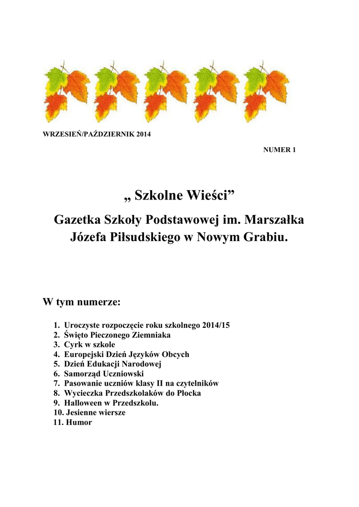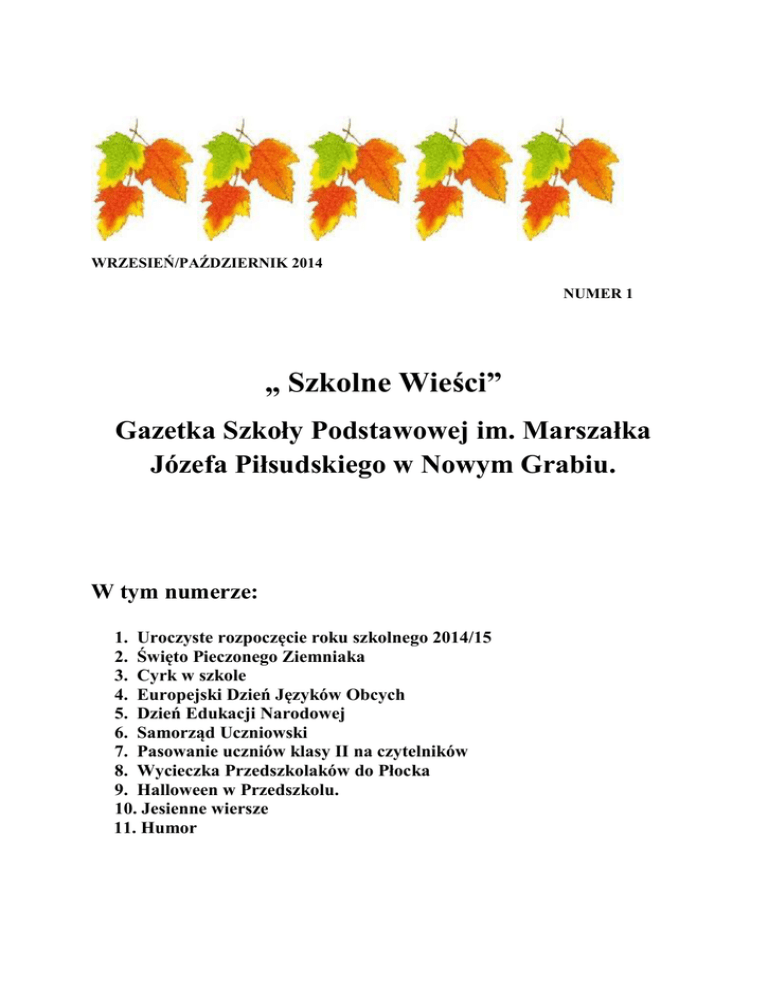 WRZESIEŃ/PAŹDZIERNIK 2014 NUMER 1 „ Szkolne Wieści” Gazetka Szkoły Podstawowej im. Marszałka Józefa Piłsudskiego w Nowym Grabiu. W tym numerze: 1. Uroczyste rozpoczęcie roku szkolnego 2014/15 2. Święto Pieczonego Ziemniaka 3. Cyrk w szkole 4. Europejski Dzień Języków Obcych 5. Dzień Edukacji Narodowej 6. Samorząd Uczniowski 7. Pasowanie uczniów klasy II na czytelników 8. Wycieczka Przedszkolaków do Płocka 9. Halloween w Przedszkolu. 10. Jesienne wiersze 11. Humor Powody, dla których warto wrócić do szkoły 1. Nareszcie masz komu pochwalić się opalenizną, nową fryzurą i ubraniami. Kto bardziej doceni takie zmiany, jeśli nie koleżanki, nie widziały cię dwa miesiące? 2. Może akurat w tym roku obudzi się w tobie Ma-ria Skłodowska-Curie albo odkryjesz, że jesteś kobiecym wcieleniem Einsteina. 3. Od września na nowo życie towarzyskie: szkolne imprezy, klasowe prywatki, imieniny i cała masa spotkań bez żadnej okazji. 4. Może w szkole pojawi się jakiś nowy uczeń...?:) 5. Masz szansę wykazać się talentem organizacyjnym. Jeśli lubisz grać pierwsze skrzypce to funkcja przewodniczącej dla ciebie. A może sięgniesz wyżej....... 6. Bez trudu ,,wymigasz się” od wizyt u cioci i zabawy z bratem, bo popołudnia powinnaś spędzać na pisaniu wypracowań i matematycznych zawiłości. 7. Znów pojawi się dreszczyk. Czy jest coś bardziej emocjonującego niż obserwowanie nauczyciela, który wodzi palcem po liście w dzienniku, szukając „ofiary”? 8. Wkuwanie angielskich słówek, dat historycznych wydarzeń i matematycznych wzorów doskonale pobudzą twoje szare komórki. 9. Nareszcie docenisz uroki weekendu i świąt, będziesz chciała wykorzystać wolny czas jak najlepiej. Oprac. Redakcja gazetki wraz z opiekunem. Życzenia z okazji Dnia Komisji Edukacji Narodowej Nauczycielom i wszystkim Pracownikom Oświaty Życzymy takich myśli i marzeń, które dają się urzeczywistnić, Pięknych i szlachetnych pomysłów, które podszeptuje serce, Cierpliwości i wrażliwości, aby służba młodym ludziom i całemu środowisku zrodziła wiele szlachetnych owoców. Oprac. Redakcja gazetki wraz z opiekunem Rozpoczęcie Roku Szkolnego Uroczystego rozpoczęcia roku szkolnego 2014/2015 dokonała Dyrektor Szkoły pani Barbara Artiomow. Uroczystość zaszczycił swoją obecnością Ksiądz Proboszcz Marek Mizerski. Szczególnie ciepło i serdecznie zostali powitani pierwszoklasiści, dla których to był wyjątkowy dzień. Złożyli ślubowanie i zostali pasowani na uczniów naszej szkoły. Od wychowawczyni p. Doroty Czajkowskiej otrzymali drobne upominki. Na pierwszoklasistów czekają darmowe podręczniki, które przygotowało dla nich Ministerstwo Edukacji Narodowej. Pani Dyrektor przedstawiła zebranym organizację pracy w nowym roku szkolnym. Po oficjalnej części uczniowie wraz z wychowawcami udali się do sal lekcyjnych. W nowym roku szkolnym życzymy uczniom i nauczycielom wiele zadowolenia i sukcesów. oprac. p. R. Tarka Samorząd uczniowski Samorząd Uczniowski w roku szkolnym 2014/2015 Opiekun – p. Eugenia Ziółkowska Przewodnicząca: Izabela Stasiak, kl. VI Zastępca: Natalia Ziółkowska, kl. IV Sekretarz: Natalia Zalewska, kl VI Samorząd Uczniowski stoi na straży przestrzegania prawa oświatowego. W szkole jest reprezentantem uczniów wobec Rady Pedagogicznej, czuwa nad respektowaniem praw, ale i obowiązków ucznia zgodnie ze Statutem - najważniejszym dokumentem w naszej placówce. Samorząd Uczniowski jest głównym organizatorem imprez szkolnych. Współdziałamy z nauczycielami realizując plan imprez szkolnych. Organizujemy czas wolny podczas przerw. Jesteśmy przedstawicielami na państwowych i kościelnych uroczystościach gminnych. Pomagamy koleżankom i kolegom w nauce. Włączamy się w akcje charytatywne. W szkole jesteśmy prawdziwymi gospodarzami i cieszymy się, że nasz głos jest bardzo ważny. Relacja z pikniku pieczonego ziemniaka Dnia 21 września w naszej szkole odbyła się ważna impreza środowiskowa ,,Dzień Ziemniaka”. Uroczystość rozpoczęła się Mszą Świętą celebrowaną przez proboszcza księdza Marka Mizerskiego. W oprawie mszy uczestniczyli muzycy z orkiestry OSP w Gąbinie. Cała społeczność szkolna włączyła się w organizację. Rodzice przygotowali stoiska garmażeryjne, na których każdy mógł skosztować potraw z ziemniaków. Była też grochówka i bigos z dziczyzną, ciasto na deser, oczywiście nie zabrakło kawy i herbaty. Była fantowa loteria, na którą losy pozyskiwała szkoła od mieszkańców okolic. Bardzo dziękujemy wszystkim darczyńcom. Nauczyciele przygotowali szwedzki stół dla zaproszonych gości. Uczniowie pod nadzorem nauczycieli przygotowali program artystyczny, który chętnie był oglądany przez całą społeczność szkolną i przyjezdnych gości. Nagłośnieniem jak zwykle zajął się przyjaciel szkoły pan Jarosław Czajkowski. Burmistrz Miasta i Gminy Gąbin udostępnił scenę i namioty. Królem Pyrusiem została Zuzanna Zaleska, która przyniosła największego ziemniaka, ważył on 0.834 kg. Nad całością czuwała dyrektor szkoły pani Barbara Artiomow. Po nie wielkich zawirowaniach pogoda dopisała, nastroje wszystkich uczestników także. To był udany dzień. Cieszymy się, że szkoła nasza kolejny raz gościła w swoich progach takie duże rzesze mieszkańców. oprac. p. E. Ziółkowska Cyrk w szkole Dnia 23.09.2014r. do naszej szkoły przyjechał cyrk SZOK. Artyści przedstawili nam barwne widowisko, w którym pokazali sztukę akrobacji, żonglerki i magii. Uczniowie też mogli spróbować swoich sił w tych dziedzinach. Było dużo radości i zabawy. Jednak największe zainteresowanie wśród dzieci wzbudziły zwierzęta - tresowane gołąbki i pies pudelek, który potrafił obliczać proste działania matematyczne. Każde dziecko miało możliwość dotknięcia węża. Na zakończenie artyści otrzymali gromkie brawa a uczniowie mogli zakupi
