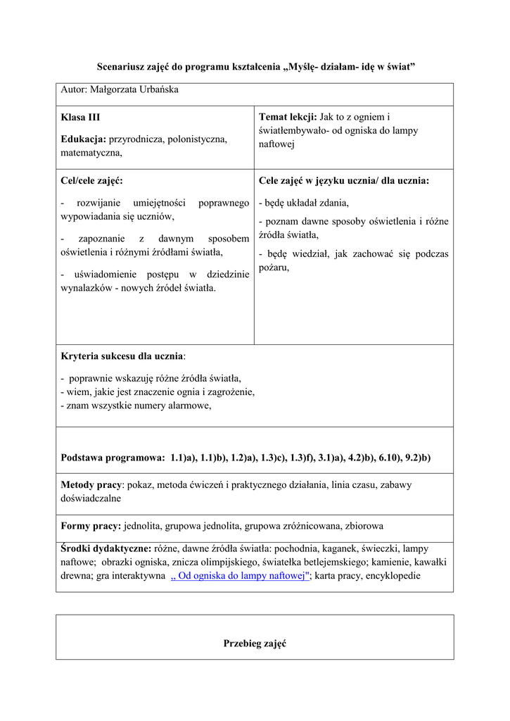 Scenariusz zajęć do programu kształcenia „Myślę- działam- idę w świat” Autor: Małgorzata Urbańska Klasa III Edukacja: przyrodnicza, polonistyczna, matematyczna, Cel/cele zajęć: - rozwijanie umiejętności wypowiadania się uczniów, Temat lekcji: Jak to z ogniem i światłembywało- od ogniska do lampy naftowej Cele zajęć w języku ucznia/ dla ucznia: poprawnego - będę układał zdania, - poznam dawne sposoby oświetlenia i różne - zapoznanie z dawnym sposobem źródła światła, oświetlenia i różnymi źródłami światła, - będę wiedział, jak zachować się podczas pożaru, - uświadomienie postępu w dziedzinie wynalazków - nowych źródeł światła. Kryteria sukcesu dla ucznia: - poprawnie wskazuję różne źródła światła, - wiem, jakie jest znaczenie ognia i zagrożenie, - znam wszystkie numery alarmowe, Podstawa programowa: 1.1)a), 1.1)b), 1.2)a), 1.3)c), 1.3)f), 3.1)a), 4.2)b), 6.10), 9.2)b) Metody pracy: pokaz, metoda ćwiczeń i praktycznego działania, linia czasu, zabawy doświadczalne Formy pracy: jednolita, grupowa jednolita, grupowa zróżnicowana, zbiorowa Środki dydaktyczne: różne, dawne źródła światła: pochodnia, kaganek, świeczki, lampy naftowe; obrazki ogniska, znicza olimpijskiego, światełka betlejemskiego; kamienie, kawałki drewna; gra interaktywna ,, Od ogniska do lampy naftowej"; karta pracy, encyklopedie Przebieg zajęć „Drogowskazy” Centra Aktywnej Edukacji -wskazówki i uwagi o realizacji 1. Iskierka- powitanie.Nauczyciel wraz z uczniami stoi w kręgu i artystycznoruchowe przesyła „iskierkę” uściskiem dłoni. 2. Zabawa ,,Ciepło- zimno” – odgadnięcie celu zajęć. Jeden dyżurny wychodzi za drzwi, drugi chowa czerwoną kopertę. Gdy ją odnajdzie z pomocą wszystkich dzieci, chowa kopertęponownie. Uczniowie zastanawiają się: Co może oznaczać ten kolor? 3. Otwarcie koperty, w której na rysunku przedstawiającym płomień zapisane jest kryterium sukcesu. Nauczyciel przykleja je w widocznym miejscu. matematyczno4. ,,Kawałek do kawałka” - każde dziecko wybiera sobie dwa przyrodnicze kamienie i próbuje wykrzesać iskrę. Następnie otrzymuje dwa kawałki drewna i pociera o siebie. Po zabawie doświadczalnej dzieci tworzą konstrukcję ogniska z patyków, otaczają je kamieniami i gromadzą się przy nim (wewnątrz ogniska można włączyć latarkę lub lampki choinkowe). Wysnuwają wnioski, zastanawiają się czy było to łatwe zajęcie. Nauczyciel opowiada o znaczeniu ogniska w dawnych czasach prezentując ilustracje – załącznik nr 1 ( np. z książki ,,Tak żyli ludzie w dawnej Polsce- Od Piasta do Kadłubka”- wyd. dolnośląskie, ,,Najkrótsza historia wynalazków”- wyd. II PZSWiR W-wa 1993 ). 5. ,,Promyczkowe słoneczko” polonistycznoKażde dziecko na pasku żółtego papieru wymyśla wyrazy, komunikacyjne które kojarzą się ze światłem- ogniem dzisiaj np. ciepło, jasno, przytulnie, świeca, lampa, piec, Słońce, ognisko, spotkania, grzeje, świeci, wskazuje… Uczniowie przy ognisku tworzą promyczki i wskazują promyczek według nich najdłuższy. 6. Przeniesienie płomyczka. Uczniowie odliczając do dwóch tworzą pary i zastanawiają się jak można przenieść płomień w inne miejsce. Następnie tworzą czwórki wymieniając swoje poglądy. Liderzy grup podają propozycje: pochodnie, patyki, świece, znicze. Nauczyciel pokazuje łuczywo, pochodnię. 7. Podział klasy na dwa zespoły. Nauczyciel przekazuje liderom grup kopertę z zdaniami do wykonania. Dzieci szukają informacji w encyklopedii: * Betlejemskie Światło Pokoju- pierwsza grupa (Opisz wędrówkę światła. Wykorzystaj kredki, pisaki ) * znicz olimpijski- druga grupa ( To samo polecenie). Najważniejsze informacje przedstawiają graficznie na przygotowanych szablonach - znicz olimpijski i światełko betlejemskie. Następnie prezentują swoje prace na forum klasy, wskazują na mapie fizycznej świata różne miejsca np. Grecję, Betlejem (określają położenie) i dyskutują o wspólnych cechach dwóch symboli np. historia, zwyczaj, pamięć, przywiązanie, tradycja, miłość. (załącznik nr 2 –informacje dla nauczyciela) 8. Jaki jest ogień? Pokaz kaganka oraz różnych świec. Przygotowanie prostych doświadczeń ze świeczką sztucznym źródłem światła. - - Zasłonięcie okien, zaświecenie świeczki. Nauczyciel prosi o chwilę zadumy i zgaszenie świecy. Dzieci wysnuwają wniosek, że ogień jest źródłem światła. - Ponowne zapalenie świecy, przesuwanie palca wskazującego w bezpiecznej odległości od płomienia i określenie doświadczanego uczucia ( ogień źródłem ciepła) - Zapalenie małej świeczki i położenie porcelanowego imbryka z zimną wodą. Sprawdzenie po kilku minutach wody. (Uczniowie sami dyskutują i dochodzą do matematycznoprzyrodnicze przekonania, iż ogień pomaga w codziennym życiu np. w przygotowaniu potraw). - Zapalenie dwóch świeczek. Zadaniem dzieci jest zgaszenie jednejpłonącej świeczki nie dmuchając na nią, nie dotykając jej (w pobliżu jest słoik). Doświadczenie wykonywane jest pod opieką nauczyciela. Zapewne jedną świecę dzieci przykryją słoikiem. Pierwsza zgaśnie świeczka przykryta, kiedy zużyje większą część tlenu znajdującą się w słoiku. 9. Aromaterapia. Zapalenie aromatycznej świecy np. pomarańczowej. Wykonanie interaktywnego zadania ,, Od ogniska do lampy naftowej "Sprawdzenie kryterium sukcesu. Ułożenie źródeł światła (obrazków artystycznoruchowe lub przedmiotów) na wystawie ,,Od ogniska do lampy naftowej”, przyporządkowanie podpisów. 10. Pokaz kolejnego wynalazku – lampy naftowej - burza mózgów: Dlaczego ten wynalazek miał takie duże znaczenie dla ludzkości? 11. Pogadanka na temat zachowania się podczas pożaru po usłyszeniu sygnału wozu strażackiego. Przypomnienie zasad próbnego alarmu ( zamknięcie okien, ustawienie się, wyjście drogą ewakuacyjną, zabranie dziennika przez nauczyciel