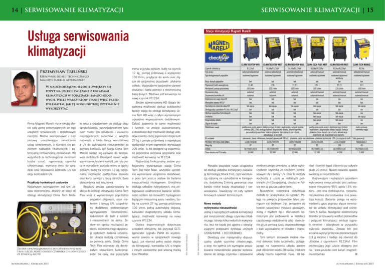 14 | SERWISOWANIE KLIMATYZACJI SERWISOWANIE KLIMATYZACJI | 15 Usługa serwisowania klimatyzacji Stacje klimatyzacji Magneti Marelli W nadchodzącym sezonie zwiększy się popyt na usługi związane z układami klimatyzacji w pojazdach samochodowych. Wiele warsztatów stanie więc przed dylematem, jak tę koniunkturę optymalnie wykorzystać Firma Magneti Marelli ma w swojej ofercie całą gamę przeznaczonych do tego urządzeń serwisowych i dodatkowych narzędzi. Można skomponować z nich zestawy umożliwiające świadczenie usług serwisowych, a różniące się poziomem nakładów finansowych i potencjalną rentownością zastosowań. We wszystkich za technologiczne minimum trzeba uznać: regenerację czynnika chłodniczego, wymianę oleju do sprężarki oraz stosowanie kontrastu UV lub oleju kontrastem UV. le wraz z urządzeniem do obsługi oleju sprężarkowego, oprzyrządowaniem typu ozon maker (do odkażania i usuwania nieprzyjemnych zapachów z wnętrza nadwozi), a także lampy warsztatowej z UV do wykrywania nieszczelności za pomocą kontrastu UV. Stacja Clima Tech Mobile nadaje się zarówno do zastosowań mobilnych (transport nawet większymi samochodami kombi), jak i do pracy w warsztacie, posiada menu w języku polskim, butlę na czynnik 12 kg, opcjonalną możliwość podłączenia drukarki oraz karty pamięci z bazą danych. Baza Przykłady konkretnych zestawów standardowa jest książkowa. Najtańszym rozwiązaniem jest tzw. zeBogatszy zestaw zaawansowany to staw ekonomiczny, złożony ze stacji do stacja do obsługi klimatyzacji Clima Tech obsługi klimatyzacji Clima Tech Mobi- Plus wraz z wymienionym poprzednio zespołem olejowym, ozon makerem i lampą UV, uzupełniony dodatkowo elektronicznym wykrywaczem nieszczelności, reduktorem do butli z azotem i manometrami do azotu. Zestaw ten oprócz możliwości zestawu ekonomicznego dysponuje systemem badania szczelności układu metodą ciśnieniową za pomocą azotu. Stacja Clima Tech Plus odznacza się doskoZestaw oprzyrządowania do ciśnieniowej konnałym stosunkiem funkcjonaltroli szczelności obiegu czynnika chłodniczego za pomocą azotu ności do ceny, ma przejrzyste Autonaprawa | Kwiecień 2015 Ponadto wszystkie nasze urządzenia do obsługi układów klimatyzacji posiadają technologię Shock Free, czyli konstrukcję odporną na uszkodzenia w transporcie, dodatkową 2-letnią gwarancję oraz bardzo niskie koszty eksploatacji i serwisowania. Towarzyszy im cały system firmowych szkoleń technicznych. Fot. Magneti Marelli Kierownik działu technicznego Magneti Marelli Aftermarket menu w języku polskim, butlę na czynnik 12 kg, pompę próżniową o wydajności 100 l/min, przyłącze do azotu oraz złącze do opcjonalnej przystawki płukania układu. Wyposażenie opcjonalne stanowi drukarka i karta pamięci z elektroniczną bazą danych. Możliwa jest konwersja na nowy czynnik YF1234. Zestaw zaawansowany HD (dający dodatkową możliwość obsługi autobusów) tworzy stacja do obsługi klimatyzacji Clima Tech HD wraz z całym wymienianym uprzednio wyposażeniem dodatkowym. Całość zapewnia te same możliwości i funkcje, co zestaw zaawansowany, a dodatkowo daje możliwość obsługi układów o bardzo dużej pojemności dzięki butli 27 kg i pompie próżniowej o największej wydajności w tym segmencie, wynoszącej 226 l/min. Tu też dostępne są wspomniane poprzednio akcesoria opcjonalne oraz możliwość konwersji na YF1234. Najbardziej funkcjonalny zestaw profesjonalny wykorzystuje stację Clima Tech Top Next Maxi, wszystkie uprzednio wymieniane urządzenia dodatkowe, a poza tym jeszcze zestaw do badania nieszczelności Hydrogenem. Umożliwia obsługę układów hybrydowych, ma zintegrowane elektroniczne badanie szczelności azotem lub (nowość!) hydrogenem będącym mieszaniną azotu i wodoru, butlę na czynnik 27 kg, pompę próżniową 100 l/min, pełną automatykę olejową, kalkulator diagnostyczny układu klimatyzacji, możliwość konwersji na nowy czynnik YF1234. Oprócz wspomnianych dotychczas urządzeń oferujemy też przyrząd CLT1 (generator sygnału PWM do wysterowania zaworu w sprężarkach nowego typu), jak również pełny wybór olejów do klimatyzacji, kontrastów UV, o-ringów i innych akcesoriów pod własną marką Cool Weather. Fot. Magneti Marelli Przemysław Treliński CLIMA TECH TOP HFO CLIMA TECH TOP NEXT CLIMA TECH TOP MAXI CLIMA TECH PLUS NEXT CLIMA TECH HD NEXT CLIMA TECH MOBILE Czynnik chłodniczy R1234yf R134a/R1234yf R134a/R1234yf R134a/R1234yf R134a/R1234yf R134a Tryb pracy automat/półautomat automat/półautomat automat/półautomat automat/manual automat/manual półautomat/manual Typ obsługiwanych pojazdów osobowe/ciężarowe osobowe/ciężarowe osobowe/ciężarowe osobowe/ciężarowe osobowe/ciężarowe/ osobowe/ciężarowe autobusy Baza danych pojazdów tak tak tak tak tak tak Pojemność butli wewnętrznej 12,4 l 12,4 l 27,2 l 12,4 l 27,2 l 12 l Wydajność pompy próżniowej 100 l/min 100 l/min 100 l/min 100 l/min 226 l/min 100 l/min Dozowanie oleju automat automat automat automat/manual automat/manual automat/manual Dozowanie barwnika UV automat automat automat automat/manual automat/manual automat/manual Elektroniczne wagi oleju/UV tak tak tak nie nie nie Manualne zawory HP/LP nie nie nie tak tak tak Hermetyczne zbiorniki oleju/UV tak-opcja tak-opcja tak-opcja tak-opcja tak-opcja tak-opcja Obsługa obu czynników R134a i R1234yf tak tak tak tak tak nie Obsługa pojazdów hybrydowych tak tak tak tak-opcja tak-opcja nie Drukarka tak tak tak tak-opcja tak-opcja tak-opcja Diagnostyka układu tak tak tak tak-opcja tak-opcja nie Złącze do azotu tak tak tak tak tak nie Dodatkowe uwagi podłączenie azotu wraz z elektronicznym testem i wydrukiem, odzysk zgodnie podłączenie azotu wraz z elektronicznym testem małe rozmiary, z normą SAE 2788, obsługa hybryd, diagnostyka układu, bilans czynnika, i wydrukiem, diagnostyka układu (opcja), funkcja niewielka waga perso