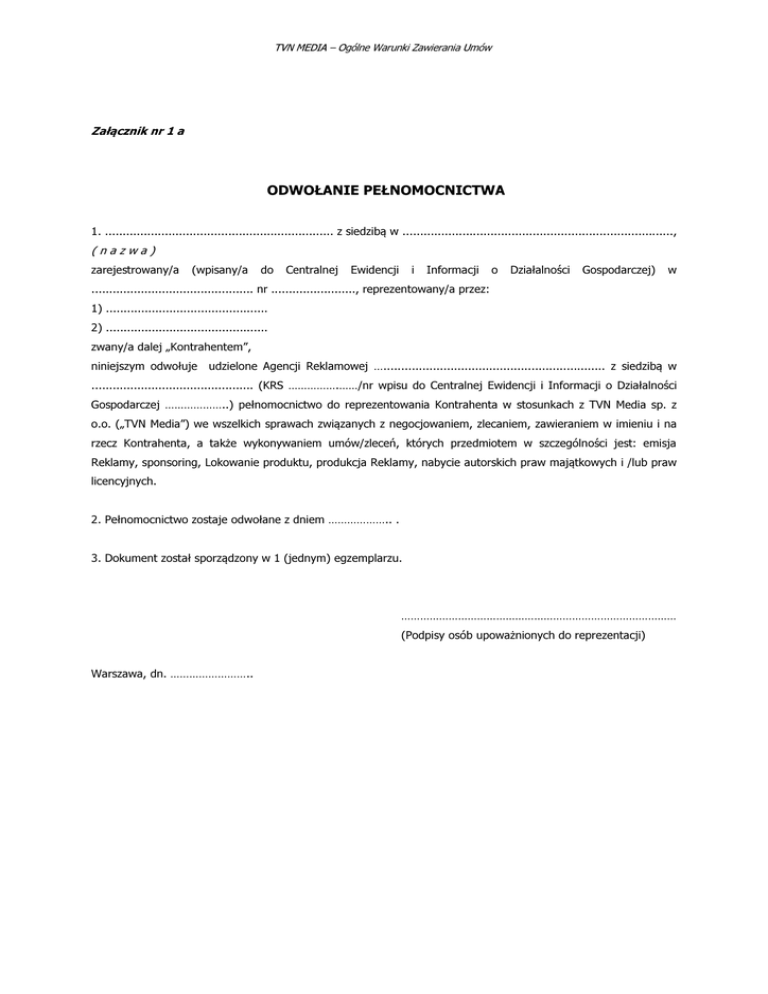 TVN MEDIA – Ogólne Warunki Zawierania Umów Załącznik nr 1 a ODWOŁANIE PEŁNOMOCNICTWA 1. ................................................................. z siedzibą w ............................................................................., (nazwa) zarejestrowany/a (wpisany/a do Centralnej Ewidencji i Informacji o Działalności Gospodarczej) w .............................................. nr ........................, reprezentowany/a przez: 1) .............................................. 2) .............................................. zwany/a dalej „Kontrahentem”, niniejszym odwołuje udzielone Agencji Reklamowej …............................................................... z siedzibą w .............................................. (KRS …………….……/nr wpisu do Centralnej Ewidencji i Informacji o Działalności Gospodarczej ………………..) pełnomocnictwo do reprezentowania Kontrahenta w stosunkach z TVN Media sp. z o.o. („TVN Media”) we wszelkich sprawach związanych z negocjowaniem, zlecaniem, zawieraniem w imieniu i na rzecz Kontrahenta, a także wykonywaniem umów/zleceń, których przedmiotem w szczególności jest: emisja Reklamy, sponsoring, Lokowanie produktu, produkcja Reklamy, nabycie autorskich praw majątkowych i /lub praw licencyjnych. 2. Pełnomocnictwo zostaje odwołane z dniem ……………….. . 3. Dokument został sporządzony w 1 (jednym) egzemplarzu. …………………………………………………………………………… (Podpisy osób upoważnionych do reprezentacji) Warszawa, dn. ……………………..