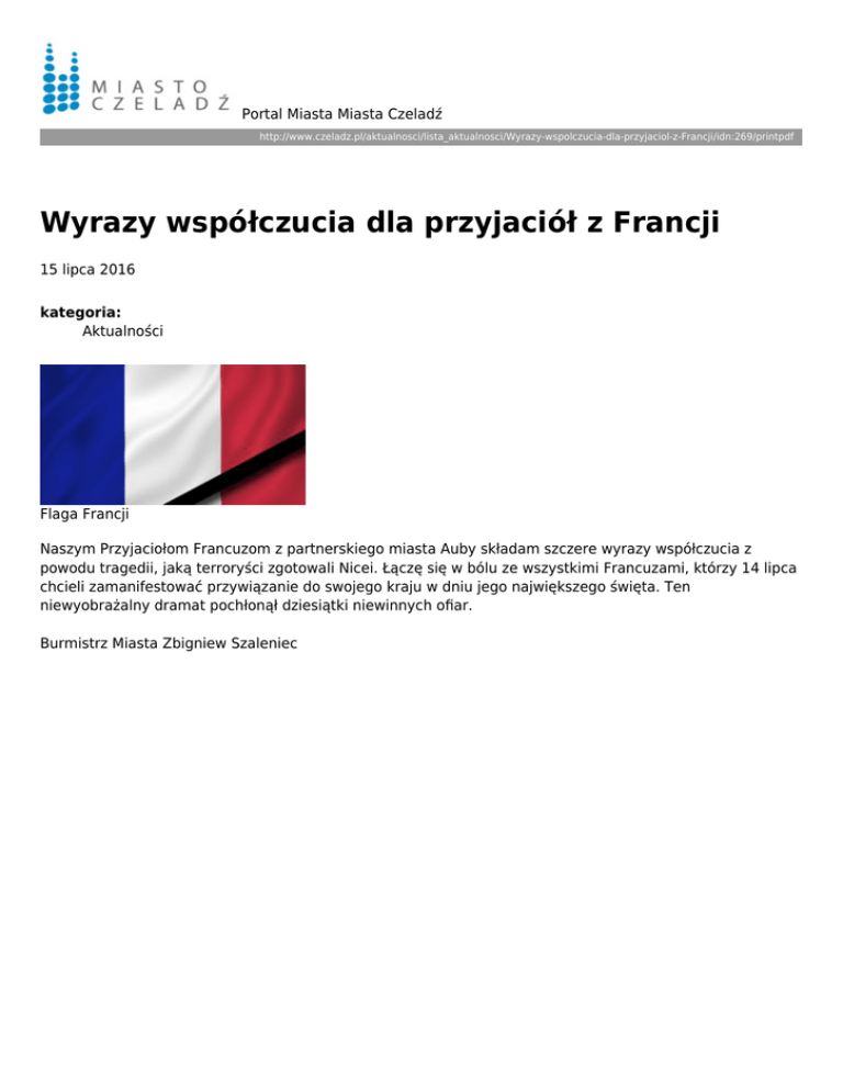 Portal Miasta Miasta Czeladź http://www.czeladz.pl/aktualnosci/lista_aktualnosci/Wyrazy-wspolczucia-dla-przyjaciol-z-Francji/idn:269/printpdf Wyrazy współczucia dla przyjaciół z Francji 15 lipca 2016 kategoria: Aktualności Flaga Francji Naszym Przyjaciołom Francuzom z partnerskiego miasta Auby składam szczere wyrazy współczucia z powodu tragedii, jaką terroryści zgotowali Nicei. Łączę się w bólu ze wszystkimi Francuzami, którzy 14 lipca chcieli zamanifestować przywiązanie do swojego kraju w dniu jego największego święta. Ten niewyobrażalny dramat pochłonął dziesiątki niewinnych ofiar. Burmistrz Miasta Zbigniew Szaleniec