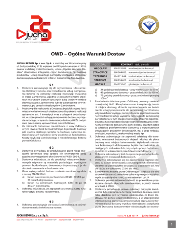 OWD – Ogólne Warunki Dostaw JUCHA BETON Sp. z o.o. Sp.k. z siedzibą we Wrocławiu przy ul. Sołtysowickiej 27 D, wpisana do KRS pod numerem 413018, zwana w dalszej treści Dostawcą, ustala „Ogólne Warunki Dostaw” stanowiące integralną część Zamówienia na dostawę produktów i usług zawartego pomiędzy Dostawcą a Odbiorcą/ Zamawiającym wskazanym w treści dokumentu Zamówienia. 1. 2. 3. 1. 2. 3. 4. 1. ODDZIAŁ §1 Dostawca zobowiązuje się do wytworzenia i dostarczenia Odbiorcy betonu oraz świadczenia usług pompowania betonu, na potrzeby realizacji inwestycji wskazanej w treści Zamówienia, zgodnie z postanowieniami Ogólnych Warunków Dostaw (zwanych dalej OWD) w okresie obowiązywania Zamówienia lub do zakończenia w/w inwestycji, po cenach określonych w Zamówieniu. Podstawą dla rozliczenia z Dostawcą będą faktyczne ilości mieszanek betonowych dostarczone dla potrzeb realizacji opisanej w ust. 1 inwestycji wraz z usługami dodatkowymi, w szczególności usługą pompowania betonu, wynajęcia rurociągu, w oparciu dokumenty dostawy (WZ), podpisane przez osobę upoważnioną przez Odbiorcę. Za mieszanki betonowe nieodebrane z winy Odbiorcy, w tym również brak bezpośredniego dojazdu do budowy jaki wjazdu ciężkiego sprzętu na budowę, naliczona zostanie opłata w wysokości ceny ustalonej w Zamówieniu. Koszty utylizacji zamówionego i nieodebranego betonu ponosi Odbiorca. §3 Odbiorca zobowiązuje się składać zamówienia za pośrednictwem maila i telefonu na numer: (tel., e-mail) 600 923 983, [email protected] STANOWICE 668 004 820, [email protected] TRZEBNICA 604 271 844, [email protected] STRZELCE 668 894 620, [email protected] GŁOSKA 664 975 247, [email protected] a) b) c) 2. 3. §2 Dostawca oświadcza, że produkowane przez niego mieszanki betonowe oraz sposób ich wytworzenia będą zgodnez wymaganiami określonymi w PN EN 206-1. Dostawca oświadcza, że do produkcji mieszanek betonowych używane są materiały posiadające wymagane prawem budowlanym, dokumenty dopuszczające je do obrotu i stosowania w budownictwie. Klasa wytrzymałości betonu zostanie oceniona zgodnie z normą PN-EN 206-1: a) beton na cemencie portlandzkim (CEM I i CEM II) po 28 dniach dojrzewania, b) beton na cementach hutniczych (CEM III) po 56 dniach dojrzewania. Odbiorca oświadcza, że zapoznał się z treścią Kartą Charakterystyki Betonu Towarowego. KONTAKT WROCŁAW 4. 5. 6. 7. 8. 24 godziny przed dostawą − przy wielkościach do 50 m³, 48 godziny przed dostawą − przy wielkościach do 100 m³, 72 godziny przed dostawą − przy zamówieniu powyżej 100 m³. Zamówienia składane przez Odbiorcę powinny zawierać co najmniej: ilość i klasę betonu oraz konsystencję, termini miejsce dostawy, złożenie zapotrzebowania na świadczenie usługi pompowania do zamawianej partii betonu, w tym wielkość wysięgu pompy, złożenie zapotrzebowania na świadczenie usługi wynajmu rurociągu do zamawianej partii betonu, w tym długość rurociągu, złożenie zapotrzebowania na świadczenie usługi ręcznego dodawania włókna stalowego do zamawianej partii betonu oraz tam gdzie to właściwe poinformowanie Dostawcy o ograniczeniach dotyczących pojazdów dostawczych, np. o jego rodzaju, wielkości, wysokości, maksymalnej masie itp. Odbiorca zobowiązuje się zapewnić właściwy dla transportu mieszanek betonowych dojazd i dostęp do placu budowy oraz miejsca betonowania. Wyładunek mieszanek betonowych dokonywany będzie bezpośrednio do dostępnych szalunków lub przy użyciu pomp do betonu, zgodnie ze wskazaniami przedstawiciela Odbiorcy. Odbiorca zobowiązany jest do sprawnego rozładunku dostarczanych mieszanek betonowych. Dostawca zobowiązuje się do zapewnienia ciągłości dostaw w czasie betonowania poszczególnych elementów obiektu od poniedziałku do piątku w godzinach od 7:00 do 16:00, a w soboty od 07:00 do 14:00. Zamówienie złożone przez Odbiorcę jest wiążące dla obu stron i może zostać zmienione tylko w sytuacjach wyjątkowych, za zgodą obu stron, z zastrzeżeniem ust. 9. Odbiorca ponosi odpowiedzialność za prawidłowe przekazanie danych objętych zamówieniem, o jakich mowa w § 3 ust. 2 OWD. Dostawcy przysługuje prawo odmowy przyjęcia zamówienia lub przesunięcia terminu realizacji dostawy, jeżeli takie działanie jest wynikiem okoliczności, za które Dostawca nie ponosi odpowiedzialności, a w szczególności jeżeli odmowa przyjęcia zamówienia lub przesunięcie terminu realizacji dostawy wynika z niemożności pozyskania przez Dostawcę komponentów niezbędnych do wytwoinfolinia 71 325 15 17 jucha-beton.pl 1 rzenia mieszanki betonowej, bądź przyczyną takiego zachowania jest siła wyższa. 9. Strony dopuszczają możliwość odwołania przez Odbiorcę dziennego zamówienia, z zastrzeżeniem, iż ewentualne odwołanie zamówienia nastąpi z odpowiednim wyprzedzeniem dla zamawianej ilości: a) dla dostaw w ilościach do 20 m3 betonu – na 3 h przed planowanym betonowaniem, b) dla dostaw w ilościach do 100 m3 betonu – na 5 h przed planowanym betonowaniem, c) dla dostaw w ilościach do 200 m3 betonu – na 12 h przed planowanym betonowaniem, d) dla większych dostaw betonu – na 20 h przed planowanym betonowaniem. 10. Odbiorca zobowiązany jest zapewnić na terenie budowy miejsce do umycia betonowozu, pompy do betonu oraz rurociągu. 11. Odbiorca odpowiada za ewentualne szkody i straty materialne Dostawcy powstałe na skutek niezapewnienia warunków określonych i opisanych w § 3 ust. 3 i 10. 1. 2. 3. 4. 1. 2. 3. 4. §4 Dostawca zobowiązany jest dostarczyć zbiorczą Deklarację Zgodności za dostarczoną/odebraną mieszankę betonową po uregulowaniu należności za daną partię towaru. Wydanie dokumentu deklaracji zgodności nastąpi na wniosek Odbiorcy, który to musi zawierać ilości oraz daty dostaw. Dokument dostawy (WZ) zawiera co najmniej następujące dane: klasa betonu, dodatkowe parametry techniczne wynika