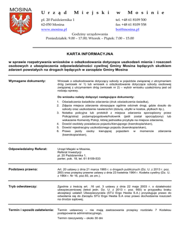 U r z ą d M i e j s k i w M o s i n i e pl. 20 Października 1 tel. +48 61 8109 500 62-050 Mosina fax +48 61 8109 558 www.mosina.pl [email protected] Godziny urzędowania Poniedziałek: 9.00 – 17.00; Wtorek – Piątek: 7.00 – 15.00 KARTA INFORMACYJNA w sprawie rozpatrywania wniosków o odszkodowania dotyczące uszkodzeń mienia i roszczeń osobowych z ubezpieczenia odpowiedzialności cywilnej Gminy Mosina będących skutkiem zdarzeń powstałych na drogach będących w zarządzie Gminy Mosina Wymagane dokumenty: Wniosek o odszkodowanie dotyczący szkody w pojeździe związanej z utrzymaniem dróg (wniosek nr 1) lub wniosek o odszkodowanie dotyczące szkody osobowej związanej z utrzymaniem dróg (wniosek nr 2) – wybór wniosku uzależniony jest od rodzaju sprawy. Do wniosku należy dołączyć następujące dokumenty: 1. Oświadczenia świadków zdarzenia (druk oświadczenia świadka), 2. Zdjęcia miejsca zdarzenia obrazujące ogólnie odcinek drogi, gdzie doszło do szkody oraz uszkodzenie nawierzchni (dziurę, ubytki w kostce, płytkach itp.), 3. Notatka policyjna lub protokół z miejsca zdarzenia sporządzony przez Policję/straż pożarną/pogotowie/holownik (jeśli został sporządzony) lub wskazanie Komendy Policji, której jednostka przybyła na miejsce zdarzenia, 4. Dowód osobisty posiadacza pojazdu/kierującego (kserokopia/skan), 5. Dowód rejestracyjny uszkodzonego pojazdu (kserokopia/skan), 6. Prawo jazdy osoby kierującej pojazdem w momencie zdarzenia (kserokopia/skan), Odpowiedzialny Referat: Urząd Miejski w Mosinie, Referat Inwestycji pl. 20 Października 1, parter, pok. 18, tel. 61 8109-533 Podstawa prawna: Art. 20 ustawy z dnia 21 marca 1985 r. o drogach publicznych (Dz. U. z 2013 r. poz. 260) oraz przepisy prawne ustawy z dnia 23 kwietnia 1964 r. Kodeks cywilny (Dz. U. z 1964 r. Nr 16, poz.93, ze zm.). Tryb odwoławczy: Zgodnie z treścią art. .16 ust. 3 ustawy z dnia 22 maja 2003 r. o działalności ubezpieczeniowej (tekst jedn. Dz. U. z 2013 r. poz. 950) w przypadku braku akceptacji ustaleń Ubezpieczyciela (STU Ergo Hestia S.A.) przysługuje prawo do odwołania się do Zarządu STU Ergo Hestia S.A oraz prawo dochodzenia roszczeń na drodze sądowej. Termin i sposób załatwienia: Termin ustawowy – nie mają zastosowania przepisy rozdziału 7 Kodeksu postępowania administracyjnego, Termin rzeczywisty – około 30 dni Informacje dotyczące przetwarzania danych osobowych Administratorem danych osobowych podanych we Wniosku jest Burmistrz Gminy Mosina z siedzibą w Mosinie przy pl. 20 Października 1. Zebrane dane będą przetwarzane zgodnie z ustawą o ochronie danych osobowych w celach związanych z rozpatrzeniem wniosku o odszkodowanie oraz w celach archiwalnych. Zebrane dane będą udostępniane jedynie uprawnionym podmiotom w okolicznościach przewidzianych w ustawie o ochronie danych osobowych (Dz. U. z 2002 r. nr 101, poz. 926 z późn. zm.). . Każdej osobie przysługuje prawo dostępu do treści swoich danych i ich poprawiania, a także prawo wniesienia sprzeciwu wobec przetwarzania danych oraz ich udostępniania innym podmiotom. Podanie danych jest dobrowolne, ale konieczne do rozpatrzenia wniosku. Inne informacje: W przypadku braku kompletu wymaganych dokumentów wnioskodawca zostanie wezwany do ich uzupełnienia. Kompleksową obsługą likwidacji szkód zajmuje się w imieniu Gminy Mosina Towarzystwo Ubezpieczeń STU Ergo Hestia, które poprzez swoich pracowników prowadzi procedurę odszkodowawczą. - Strona 2 z 2 -