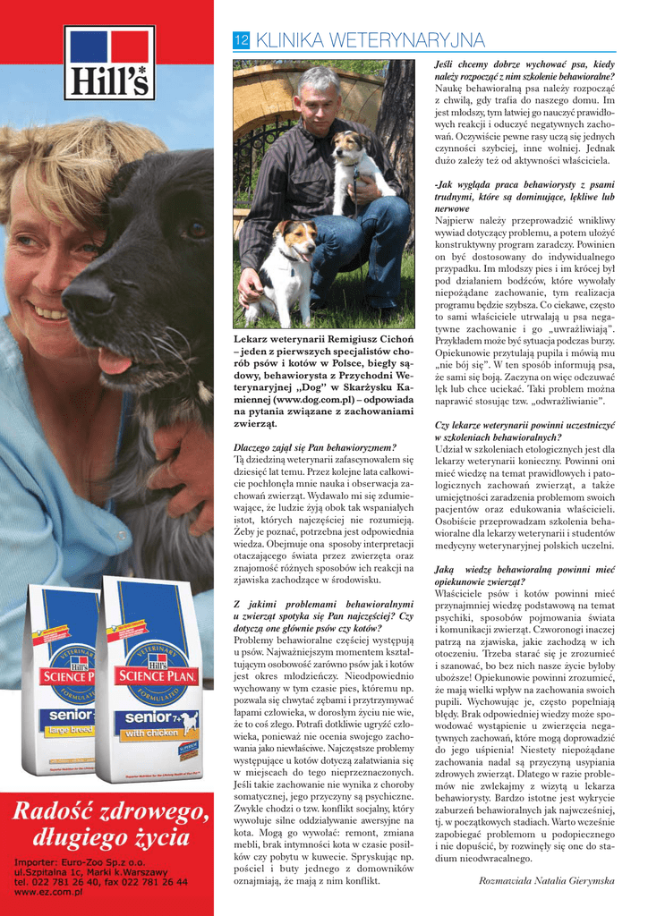 12 KLINIKA WETERYNARYJNA JeÊli chcemy dobrze wychowaç psa, kiedy nale˝y rozpoczàç z nim szkolenie behawioralne? Nauk´ behawioralnà psa nale˝y rozpoczàç z chwilà, gdy trafia do naszego domu. Im jest m∏odszy, tym ∏atwiej go nauczyç prawid∏owych reakcji i oduczyç negatywnych zachowaƒ. OczywiÊcie pewne rasy uczà si´ jednych czynnoÊci szybciej, inne wolniej. Jednak du˝o zale˝y te˝ od aktywnoÊci w∏aÊciciela. Lekarz weterynarii Remigiusz Cichoƒ – jeden z pierwszych specjalistów chorób psów i kotów w Polsce, bieg∏y sàdowy, behawiorysta z Przychodni Weterynaryjnej „Dog” w Skar˝ysku Kamiennej (www.dog.com.pl) – odpowiada na pytania zwiàzane z zachowaniami zwierzàt. Dlaczego zajà∏ si´ Pan behawioryzmem? Tà dziedzinà weterynarii zafascynowa∏em si´ dziesi´ç lat temu. Przez kolejne lata ca∏kowicie poch∏on´∏a mnie nauka i obserwacja zachowaƒ zwierzàt. Wydawa∏o mi si´ zdumiewajàce, ˝e ludzie ˝yjà obok tak wspania∏ych istot, których najcz´Êciej nie rozumiejà. ˚eby je poznaç, potrzebna jest odpowiednia wiedza. Obejmuje ona sposoby interpretacji otaczajàcego Êwiata przez zwierz´ta oraz znajomoÊç ró˝nych sposobów ich reakcji na zjawiska zachodzàce w Êrodowisku. Z jakimi problemami behawioralnymi u zwierzàt spotyka si´ Pan najcz´Êciej? Czy dotyczà one g∏ównie psów czy kotów? Problemy behawioralne cz´Êciej wyst´pujà u psów. Najwa˝niejszym momentem kszta∏tujàcym osobowoÊç zarówno psów jak i kotów jest okres m∏odzieƒczy. Nieodpowiednio wychowany w tym czasie pies, któremu np. pozwala si´ chwytaç z´bami i przytrzymywaç ∏apami cz∏owieka, w doros∏ym ˝yciu nie wie, ˝e to coÊ z∏ego. Potrafi dotkliwie ugryêç cz∏owieka, poniewa˝ nie ocenia swojego zachowania jako niew∏aÊciwe. Najcz´stsze problemy wyst´pujàce u kotów dotyczà za∏atwiania si´ w miejscach do tego nieprzeznaczonych. JeÊli takie zachowanie nie wynika z choroby somatycznej, jego przyczyny sà psychiczne. Zwykle chodzi o tzw. konflikt socjalny, który wywo∏uje silne oddzia∏ywanie awersyjne na kota. Mogà go wywo∏aç: remont, zmiana mebli, brak intymnoÊci kota w czasie posi∏ków czy pobytu w kuwecie. Spryskujàc np. poÊciel i buty jednego z domowników oznajmiajà, ˝e majà z nim konflikt. -Jak wyglàda praca behawiorysty z psami trudnymi, które sà dominujàce, l´kliwe lub nerwowe Najpierw nale˝y przeprowadziç wnikliwy wywiad dotyczàcy problemu, a potem u∏o˝yç konstruktywny program zaradczy. Powinien on byç dostosowany do indywidualnego przypadku. Im m∏odszy pies i im krócej by∏ pod dzia∏aniem bodêców, które wywo∏a∏y niepo˝àdane zachowanie, tym realizacja programu b´dzie szybsza. Co ciekawe, cz´sto to sami w∏aÊciciele utrwalajà u psa negatywne zachowanie i go „uwra˝liwiajà”. Przyk∏adem mo˝e byç sytuacja podczas burzy. Opiekunowie przytulajà pupila i mówià mu „nie bój si´”. W ten sposób informujà psa, ˝e sami si´ bojà. Zaczyna on wi´c odczuwaç l´k lub chce uciekaç. Taki problem mo˝na naprawiç stosujàc tzw. „odwra˝liwianie”. Czy lekarze weterynarii powinni uczestniczyç w szkoleniach behawioralnych? Udzia∏ w szkoleniach etologicznych jest dla lekarzy weterynarii konieczny. Powinni oni mieç wiedz´ na temat prawid∏owych i patologicznych zachowaƒ zwierzàt, a tak˝e umiej´tnoÊci zaradzenia problemom swoich pacjentów oraz edukowania w∏aÊcicieli. OsobiÊcie przeprowadzam szkolenia behawioralne dla lekarzy weterynarii i studentów medycyny weterynaryjnej polskich uczelni. Jakà wiedz´ behawioralnà powinni mieç opiekunowie zwierzàt? W∏aÊciciele psów i kotów powinni mieç przynajmniej wiedz´ podstawowà na temat psychiki, sposobów pojmowania Êwiata i komunikacji zwierzàt. Czworonogi inaczej patrzà na zjawiska, jakie zachodzà w ich otoczeniu. Trzeba staraç si´ je zrozumieç i szanowaç, bo bez nich nasze ˝ycie by∏oby ubo˝sze! Opiekunowie powinni zrozumieç, ˝e majà wielki wp∏yw na zachowania swoich pupili. Wychowujàc je, cz´sto pope∏niajà b∏´dy. Brak odpowiedniej wiedzy mo˝e spowodowaç wystàpienie u zwierz´cia negatywnych zachowaƒ, które mogà doprowadziç do jego uÊpienia! Niestety niepo˝àdane zachowania nadal sà przyczynà usypiania zdrowych zwierzàt. Dlatego w razie problemów nie zwlekajmy z wizytà u lekarza behawiorysty. Bardzo istotne jest wykrycie zaburzeƒ behawioralnych jak najwczeÊniej, tj. w poczàtkowych stadiach. Warto wczeÊnie zapobiegaç problemom u podopiecznego i nie dopuÊciç, by rozwin´∏y si´ one do stadium nieodwracalnego. Rozmawia∏a Natalia Gierymska