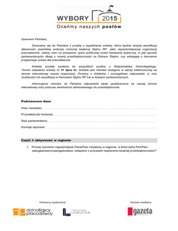 Szanowni Państwo, Zwracamy się do Państwa z prośbą o wypełnienie ankiety, która będzie słuŜyła weryfikacji aktywności poselskiej podczas minionej kadencji Sejmu RP. Jako reprezentatywnej organizacji pracodawców, zaleŜy nam na pokazaniu opinii publicznej przed kampanią wyborczą, w jaki sposób parlamentarzyści dbają o rozwój przedsiębiorczości na Dolnym Śląsku, czy zabiegają o tworzenie przyjaznego prawa dla pracodawców. Ankieta została wysłana do wszystkich posłów z Województwa Dolnośląskiego. Termin odesłania ankiety to 31 lipca br. Ankieta jest równieŜ dostępna w wersji elektronicznej na stronie internetowej naszej organizacji. Prosimy o dokładne i szczegółowe odpowiedzi, w celu moŜliwości ich weryfikacji w Kancelarii Sejmu RP lub w klubach parlamentarnych. Informujemy równieŜ, Ŝe Państwa odpowiedzi będą upublicznione na naszej stronie internetowej oraz podczas seminarium adresowanego do przedsiębiorców. Podstawowe dane Imię i nazwisko: ………………………………………………………………………………………………………………………………………………………………………………………………………… PrzynaleŜność klubowa: …………………………………………………………………………………………………………………………………………………………………………………….. StaŜ parlamentarny: ……………………………………………………………………………………………………………………………………………………………………………………………… Komisje sejmowe: …………………………………………………………………………………………………………………………………………………………………………………………………… Część I: aktywność w regionie 1. Proszę wymienić najwaŜniejsze Pana/Pani inicjatywy w regionie, w które był/a Pan/Pani zaangaŜowany/zaangaŜowana, związane z procesem wspierania lokalnej przedsiębiorczości? Partnerzy wydarzenia Partner medialny 2. Proszę wskazać, ile zostało przez Pana/Panią złoŜonych interpelacji poselskich związanych z tematyką lokalnej przedsiębiorczości, wspierania rozwoju dolnośląskiej gospodarki? 0 (Ŝadna) 1-3 3-5 5-7 8-10 powyŜej powyŜej 20 3. Czego dokładnie dotyczyły Pana/Pani interpelacje poselskie? (w przypadku twierdzącej odpowiedzi powyŜej) 4. Czy w minionej kadencji parlamentarnej występował/a Pan/Pani do organów administracji publicznej w imieniu przedsiębiorców lub organizacji zrzeszających przedsiębiorców i/lub pracodawców ? Tak Nie 5. Jeśli zaznaczył/a Pan/Pani TAK, prosimy wskazać, czego dokładnie dotyczyło Pana/Pani wystąpienie, i kiedy zostało złoŜone? Partnerzy wydarzenia Partner medialny Część II współpraca z biznesem 6. Proszę wskazać, z jakimi organizacjami regionalnego biznesu z Dolnego Śląska (związki pracodawców, izby gospodarcze, stowarzyszenia przedsiębiorców), współpracował Pan/Pani w minionej kadencji parlamentu? 7. Jeśli odpowiedział/a Pan/Pani twierdząco, proszę opisać, na czym dokładnie polegała Pana/Pani współpraca z organizacją/organizacjami biznesu na Dolnym Śląsku (prosimy opisać najwaŜniejsze inicjatywy w które był/a Pan/Pani zaangaŜowana wspólnie z daną organizacją, okres ich realizacji, efekty współpracy)? 8. Czy w minionej kadencji parlamentu współpracowała Pan/Pani z przedsiębiorcami prowadzącymi działalność na terenie Województwa Dolnośląskiego? Tak, przedsiębiorstwo działające w moim okręgu wyborczym same zwróciło się o pomoc/wsparcie Tak, sam/sama wystąpiłem/wystąpiłam do zarządu firmy z propozycją współpracy Nie, nie podejmowałem/podejmowałam tego typu inicjatyw. Partnerzy wydarzenia Partner medialny 9. Jeśli odpowiedział/a Pan/Pani twierdząco, proszę dokładnie opisać na czym polegała Pana/Pani współpraca? 10. Proszę wskazać, jakie konkretnie projekty ustawy i kiedy konsultowała Pan/Pani z lokalnymi przedsiębiorcami lub organizacjami zrzeszającymi przedsiębiorców z Dolnego Śląska? (wskazując nazwę projektu ustawy prosimy wskazać jednocześnie termin przekazania do konsultacji społecznych i nazwę przedsiębiorstwa lub organizacji). 11. Czy podczas minionej kadencji parlamentu zabiegał/a Pan/Pani o lepsze warunki prowadzenia działalności gospodarczej lub dostosowanie obowiązującego prawa do potrzeb i moŜliwości MSP? Tak Partnerzy wydarzenia Nie Nie wiem Partner medialny 12. Jeśli zaznaczył/a Pan/Pani twierdzącą odpowiedź, prosimy o podanie konkretnych przykładów Pana/Pani aktywności w parlamencie w tym zakresie. Dziękujemy za udział w badaniu. Wypełnioną ankietę prosimy o przesłanie pocztą na adres biura Dolnośląskich Pracodawców – związku regionalnego Konfederacji Lewiatan: DANE KONTAKTOWE: Dolnośląscy Pracodawcy ul. Szczawieńska 2 (budynek T-Park) 58-310 Szczawno Zdrój tel.: +48 74 64 80 533 fax: +48 74 64 80 534 www.dp.org.pl Partnerzy wydarzenia Partner medialny