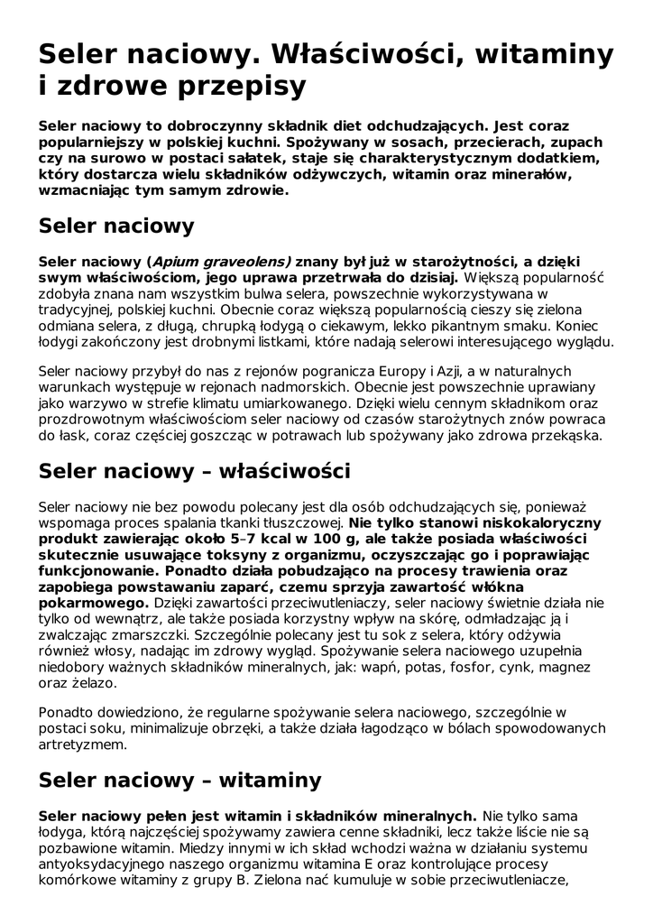 Seler naciowy. Właściwości, witaminy i zdrowe przepisy Seler naciowy to dobroczynny składnik diet odchudzających. Jest coraz popularniejszy w polskiej kuchni. Spożywany w sosach, przecierach, zupach czy na surowo w postaci sałatek, staje się charakterystycznym dodatkiem, który dostarcza wielu składników odżywczych, witamin oraz minerałów, wzmacniając tym samym zdrowie. Seler naciowy Seler naciowy (Apium graveolens) znany był już w starożytności, a dzięki swym właściwościom, jego uprawa przetrwała do dzisiaj. Większą popularność zdobyła znana nam wszystkim bulwa selera, powszechnie wykorzystywana w tradycyjnej, polskiej kuchni. Obecnie coraz większą popularnością cieszy się zielona odmiana selera, z długą, chrupką łodygą o ciekawym, lekko pikantnym smaku. Koniec łodygi zakończony jest drobnymi listkami, które nadają selerowi interesującego wyglądu. Seler naciowy przybył do nas z rejonów pogranicza Europy i Azji, a w naturalnych warunkach występuje w rejonach nadmorskich. Obecnie jest powszechnie uprawiany jako warzywo w strefie klimatu umiarkowanego. Dzięki wielu cennym składnikom oraz prozdrowotnym właściwościom seler naciowy od czasów starożytnych znów powraca do łask, coraz częściej goszcząc w potrawach lub spożywany jako zdrowa przekąska. Seler naciowy – właściwości Seler naciowy nie bez powodu polecany jest dla osób odchudzających się, ponieważ wspomaga proces spalania tkanki tłuszczowej. Nie tylko stanowi niskokaloryczny produkt zawierając około 5–7 kcal w 100 g, ale także posiada właściwości skutecznie usuwające toksyny z organizmu, oczyszczając go i poprawiając funkcjonowanie. Ponadto działa pobudzająco na procesy trawienia oraz zapobiega powstawaniu zaparć, czemu sprzyja zawartość włókna pokarmowego. Dzięki zawartości przeciwutleniaczy, seler naciowy świetnie działa nie tylko od wewnątrz, ale także posiada korzystny wpływ na skórę, odmładzając ją i zwalczając zmarszczki. Szczególnie polecany jest tu sok z selera, który odżywia również włosy, nadając im zdrowy wygląd. Spożywanie selera naciowego uzupełnia niedobory ważnych składników mineralnych, jak: wapń, potas, fosfor, cynk, magnez oraz żelazo. Ponadto dowiedziono, że regularne spożywanie selera naciowego, szczególnie w postaci soku, minimalizuje obrzęki, a także działa łagodząco w bólach spowodowanych artretyzmem. Seler naciowy – witaminy Seler naciowy pełen jest witamin i składników mineralnych. Nie tylko sama łodyga, którą najczęściej spożywamy zawiera cenne składniki, lecz także liście nie są pozbawione witamin. Miedzy innymi w ich skład wchodzi ważna w działaniu systemu antyoksydacyjnego naszego organizmu witamina E oraz kontrolujące procesy komórkowe witaminy z grupy B. Zielona nać kumuluje w sobie przeciwutleniacze, zwalczające wolne rodniki, które szkodliwe działają na komórki organizmu. Łodyga selera naciowego skrywa w sobie ważne dla prawidłowego funkcjonowania organizmu witaminy A, C oraz E, a także niewielkie pokłady kwasu foliowego. Seler naciowy – przepisy Istnieje cała gama przepisów uwzględniających dobroczynne warzywo, jakim jest seler naciowy. Polecany jest jako przekąska, ale równie dobrze sprawdza się w zupach, sosach czy sałatkach. Zobaczmy, jakie dania możemy przygotować na bazie selera naciowego. Przepis na zielony koktajl Składniki: parę łodyg selera naciowego mały ogórek (gruntowy) kiwi parę plasterków świeżego ananasa pół banana sok z cytryny Przygotowanie: selera naciowego kroimy na mniejsze kawałki. Resztę składników, jeśli jest to konieczne obieramy ze skórki i również kroimy. Wrzucamy wszystko do blendera i miksujemy. rozwiń Przepis na zupę z selerem naciowym Składniki: 500 g selera naciowego marchewka połowa pora mała pietruszka sól pieprz zioła łyżeczka masła dodatek węglowodanowy wedle uznania (np. makaron) Przygotowanie: marchewkę i pietruszkę obieramy, a następnie kroimy na małe kawałeczki. Pora należy pokroić w plasterki. Na rozgrzaną patelnię z masłem wrzucamy warzywa i lekko podsmażamy. Seler naciowy oczyszczamy i kroimy w drobne kawałki. Następnie wrzucamy do garnka z gorącą wodą, doprowadzamy do wrzenia i wrzucamy resztę warzyw z patelni. Po ugotowaniu (gdy warzywa będą miękkie), możemy ujednolicić konsystencję zupy przy pomocy blendera. Zupę doprawiamy solą, pieprzem oraz ziołami wedle uznania. rozwiń Przepis na sałatkę z selerem naciowym Składniki: łodyga selera naciowego kilka listków sałaty lodowej pomidorki koktajlowe czarne oliwki pierś z indyka 2 łyżki oliwy z oliwek sól pieprz Przygotowanie: kurczaka po doprawieniu podsmażamy na patelni. Selera naciowego po umyciu, kroimy na małe kawałki, a sałatę rwiemy na mniejsze części. Oliwki i pomidorki kroimy na pół. Warzywa wrzucamy do miseczki. Kładziemy na nich pokrojonego fileta z indyka, a całość skrapiamy oliwą z oliwek i doprawiamy solą oraz pieprzem. rozwiń Seler naciowy to zielone warzywo pełne zdrowia. Przez długi czas niedoceniane, jednak od pewnego czasu stosowane coraz częściej nie tylko na dietach z ograniczoną podażą energii. Dzięki swym bogatym właściwościom oraz składnikom odżywczym, zyskuje na znaczeniu w polskiej kuchni. Author: Aleksandra Musiał Link do artykułu: http://bonavita.pl/seler-naciowy-wlasciwosci-witaminy-i-zdroweprzepisy