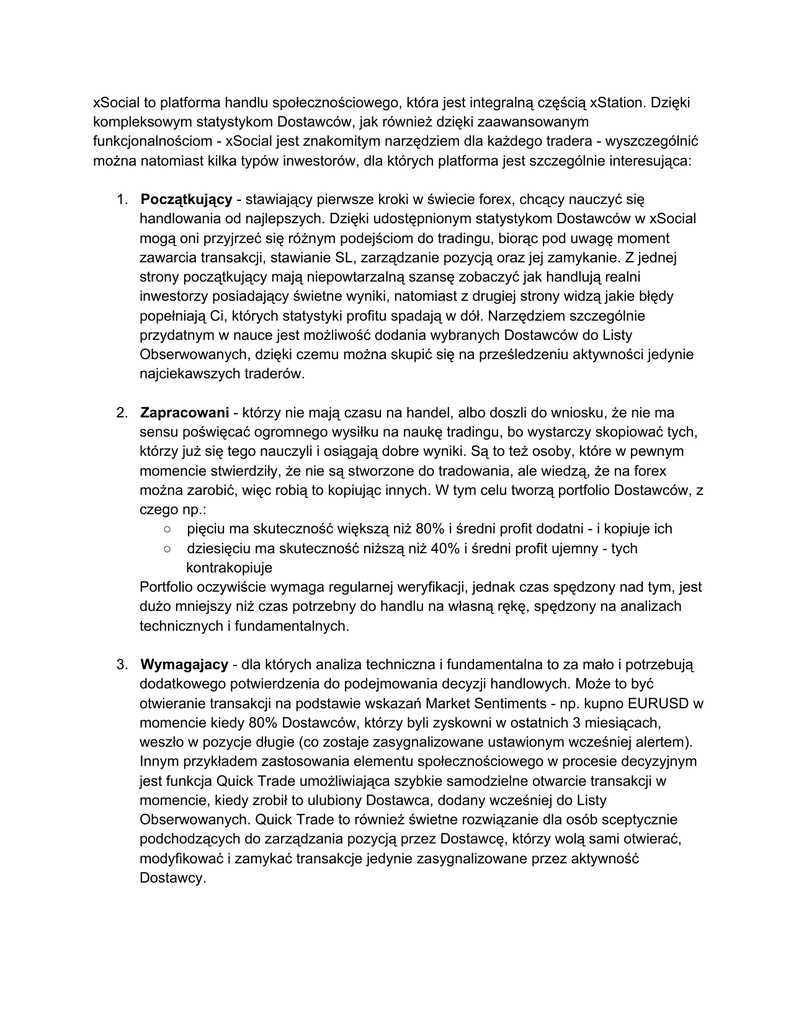 xSocial to platforma handlu społecznościowego, która jest integralną częścią xStation. Dzięki kompleksowym statystykom Dostawców, jak również dzięki zaawansowanym funkcjonalnościom  xSocial jest znakomitym narzędziem dla każdego tradera  wyszczególnić można natomiast kilka typów inwestorów, dla których platforma jest szczególnie interesująca: 1. Początkujący  stawiający pierwsze kroki w świecie forex, chcący nauczyć się handlowania od najlepszych. Dzięki udostępnionym statystykom Dostawców w xSocial mogą oni przyjrzeć się różnym podejściom do tradingu, biorąc pod uwagę moment zawarcia transakcji, stawianie SL, zarządzanie pozycją oraz jej zamykanie. Z jednej strony początkujący mają niepowtarzalną szansę zobaczyć jak handlują realni inwestorzy posiadający świetne wyniki, natomiast z drugiej strony widzą jakie błędy popełniają Ci, których statystyki profitu spadają w dół. Narzędziem szczególnie przydatnym w nauce jest możliwość dodania wybranych Dostawców do Listy Obserwowanych, dzięki czemu można skupić się na prześledzeniu aktywności jedynie najciekawszych traderów. 2. Zapracowani  którzy nie mają czasu na handel, albo doszli do wniosku, że nie ma sensu poświęcać ogromnego wysiłku na naukę tradingu, bo wystarczy skopiować tych, którzy już się tego nauczyli i osiągają dobre wyniki. Są to też osoby, które w pewnym momencie stwierdziły, że nie są stworzone do tradowania, ale wiedzą, że na forex można zarobić, więc robią to kopiując innych. W tym celu tworzą portfolio Dostawców, z czego np.: ○ pięciu ma skuteczność większą niż 80% i średni profit dodatni  i kopiuje ich ○ dziesięciu ma skuteczność niższą niż 40% i średni profit ujemny  tych kontrakopiuje Portfolio oczywiście wymaga regularnej weryfikacji, jednak czas spędzony nad tym, jest dużo mniejszy niż czas potrzebny do handlu na własną rękę, spędzony na analizach technicznych i fundamentalnych. 3. Wymagajacy  dla których analiza techniczna i fundamentalna to za mało i potrzebują dodatkowego potwierdzenia do podejmowania decyzji handlowych. Może to być otwieranie transakcji na podstawie wskazań Market Sentiments  np. kupno EURUSD w momencie kiedy 80% Dostawców, którzy byli zyskowni w ostatnich 3 miesiącach, weszło w pozycje długie (co zostaje zasygnalizowane ustawionym wcześniej alertem). Innym przykładem zastosowania elementu społecznościowego w procesie decyzyjnym jest funkcja Quick Trade umożliwiająca szybkie samodzielne otwarcie transakcji w momencie, kiedy zrobił to ulubiony Dostawca, dodany wcześniej do Listy Obserwowanych. Quick Trade to również świetne rozwiązanie dla osób sceptycznie podchodzących do zarządzania pozycją przez Dostawcę, którzy wolą sami otwierać, modyfikować i zamykać transakcje jedynie zasygnalizowane przez aktywność Dostawcy. 4. Skuteczni  chcący zarabiać dodatkowo na udostępnianiu sygnałów transakcyjnych. Nawet najlepsze wyniki z samego handlu na forex nie są przeszkoda w czerpaniu jeszcze większych zysków. Tym bardziej, że wynagrodzenie Dostawcy może znacznie przewyższać profit z własnego tradingu  wyobraźmy sobie inwestora, który ma rachunek z minimalnym depozytem i osiąga niewielkie stabilne zyski (np. kilkaset PLN miesięcznie), ale przy stosunkowo niskim ryzyku, natomiast gro przychodów notuje z prowizji od udostępnianych transakcji (np. kilka tysięcy USD miesięcznie). Dostawca, który ma dobre rezultaty na jednym instrumencie może dążyć do maksymalizacji zysków z prowizji, poprzez handel również na innych instrumentach, bowiem wynagradzany jest za skopiowany wolumen na każdym instrumencie. Dzięki bogactwu funkcjonalności, które są efektem rozmów Product Managera z dziesiątkami inwestorów, w celu ciągłego doskonalenia produktu, platforma xSocial to świetne narzędzie dla wszystkich typów inwestorów na rynku forex  zarówno tych początkująych, jak i tych doświadczonych. Każdy znajdzie tu coś dla siebie  natomiast częścią wspólną są oczywiście pieniądze, które: Kopiujący mogą zarobić kopiując innych, natomiast Dostawcy otrzymują z prowizji w momencie kiedy ich strategie są kopiowane. Ponieważ społeczność xSocial jest otwarta  każdy użytkownik xStation (oferowanego przez XTB oraz innych partnerów X Open Hub) może spróbować swoich sił jako Dostawca i Kopiujący  wystarczy tylko zalogować się do platformy tradingowej i przełączyć perspektywę na xSocial! Dowiedz się więcej na: https://www.xsocial.eu/pl/index.html