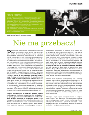 felieton Dr hab. Katarzyna Popiołek, prof. SWPS Dziekan Wydzialu Zamiejscowego Szkoly Wyzszej Psychologii Spolecznej w Katowicach Jej zainteresowania naukowe koncentrują się wokół problematyki relacji międzyludzkich w bliskich związkach, sposobów udzielania pomocy i wsparcia, zachowań w sytuacjach kryzysowych. Prowadzi także badania nad percepcją czasu i jej konsekwencjami. Lubi także przekładać wiedzę naukowa na Artystka niezwykle cenionadziałalność ze względu na nieprzeciętny talent język praktyki: prowadzi popularyzatorską i szkoleniową. Renata Przemyk muzyczny, niepowtarzalny głos i indywidualność artystyczną. Większość jej płyt uzyskała status złotych. Z wykształcenia jest bohemistką. Urodziła się w Bielsku-Białej, studiowała w Katowicach. Na scenie oficjalnie od 1989 r., kiedy to zdobyła Grand Prix Festiwalu Piosenki Studenckiej w Krakowie. Pierwszą swoją płytę wydała w 1990 r., wraz z zespołem Ya Hozna. poranek przerywa W 1991 ogodny r. rozpoczęła solową karierę. ostry dźwięk telefonu. Pani ZosiaWoolf, rzucaMarqueza na bok płukane właśnie jarzyny Lubi Virginię i Yourcenar, ale też Bjorki ipodbiega Richarda aparatu. teatru, kompozytorka, czasem aktorka. Galliano.do Fascynatka - Słucham? Marzy o podróży dookoła świata. ŻYCZLIWY P - Czy jest mąż? - pyta obcy głos w słuchawce. - Nie ma, jest w pracy - informuje życzliwie Pani Zosia. tekst: Renata Przemyk foto: Elżbieta Schonfeld - Tak? To niech pani zapyta, gdzie był naprawdę i z kim! - grzmi złowieszczo nieznajomy. Pani Zosia świadoma, jak należy traktować anonimowych donosicieli, nie wdaje się w żadne dyskusje, z trzaskiem odkłada słuchawkę komentując głośno „Jakiś maniak, ot co!” i kieruje się z powrotem w stronę kuchni. Ale dobry nastrój prysł. Nie dlatego, że Pani Zofia nie ufa mężowi. Przykre jest to, że ktoś postanowił zburzyć jej spokój, że chce ją osaczyć, wepchnąć w sieć podejrzeń. P Nasz X to ktoś, kto czuje się gorszy od Was i chce was ściągnąć do swego poziomu, bo ma nadzieję, że wtedy poczuje się lepiej. Prawdopodobnie zazdrości Wam tego, co posiadacie, uważa, że nie zasłużyliście, by mieć aż tyle i chce, abyście wprawieni przez niego w stan niepokoju i psychicznego dyskomfortu, nie mieli siły i ochoty na cieszenie się swymi osiągnięciami. Być może ma do Was o coś pretensje i mści się w ten ukryty sposób. Na pewno jednak poprzez te właśnie anonimy chce zyskać władzę nad wami, pozostając poza wszelką kontrolą. To on będzie decydował, czy dziś pozwoli wam na dobry humor czy też nie, czy będziecie ufni wobec otaczającego was świata, czy pełni lęku i podejrzeń. Nie ma przebacz! Jak przystało na - rozsądną kobietę, pani Zofia postarzepraszam słowo twarde, szeleszczące i z wielkim nawiatrudem przestać zajmować się tymgardło. incydentem. Po kilku przechodzące przez Ale jakże niedniach telefondo jednak powtarza, się, potem znowu i znozbędne normalnego funkcjonowania w grupie, wu. Kiedy w piątek mąż nieoczekiwanie spóźnia się dość społeczeństwie, rodzinie czy innym związku. W sprawach solidnie na obiad, pani Zofia jest – wbrew swej woli – małych, kurtuazyjnych i tych większych, aż do wagi światospięta i pełna złych przeczuć. Żądło zostało wbite, jad wej i narodowej. Nie ma na świecie osoby, która by tego słodziała. wa nie wymówiła (poza niemowlakami może), choćby po to, żeby swoje wejście do tramwaju (kiedy Pan zasygnalizować Stanisław wolno wraca z pracy rozkoszując siętłok słonecznym dniem. W bramie przystaje przy skrzynce na na schodach i dzwonek już) domu czy żeby się wcisnąć w kolejkę, listy i wznamy nastroju radosnego oczekiwania wieści go od ale wielu ludzi, którzy niezwykle rzadkonaużywają sięga po białą kopertę. Ze zdziwieniem czyta, co zznajomych intencją prośby o wybaczenie. Znam też takich, których następuje: „Czy Pan wie, że Pańska żona spotyka się z pewtrzeba przepraszać wciąż, a i tak im nie dość. Skłonność do nym przystojnym i majętnym panem. Proszę zainteresować nadużyć leży w ludzkiej naturze. Tak jak skłonność do własię tą sprawą, póki nie jest za późno. Nieznany Panu życzliwy dzy. okazją, do która czyniPan złodzieja i apetytem, X”. To Notak, takjak- zmruczy siebie Stanisław - jakiś który rośnie w miarę jedzenia. Ci, co mają najwięcej władzy, początkujący i mało doświadczony ten autorzyna. Gdzie aklasyczne raczej ci,„uprzejmie którym nadonoszę”. niej najbardziej zależy, nie przepraNie tracąc kontenansu zwija list w trąbkę i wciska kieszeń. Drugi, podobny wywołuje szają! Uważają, że towoznaka słabości. Są tacy,list którym się zniecierpliwienie, trzecimógłby irytację. czuje Są się itrochę wydaje, że ich autorytet naPan tymStaś ucierpieć. tacy, mniej mniej szczęśliwy niż przedtem. Skrzynka pocztowa którzy kochają (tobył o przepraszaniu w związkach) i luprzestaje kojarzyć się z miłą niespodzianką, staje się bią mieć przewagę. Albo tacy, którym się to kojarzy z porażprzedmiotem budzącym napięcie. I ta myśl, odpychana ką i brakiem racji, czyli nie byciu we wszystkim najlepszym. ale powracająca: „Nie ma dymu bez ognia, w każdej Są też tacy, którzy przepraszają notorycznie, za wszystko, plotce jest źdźbło prawdy”. na wszelki wypadek, bo czują się gorsi, za zawinione i niezawinione, to, że żyją. I bywa to irytujące reakcje jak to Pani Zofio,za Panie Stanisławie - równie stop! Państwa pierwsze.Choć z tymi drugimi zdecydowanie łatwiej rzucony żyć. świadczą o tym, że połknęliście obrzydliwy haczyk z rozmachem przez „życzliwego”, który ciągnie was teraz na wędce dokładnie tam, zamierzył. Zamiastpodłoże się mu Zdolność przyznania się gdzie do błędu ma głębokie poddawać i szukać dziury w całym, zastanówcie się, dlaczego psychologiczne. Musi temu 