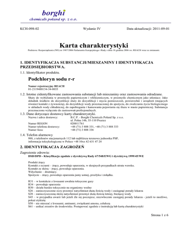 KCH-098-02 Wydanie IV Data aktualizacji: 2011-09-01 Karta charakterystyki Podstawa: Rozporządzenie (WE) nr 1907/2006 Parlamentu Europejskiego i Rady z dnia 18 grudnia 2006 ws. REACH wraz ze zmianami. 1. IDENTYFIKACJA SUBSTANCJI/MIESZANINY I IDENTYFIKACJA PRZEDSIĘBIORSTWA. 1.1. Identyfikator produktu. Podchloryn sodu r-r Numer rejestracyjny REACH 01-2119488154-34-0035 1.2. Istotne zidentyfikowane zastosowania substancji lub mieszaniny oraz zastosowania odradzane. Służy do wybielania w przemyśle papierniczym i włókienniczym, w przemyśle chemicznym jako utleniacz. Jako składnik środków do dezynfekcji służy do dezynfekcji i mycia pomieszczeń, powierzchni i urządzeń (mających również kontakt z żywnością), do dezynfekcji wody przeznaczonej do spożycia, do zwalczania życia biologicznego w układach wody chłodniczej, do zapobiegania i hamowania pojawiania się śluzu w masie papierniczej. Substancja przeznaczona wyłącznie do zastosowań profesjonalnych. 1.3. Dane dotyczące dostawcy karty charakterystyki. Nazwa i adres dostawcy: Numer REGON Numer telefonu dostawcy: Numer faxu: B.C.P. - Borghi Chemicals Poland Sp. z o.o. ul. Polna 14b, 55-110 Prusice 020011761 +48 (71) 3 888 331, +48 (71) 3 888 333 +48 (71) 3 888 336 1.4. Telefon alarmowy 988, z telefonów stacjonarnych 112 lub najbliższa terenowa jednostka PSP, informacja toksykologiczna w Polsce +48 10xx 42 631 47 24 2. IDENTYFIKACJA ZAGROŻEŃ Zagrożenie zdrowia: DSD/DPD - Klasyfikacja zgodnie z dyrektywą Rady 67/548/EWG i dyrektywą 1999/45/WE Produkt żrący Kontakt z oczami – żrący, powoduje oparzenia, w skrajnych przypadkach utrata wzroku. Kontakt ze skórą – żrący, powoduje oparzenia. Wdychanie – drażniący. Spożycie – żrący, powoduje oparzenia jamy ustnej, przełyku i żołądka. R31 – w kontakcie z kwasami uwalnia toksyczne gazy R34 – powoduje oparzenia R50 – działa bardzo toksycznie na organizmy wodne S26 – zanieczyszczone oczy przemyć natychmiast dużą ilością wody i zasięgnąć porady lekarza S28 – zanieczyszczoną skórę natychmiast przemyć dużą ilością letniej, bieżącej wody S45 – w przypadku awarii lub jeżeli źle się poczujesz, niezwłocznie zasięgnij porady lekarza - jeżeli to możliwe, pokaż etykietę S50 – nie mieszać z kwasami, aminami, związkami amonu, celulozą S61 – unikać zrzutów do środowiska. Postępować zgodnie z instrukcją lub kartą charakterystyki Strona 1 z 6 KCH-098-02 Wydanie IV C Żrąca Data aktualizacji: 2011-09-01 N Niebezpieczna dla środowiska CLP - Klasyfikacja zgodnie z rozporządzeniem (WE) nr 1272/2008 Met. Corr. 1 H290 Skin Corr. 1B H314 Eye Dam. 1 H318 STOT SE 3 H335 Aquatic Acute 1 H400 Contact with acids liberates toxic gas EUH031 ≥ 5% Piktogramy wskazujące rodzaj zagrożenia: GHS05 GHS07 Hasło ostrzegawcze: GHS09 Niebezpieczeństwo Składniki określające niebezpieczeństwo do etykietowania: brak Zwroty wskazujące rodzaj zagrożenia: H290 – Może powodować korozję metali. H314 – Powoduje poważne oparzenia skóry i uszkodzenia oczu. H335 – Może powodować podrażnienia dróg oddechowych. H400 – Działa bardzo toksycznie na organizmy wodne. EUH031 – W kontakcie z kwasami uwalnia toksyczne gazy. Zwroty wskazujące środki ostrożności: P260 – Nie wdychać pyłu/par/rozpylonej cieczy. P273 – Unikać uwolnienia do środowiska. P280 – Stosować rękawice ochronne / odzież ochronną / ochronę oczu / ochronę twarzy. P310 – W PRZYPADKU DOSTANIA SIĘ NA SKÓRĘ (lub na włosy): Natychmiast usunąć/zdjąć całą zanieczyszczoną odzież. Spłukać skórę pod strumieniem wody/prysznicem. P305+P351+P338 – W PRZYPADKU DOSTANIA SIĘ DO OCZU: Ostrożnie płukać wodą przez kilka minut. Wyjąć soczewki kontaktowe, jeżeli są i można je łatwo usunąć. Nadal płukać. P310 – Natychmiast skontaktować się z OŚRODKIEM ZATRUĆ lub lekarzem. P403+P233 – Przechowywać w dobrze wentylowanym miejscu. Przechowywać pojemnik szczelnie zamknięty. Własności niebezpieczne: W kontakcie z kwasami uwalnia toksyczne gazy. Zagrożenie środowiska: Działa szkodliwie na organizmy wodne ze względu na zmianę pH. Strona 2 z 6 KCH-098-02 Wydanie IV Data aktualizacji: 2011-09-01 3. SKŁAD/INFORMACJA O SKŁADNIKACH Nazwa Podchloryn sodu CAS, WE 7681-52-9 231-668-3 Zawartość min. 150 g Cl2 /dm3 Klasyfikacja zgodna z DSD/DPD C, R34, R31 Klasyfikacja zgodna z CLP Met. Corr. 1 H290 Skin Corr. 1B H314 Eye Dam. 1 H318 STOT SE 3 H335 Aquatic Acute 1 H400 4. ŚRODKI PIERWSZEJ POMOCY. Wdychanie: Wyprowadzić zatrutego z miejsca zagrożenia. Chronić przed utratą ciepła. W przypadku zatrzymania oddechu zastosować sztuczne oddychanie. Wezwać natychmiast pomoc medyczną. Kontakt ze skórą: Natychmiast przemywać dużą ilością wody. Usunąć odzież podczas mycia pod prysznicem. Nie stosować środków zobojętniających. Usunąć okulary ochronne, aby nie wprowadzić materiału do oka. Nie stosować olejków ani płynów kosmetycznych do zmywania. Chronić przed utratą ciepła. Wezwać natychmiast pomoc medyczną. Kontakt z oczami: Myj wodą oczy natychmiast i kontynuuj płukanie przez 30 minut przy otwartych powiekach obracając gałkami ocznymi. Wezwać natychmiast pomoc medyczną. Kontynuować mycie do momentu kiedy lekarz zaleci zaprzestanie mycia. Spożycie: W przypadku spożycia nie wywoływać wymiotów. Natychmiast podać poszkodowanemu do picia dużą ilość wody. Nie podawać środków zobojętniających. Wezwać natychmiast pomoc medyczną. 5. POSTĘPOWANIE W PRZYPADKU POŻARU Szczególne zagrożenia związane z substancją lub mieszaniną: Nie palna ciecz. Produkt rozkłada się z wydzieleniem tlenu, chloru, dwutlenku chloru. W ogniu wydzielają się drażniące gazy, pary i dymy. Środki gaśnicze: W przypadku pożaru stosować środki gaśnicze dostosowane do gaszenia palącego się otoczenia. Informacje dla straży pożarnej: Nosić nadciśnieniowy, samodzielny aparat do oddychania i o