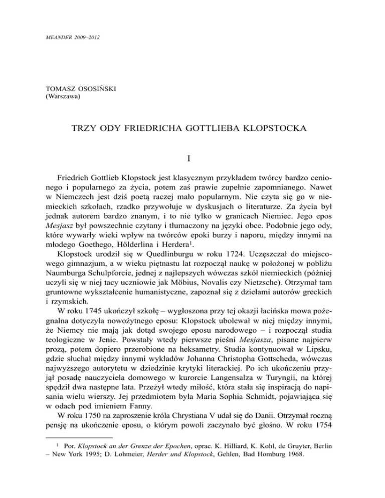 Meander 2009–2012 Tomasz Ososiński (Warszawa) TRZY ODY FRIEDRICHA GOTTLIEBA KLOPSTOCKA I Friedrich Gottlieb Klopstock jest klasycznym przykładem twórcy bardzo cenionego i popularnego za życia, potem zaś prawie zupełnie zapomnianego. Nawet w Niemczech jest dziś poetą raczej mało popularnym. Nie czyta się go w niemieckich szkołach, rzadko przywołuje w dyskusjach o literaturze. Za życia był jednak autorem bardzo znanym, i to nie tylko w granicach Niemiec. Jego epos Mesjasz był powszechnie czytany i tłumaczony na języki obce. Podobnie jego ody, które wywarły wieki wpływ na twórców epoki burzy i naporu, między innymi na młodego Goethego, Hölderlina i Herdera1. Klopstock urodził się w Quedlinburgu w roku 1724. Uczęszczał do miejscowego gimnazjum, a w wieku piętnastu lat rozpoczął naukę w położonej w pobliżu Naumburga Schulpforcie, jednej z najlepszych wówczas szkół niemieckich (później uczyli się w niej tacy uczniowie jak Möbius, Novalis czy Nietzsche). Otrzymał tam gruntowne wykształcenie humanistyczne, zapoznał się z dziełami autorów greckich i rzymskich. W roku 1745 ukończył szkołę – wygłoszona przy tej okazji łacińska mowa pożegnalna dotyczyła nowożytnego eposu: Klopstock ubolewał w niej między innymi, że Niemcy nie mają jak dotąd swojego eposu narodowego – i rozpoczął studia teologiczne w Jenie. Powstały wtedy pierwsze pieśni Mesjasza, pisane najpierw prozą, potem dopiero przerobione na heksametry. Studia kontynuował w Lipsku, gdzie słuchał między innymi wykładów Johanna Christopha Gottscheda, wówczas najwyższego autorytetu w dziedzinie krytyki literackiej. Po ich ukończeniu przyjął posadę nauczyciela domowego w kurorcie Langensalza w Turyngii, na której spędził dwa następne lata. Przeżył wtedy miłość, która stała się inspiracją do napisania wielu wierszy. Jej przedmiotem była Maria Sophia Schmidt, pojawiająca się w odach pod imieniem Fanny. W roku 1750 na zaproszenie króla Chrystiana V udał się do Danii. Otrzymał roczną pensję na ukończenie eposu, o którym powoli zaczynało być głośno. W roku 1754 1 Por. Klopstock an der Grenze der Epochen, oprac. K. Hilliard, K. Kohl, de Gruyter, Berlin – New York 1995; D. Lohmeier, Herder und Klopstock, Gehlen, Bad Homburg 1968. Trzy ody Friedricha Gottlieba Klopstocka 155 poślubił poznaną w Hamburgu Margaretę (Metę) Moller, opiewaną w wierszach pod pseudonimem Zidli (w ówczesnej grafii „Cidli”). Meta zmarła cztery lata później podczas porodu, Klopstock czuł się z nią jednak jeszcze przez długi czas bardzo związany. Jej wiersze i listy włączył do wydania swoich dzieł zebranych. Dopiero w roku 1791 ożenił się powtórnie: z siostrzenicą Mety, Johanną Elisabeth von Winthem. Pierwszy pobyt Klopstocka w Kopenhadze trwał trzy lata. W roku 1762 udał się do Danii po raz kolejny, gdzie tym razem został dłużej, bo do roku 1771. Wywarł wtedy duży wpływ na życie umysłowe Danii. W roku 1773 ukończył ostatecznie Mesjasza, swoje największe dzieło. Epos napisany został heksametrem, które to metrum Klopstock jako pierwszy wprowadził do poezji niemieckiej. Zwrócił się następnie ku twórczości dramatycznej, pisał dramaty o tematyce głównie patriotycznej (między innymi Hermanns Schlacht). Pisał też utwory prozą (Die deutsche Gelehrtenrepublik) i liczne ody: o tematyce politycznej (między innymi Sie und nicht wir, Kennet euch selbst), miłosnej (An Cidli, Das Rosenband) oraz religijnej (Der Tod, Der Vorhof und der Tempel, Dem Unendlichen). W następnych latach mieszkał między innymi w Karlsruhe, dokąd udał się na zaproszenie margrabiego Karla Friedricha von Baden. Ostatnie lata życia spędził w Hamburgu (znajdującym się wtedy na granicy niemiecko-duńskiej), gdzie w roku 1803 zmarł2. Pogrzeb Klopstocka zgromadził tłumy stając się czymś w rodzaju patriotycznej manifestacji. O jego popularności za życia zaś świadczy choćby to, że był jednym z trzech pisarzy niemieckojęzycznych (obok Schillera i Pestalozziego), którzy po wybuchu Rewolucji otrzymali honorowe obywatelstwo Francji. Jego utwory, zwłaszcza Mesjasz, były powszechnie czytane przez współczesnych. Mesjasz był przekładany na języki obce jeszcze przed ukończeniem ostatecznej wersji, w tym również na łacinę (przez Ludwiga Bertrama Neumanna w roku 1770). Goethe swojej fascynacji Klopstockiem dał wyraz między innymi w Cierpieniach młodego Wertera. W Zmyśleniu i prawdzie zaś pisał: Ale teraz miał nadejść czas, gdy geniusz poetycki sam dostrzeże swoją obecność, sam się określi i będzie umiał stworzyć podstawy swojej niezależności. Klopstock miał wszystko, czego potrzeba, by zapoczątkować tę epokę3. Przyczyny popularności Klopstocka były jednak mimo wszystko częściowo pozaliterackie. Zdawali sobie z tego sprawę już niektórzy współcześni. Lessing pisał: Wer wird nicht einen Klopstock loben? Doch wird ihn jeder lesen? – Nein! Wir wollen weniger erhoben und fleißiger gelesen sein4. Por. K. Kohl, Friedrich Gottlieb Klopstock, Metzler, Stuttgart – Weimar 2000, s. 22–37. Johann Wolfgang Goethe, Sämtliche Werke, t. XIV, Deutscher Klassiker Verlag, Frankfurt am Main 1995, s. 434. 4 „Któż nie pochwali Klopstocka? Ale czy sam będzie go czytał? – Nie. Wolelibyśmy być mniej chwaleni, a za to pilniej czytani”. Cytat za: Friedrich Gottlieb Klopstock, Werke und Briefe. Historisch-Kritische Ausgabe, t. II, de Gruyter, Berlin – New York 2001, s. 321. 2 3 156 Tomasz Ososiński Chwalono go za religijne oraz patriotyczne zaangażowanie, nie zawsze przy tym jednak czytano. W XIX wieku został prawie zupełnie zapomniany. W XX wieku z uwagi na narodowy charakter jego twórczości próbowali wypromować go naziści, co na dłuższą metę oczywiście nie przysporzyło mu czytelników. Wydaje się, że jego XX-wieczna niepopularność wynika jednak co najmniej po części z przyczyn r