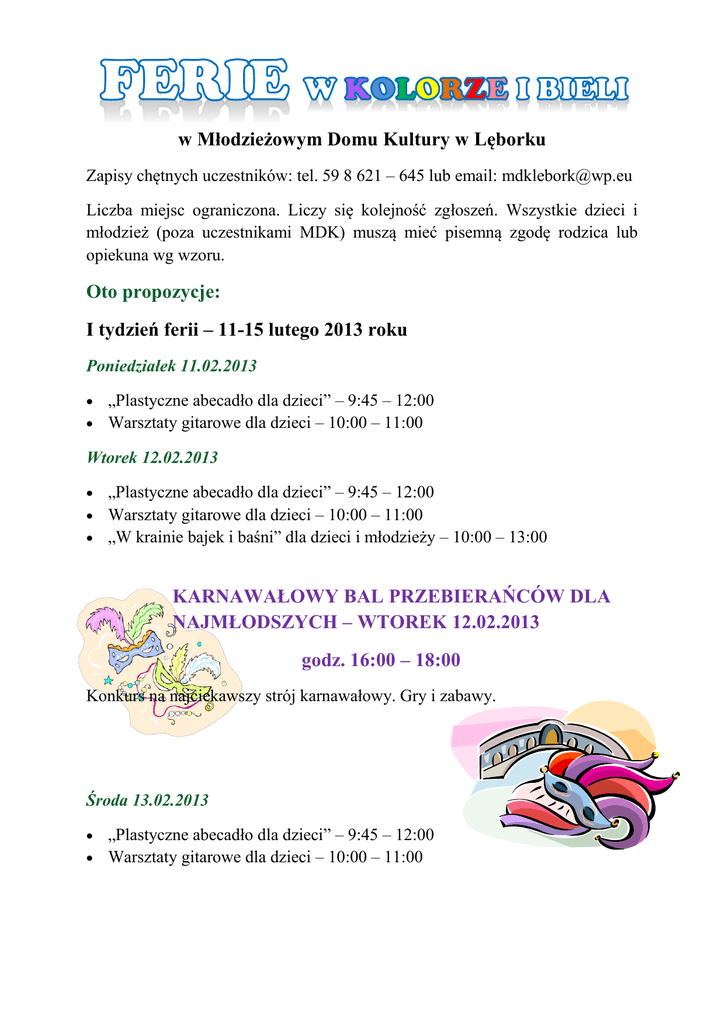 w Młodzieżowym Domu Kultury w Lęborku Zapisy chętnych uczestników: tel. 59 8 621 – 645 lub email: [email protected] Liczba miejsc ograniczona. Liczy się kolejność zgłoszeń. Wszystkie dzieci i młodzież (poza uczestnikami MDK) muszą mieć pisemną zgodę rodzica lub opiekuna wg wzoru. Oto propozycje: I tydzień ferii – 11-15 lutego 2013 roku Poniedziałek 11.02.2013 „Plastyczne abecadło dla dzieci” – 9:45 – 12:00 Warsztaty gitarowe dla dzieci – 10:00 – 11:00 Wtorek 12.02.2013 „Plastyczne abecadło dla dzieci” – 9:45 – 12:00 Warsztaty gitarowe dla dzieci – 10:00 – 11:00 „W krainie bajek i baśni” dla dzieci i młodzieży – 10:00 – 13:00 KARNAWAŁOWY BAL PRZEBIERAŃCÓW DLA NAJMŁODSZYCH – WTOREK 12.02.2013 godz. 16:00 – 18:00 Konkurs na najciekawszy strój karnawałowy. Gry i zabawy. Środa 13.02.2013 „Plastyczne abecadło dla dzieci” – 9:45 – 12:00 Warsztaty gitarowe dla dzieci – 10:00 – 11:00 Czwartek 14.02.2013 Warsztaty gitarowe dla dzieci – 10:00 – 11:00 „Gramy w czerwone” – Walentynki organizowane przez Samorząd Wychowanków - 16:00 – 18:00 Każdy uczestnik powinien mieć czerwony element stroju (koszulka, spodnie, sukienka, kapelusz, rękawiczki). Gry w tym: wycinanie serduszek, robienie laurek dla swojej „Walentynki”. Piątek 15.02.2013 „Plastyczne abecadło dla dzieci” – 9:45 – 12:00 Warsztaty gitarowe dla dzieci – 10:00 – 11:00 Akrobatyka dla dzieci – 10:00 – 11:30 Akrobatyka dla młodzieży – 11:45 – 14:00 II tydzień ferii – 18-22 lutego 2013 roku Poniedziałek 18.02.2013 Warsztaty plastyczne „Zimowe abstrakcje” org. Stowarzyszenie „TAK” – 11:00 – 13:00 Wtorek 19.02.2013 „Drewno, gwóźdź i młotek – konstrukcje drewniane” – 9:00 – 11:30 „Zabawa w teatr dla dzieci i młodzieży” – 10:00 – 13:00 Środa 20.02.2013 „Drewno, gwóźdź i młotek – konstrukcje drewniane” – 9:00 – 11:30 Czwartek 21.02.2013 Drewno, gwóźdź i młotek – konstrukcje drewniane” – 9:00 – 11:30 „Jak zostać aktorem – ćwiczenia z dykcji” – 10:00 – 13:45 Piątek 22.02.2013 Drewno, gwóźdź i młotek – konstrukcje drewniane” – 9:00 – 11:30 Akrobatyka dla dzieci – 10:00 – 11:30 Akrobatyka dla młodzieży – 11:45 – 14:00 ZGODA NA UDZIAŁ W FERIACH MDK Wyrażam zgodę na udział ……………………………………………………………………… zamieszkałego w ……………………………………………………………………………….. Tel. kontaktowy rodzica lub opiekuna: …………………………………………….. ………………………………….. Data ……………………….. Podpis rodzica lub opiekuna
