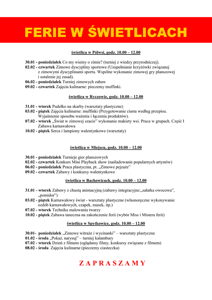 świetlica w Półwsi, godz. 10.00 – 12.00 30.01 - poniedziałek Co my wiemy o zimie? (turniej z wiedzy przyrodniczej). 02.02 - czwartek Zimowe dyscypliny sportowe (Uzupełnianie krzyżówki związanej z zimowymi dyscyplinami sportu. Wspólne wykonanie zimowej gry planszowej i ustalenie jej zasad). 06.02 - poniedziałek Turniej zimowych zabaw 09.02 - czwartek Zajęcia kulinarne: pieczemy muffinki. świetlica w Ryczowie, godz. 10.00 – 12.00 31.01 - wtorek Pudełko na skarby (warsztaty plastyczne) 03.02 - piątek Zajęcia kulinarne: muffinki (Przygotowanie ciasta według przepisu. Wyjaśnienie sposobu ważenia i łączenia produktów). 07.02 - wtorek „Świat w zimowej szacie” wykonanie makiety wsi. Praca w grupach. Część I Zabawa karnawałowa 10.02 - piątek Serca i lampiony walentynkowe (warsztaty) świetlica w Miejscu, godz. 10.00 – 12.00 30.01 - poniedziałek Turnieje gier planszowych 02.02 - czwartek Konkurs Mini Playback show (naśladowanie popularnych artystów) 06.02 - poniedziałek Praca plastyczna, pt. „Zimowe pejzaże” 09.02 - czwartek Zabawy i konkursy walentynkowe świetlica w Bachowicach, godz. 10.00 – 12.00 31.01 - wtorek Zabawy z chustą animacyjną (zabawy integracyjne:„sałatka owocowa”, „pomidor”) 03.02 - piątek Karnawałowy świat - warsztaty plastyczne (własnoręczne wykonywanie ozdób karnawałowych, czapek, masek, itp.) 07.02 - wtorek Technika malowania twarzy 10.02 - piątek Zabawa taneczna na zakończenie ferii (wybór Miss i Mistera ferii) świetlica w Spytkowice, godz. 10.00 – 12.00 30.01- poniedziałek „Zimowe witraże i wycinanki” – warsztaty plastyczne 01.02 - środa „Pokaż, narysuj” – turniej kalambury 07.02 - wtorek Dzień z filmem (oglądamy filmy, konkursy związane z filmem) 08.02 - środa Zajęcia kulinarne (pieczemy ciasteczka) ZAPRASZAMY