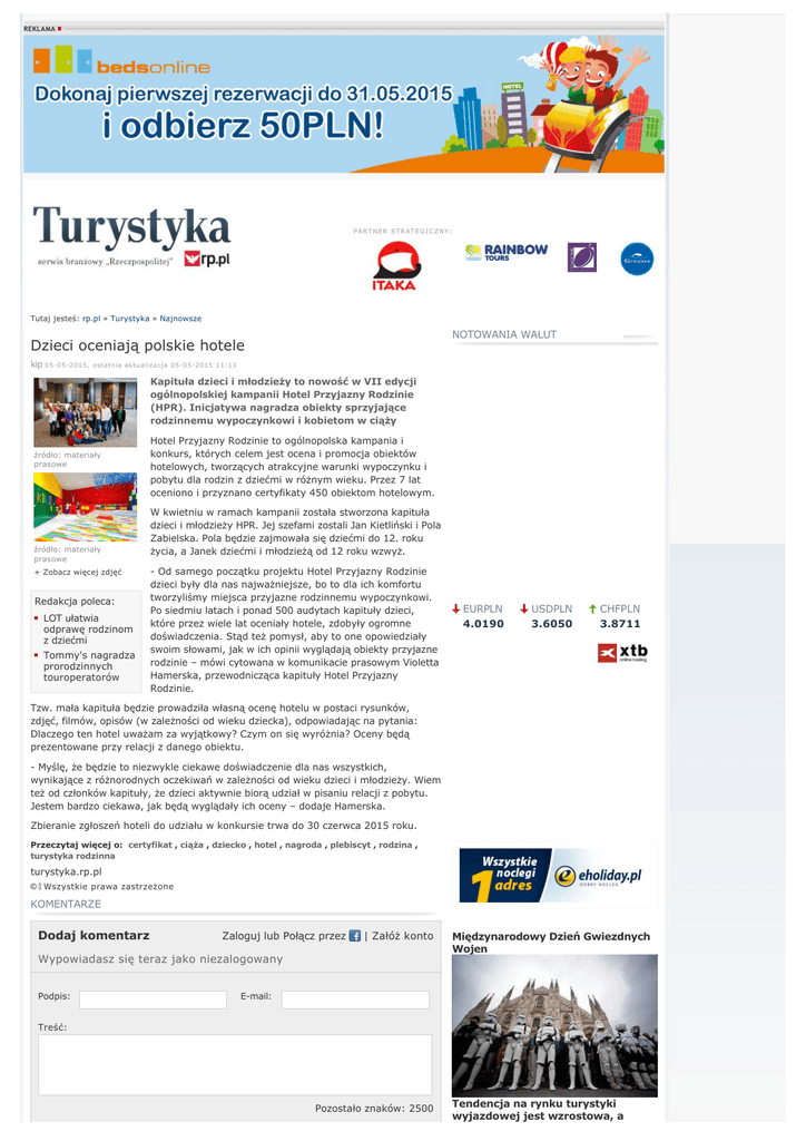REKLAMA PARTNER STRATEGICZNY: Tutaj jesteś: rp.pl » Turystyka » Najnowsze NOTOWANIA WALUT Dzieci oceniają polskie hotele kip 05-05-2015, ostatnia aktualizacja 05-05-2015 11:13 Kapituła dzieci i młodzieży to nowość w VII edycji ogólnopolskiej kampanii Hotel Przyjazny Rodzinie (HPR). Inicjatywa nagradza obiekty sprzyjające rodzinnemu wypoczynkowi i kobietom w ciąży źródło: materiały prasowe źródło: materiały prasowe + Zobacz więcej zdjęć Redakcja poleca: LOT ułatwia odprawę rodzinom z dziećmi Tommy's nagradza prorodzinnych touroperatorów Hotel Przyjazny Rodzinie to ogólnopolska kampania i konkurs, których celem jest ocena i promocja obiektów hotelowych, tworzących atrakcyjne warunki wypoczynku i pobytu dla rodzin z dziećmi w różnym wieku. Przez 7 lat oceniono i przyznano certyfikaty 450 obiektom hotelowym. W kwietniu w ramach kampanii została stworzona kapituła dzieci i młodzieży HPR. Jej szefami zostali Jan Kietliński i Pola Zabielska. Pola będzie zajmowała się dziećmi do 12. roku życia, a Janek dziećmi i młodzieżą od 12 roku wzwyż. - Od samego początku projektu Hotel Przyjazny Rodzinie dzieci były dla nas najważniejsze, bo to dla ich komfortu tworzyliśmy miejsca przyjazne rodzinnemu wypoczynkowi. Po siedmiu latach i ponad 500 audytach kapituły dzieci, które przez wiele lat oceniały hotele, zdobyły ogromne doświadczenia. Stąd też pomysł, aby to one opowiedziały swoim słowami, jak w ich opinii wyglądają obiekty przyjazne rodzinie – mówi cytowana w komunikacie prasowym Violetta Hamerska, przewodnicząca kapituły Hotel Przyjazny Rodzinie. EURPLN 4.0190 USDPLN 3.6050 CHFPLN 3.8711 Tzw. mała kapituła będzie prowadziła własną ocenę hotelu w postaci rysunków, zdjęć, filmów, opisów (w zależności od wieku dziecka), odpowiadając na pytania: Dlaczego ten hotel uważam za wyjątkowy? Czym on się wyróżnia? Oceny będą prezentowane przy relacji z danego obiektu. - Myślę, że będzie to niezwykle ciekawe doświadczenie dla nas wszystkich, wynikające z różnorodnych oczekiwań w zależności od wieku dzieci i młodzieży. Wiem też od członków kapituły, że dzieci aktywnie biorą udział w pisaniu relacji z pobytu. Jestem bardzo ciekawa, jak będą wyglądały ich oceny – dodaje Hamerska. Zbieranie zgłoszeń hoteli do udziału w konkursie trwa do 30 czerwca 2015 roku. Przeczytaj więcej o: certyfikat , ciąża , dziecko , hotel , nagroda , plebiscyt , rodzina , turystyka rodzinna turystyka.rp.pl © Wszystkie prawa zastrzeżone KOMENTARZE Dodaj komentarz Zaloguj lub Połącz przez | Załóż konto Wypowiadasz się teraz jako niezalogowany Podpis: Międzynarodowy Dzień Gwiezdnych Wojen E-mail: Treść: Pozostało znaków: 2500 Tendencja na rynku turystyki wyjazdowej jest wzrostowa, a klienci biur podróży dobrze zabezpieczeni - mówi prezes Alfa Star Sylwester Strzylak Akceptuję REGULAMIN SERWISU. Komentarze nie spełniające zasad zawartych w regulaminie nie będą publikowane. Dodaj komentarz REKOMENDOWANE NAJNOWSZE NAJSTARSZE Brak komentarzy. Bądź pierwszy! Polska z drona - Pałac Zamoyskich w Kozłówce PARTNER STRATEGICZNY: REDAKCJA Filip Frydrykiewicz [email protected] Danuta Walewska-Rudzka Adam Woźniak Anna Kłossowska [email protected] [email protected] [email protected] O NAS REKLAMA POLITYKA PRYWATNOŚCI KONTAKT Biura podróży Hotele Linie lotnicze i lotniska Inni przewoźnicy Promocja turystyki Obyczaje Komunikaty Baza branży DO GÓRY