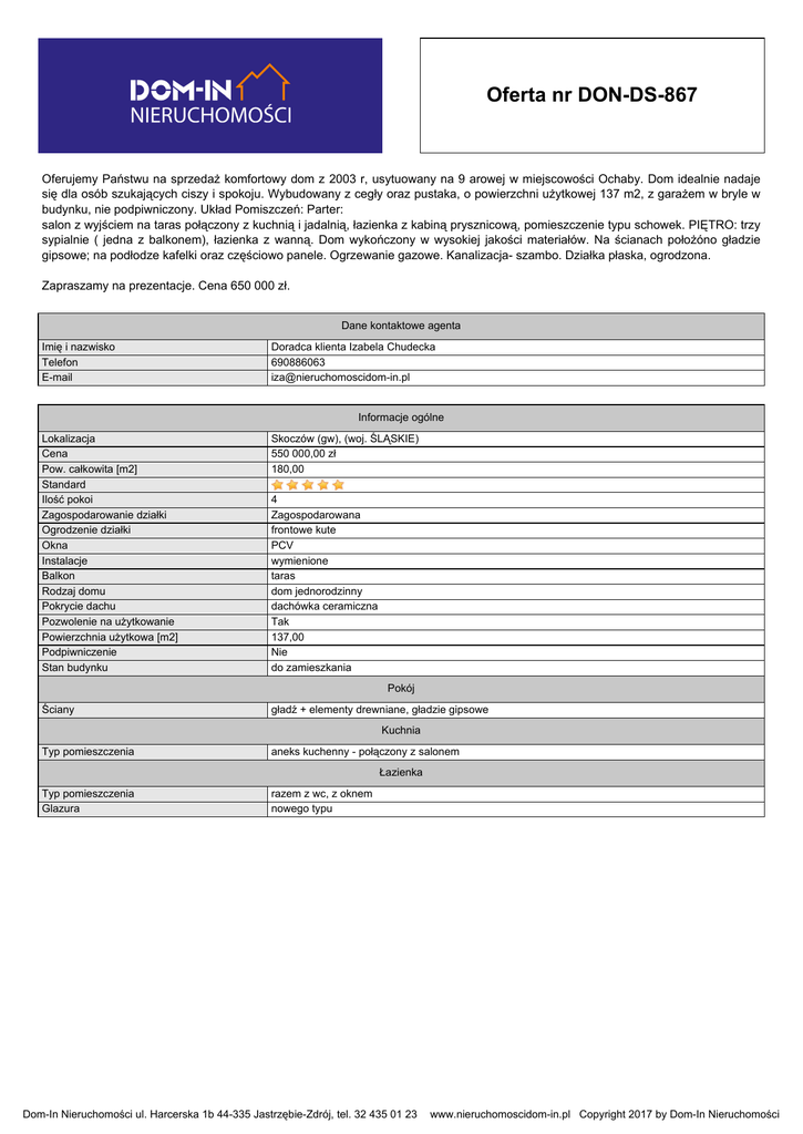 Oferta nr DON-DS-867 Oferujemy Państwu na sprzedaż komfortowy dom z 2003 r, usytuowany na 9 arowej w miejscowości Ochaby. Dom idealnie nadaje się dla osób szukających ciszy i spokoju. Wybudowany z cegły oraz pustaka, o powierzchni użytkowej 137 m2, z garażem w bryle w budynku, nie podpiwniczony. Układ Pomiszczeń: Parter: salon z wyjściem na taras połączony z kuchnią i jadalnią, łazienka z kabiną prysznicową, pomieszczenie typu schowek. PIĘTRO: trzy sypialnie ( jedna z balkonem), łazienka z wanną. Dom wykończony w wysokiej jakości materiałów. Na ścianach położóno gładzie gipsowe; na podłodze kafelki oraz częściowo panele. Ogrzewanie gazowe. Kanalizacja- szambo. Działka płaska, ogrodzona. Zapraszamy na prezentacje. Cena 650 000 zł. Dane kontaktowe agenta Imię i nazwisko Telefon E-mail Doradca klienta Izabela Chudecka 690886063 [email protected] Informacje ogólne Lokalizacja Cena Pow. całkowita [m2] Standard Ilość pokoi Zagospodarowanie działki Ogrodzenie działki Okna Instalacje Balkon Rodzaj domu Pokrycie dachu Pozwolenie na użytkowanie Powierzchnia użytkowa [m2] Podpiwniczenie Stan budynku Skoczów (gw), (woj. ŚLĄSKIE) 550 000,00 zł 180,00 4 Zagospodarowana frontowe kute PCV wymienione taras dom jednorodzinny dachówka ceramiczna Tak 137,00 Nie do zamieszkania Pokój Ściany gładź + elementy drewniane, gładzie gipsowe Kuchnia Typ pomieszczenia aneks kuchenny - połączony z salonem Łazienka Typ pomieszczenia Glazura razem z wc, z oknem nowego typu Dom-In Nieruchomości ul. Harcerska 1b 44-335 Jastrzębie-Zdrój, tel. 32 435 01 23 www.nieruchomoscidom-in.pl Copyright 2017 by Dom-In Nieruchomości