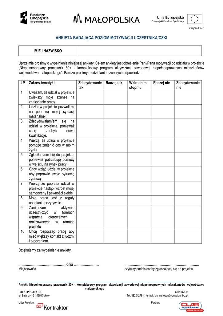 Załącznik nr 3 ANKIETA BADAJĄCA POZIOM MOTYWACJI UCZESTNIKA/CZKI IMIĘ I NAZWISKO Uprzejmie prosimy o wypełnienie niniejszej ankiety. Celem ankiety jest określenie Pani/Pana motywacji do udziału w projekcie „Niepełnosprawny pracownik 30+ - kompleksowy program aktywizacji zawodowej niepełnosprawnych mieszkańców województwa małopolskiego”. Bardzo prosimy o udzielanie szczerych odpowiedzi. LP Zakres tematyki 1 2 3 4 5 6 7 8 9 10 Zdecydowanie Raczej tak tak W średnim stopniu Raczej nie Zdecydowanie nie Uważam, że udział w projekcie zwiększy moje szanse na znalezienie pracy. Udział w projekcie pozwoli mi na poprawę mojej sytuacji materialnej. Zdecydowałam/em się na udział w projekcie, ponieważ chcę zdobyć nowe kwalifikacje. Wierzę, że udział w projekcie pomoże zmienić coś w moim życiu. Zgłosiłam/em się do projektu, ponieważ potrzebuję pomocy w wejściu na rynek pracy. Chcę wziąć udział w projekcie aby poprawić swoją sytuację życiową Wierzę że poprzez udział w projekcie nastąpi wzrost mojej samooceny i pewności siebie Moja praca jest z reguły oceniania pozytywnie. Zamierzam aktywnie uczestniczyć w formach wsparcia oferowanych i realizowanych w ramach projektu Chcę rozpocząć pracę aby mieć większy kontakt z ludźmi i otoczeniem. Dziękujemy za wypełnienie ankiety. ................................................., dnia ........................... Miejscowość ............................................................................... czytelny podpis osoby zgłaszającej się do projektu Projekt: Niepełnosprawny pracownik 30+ - kompleksowy program aktywizacji zawodowej niepełnosprawnych mieszkańców województwa małopolskiego BIURO PROJEKTU: ul. Bajana 4, 31-465 Kraków Lider Projektu: KONTAKT: Tel. 882042781; e-mail: [email protected] Partner: