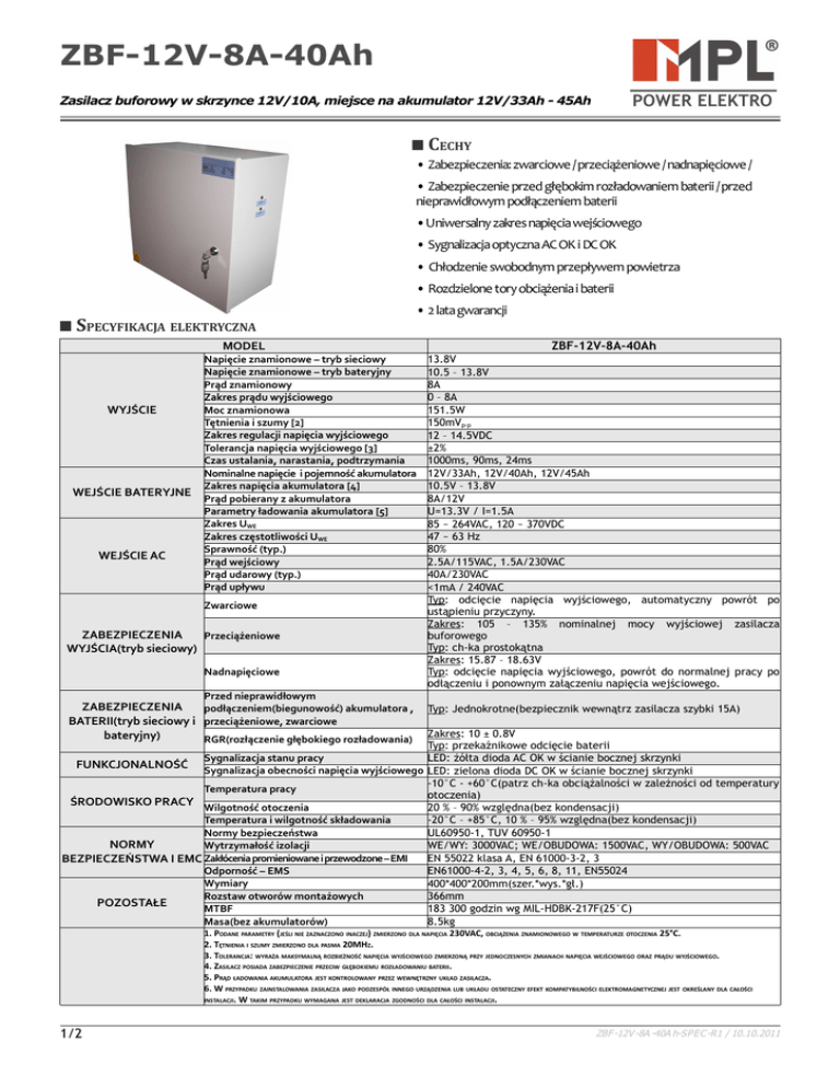 ZBF-12V-8A-40Ah Zasilacz buforowy w skrzynce 12V/10A, miejsce na akumulator 12V/33Ah - 45Ah CECHY • Zabezpieczenia: zwarciowe / przeciążeniowe / nadnapięciowe / • Zabezpieczenie przed głębokim rozładowaniem baterii / przed nieprawidłowym podłączeniem baterii •Uniwersalny zakres napięcia wejściowego • Sygnalizacja optyczna AC OK i DC OK • Chłodzenie swobodnym przepływem powietrza • Rozdzielone tory obciążenia i baterii SPECYFIKACJA ELEKTRYCZNA • 2 lata gwarancji MODEL WYJŚCIE WEJŚCIE BATERYJNE WEJŚCIE AC Napięcie znamionowe – tryb sieciowy Napięcie znamionowe – tryb bateryjny Prąd znamionowy Zakres prądu wyjściowego Moc znamionowa Tętnienia i szumy [2] Zakres regulacji napięcia wyjściowego Tolerancja napięcia wyjściowego [3] Czas ustalania, narastania, podtrzymania Nominalne napięcie i pojemność akumulatora Zakres napięcia akumulatora [4] Prąd pobierany z akumulatora Parametry ładowania akumulatora [5] Zakres UWE Zakres częstotliwości UWE Sprawność (typ.) Prąd wejściowy Prąd udarowy (typ.) Prąd upływu Zwarciowe ZABEZPIECZENIA Przeciążeniowe WYJŚCIA(tryb sieciowy) Nadnapięciowe ZBF-12V-8A-40Ah 13.8V 10.5 – 13.8V 8A 0 – 8A 151.5W 150mVp-p 12 – 14.5VDC ±2% 1000ms, 90ms, 24ms 12V/33Ah, 12V/40Ah, 12V/45Ah 10.5V – 13.8V 8A/12V U=13.3V / I=1.5A 85 ~ 264VAC, 120 ~ 370VDC 47 ~ 63 Hz 80% 2.5A/115VAC, 1.5A/230VAC 40A/230VAC <1mA / 240VAC Typ: odcięcie napięcia wyjściowego, automatyczny powrót po ustąpieniu przyczyny. Zakres: 105 – 135% nominalnej mocy wyjściowej zasilacza buforowego Typ: ch-ka prostokątna Zakres: 15.87 – 18.63V Typ: odcięcie napięcia wyjściowego, powrót do normalnej pracy po odłączeniu i ponownym załączeniu napięcia wejściowego. Przed nieprawidłowym ZABEZPIECZENIA podłączeniem(biegunowość) akumulatora , BATERII(tryb sieciowy i przeciążeniowe, zwarciowe bateryjny) RGR(rozłączenie głębokiego rozładowania) Typ: Jednokrotne(bezpiecznik wewnątrz zasilacza szybki 15A) Zakres: 10 ± 0.8V Typ: przekaźnikowe odcięcie baterii Sygnalizacja stanu pracy LED: żółta dioda AC OK w ścianie bocznej skrzynki FUNKCJONALNOŚĆ Sygnalizacja obecności napięcia wyjściowego LED: zielona dioda DC OK w ścianie bocznej skrzynki -10°C - +60°C(patrz ch-ka obciążalności w zależności od temperatury Temperatura pracy otoczenia) ŚRODOWISKO PRACY Wilgotność otoczenia 20 % – 90% względna(bez kondensacji) Temperatura i wilgotność składowania -20°C – +85°C, 10 % – 95% względna(bez kondensacji) Normy bezpieczeństwa UL60950-1, TUV 60950-1 NORMY Wytrzymałość izolacji WE/WY: 3000VAC; WE/OBUDOWA: 1500VAC, WY/OBUDOWA: 500VAC EN 55022 klasa A, EN 61000-3-2, 3 BEZPIECZEŃSTWA I EMC Zakłócenia promieniowane i przewodzone – EMI Odporność – EMS EN61000-4-2, 3, 4, 5, 6, 8, 11, EN55024 Wymiary 400*400*200mm(szer.*wys.*gł.) Rozstaw otworów montażowych 366mm POZOSTAŁE MTBF 183 300 godzin wg MIL-HDBK-217F(25°C) Masa(bez akumulatorów) 8.5kg 1. PODANE PARAMETRY (JEŚLI NIE ZAZNACZONO INACZEJ) ZMIERZONO DLA NAPIĘCIA 230VAC, OBCIĄŻENIA ZNAMIONOWEGO W TEMPERATURZE OTOCZENIA 25°C. 2. TĘTNIENIA I SZUMY ZMIERZONO DLA PASMA 20MHZ. 3. TOLERANCJA: WYRAŻA MAKSYMALNĄ ROZBIEŻNOŚĆ NAPIĘCIA WYJŚCIOWEGO ZMIERZONĄ PRZY JEDNOCZESNYCH ZMIANACH NAPIĘCIA WEJŚCIOWEGO ORAZ PRĄDU WYJŚCIOWEGO. 4. ZASILACZ POSIADA ZABEZPIECZENIE PRZECIW GŁĘBOKIEMU ROZŁADOWANIU BATERII. 5. PRĄD ŁADOWANIA AKUMULATORA JEST KONTROLOWANY PRZEZ WEWNĘTRZNY UKŁAD ZASILACZA. 6. W PRZYPADKU ZAINSTALOWANIA ZASILACZA JAKO PODZESPÓŁ INNEGO URZĄDZENIA LUB UKŁADU OSTATECZNY EFEKT KOMPATYBILNOŚCI ELEKTROMAGNETYCZNEJ JEST OKREŚLANY DLA CAŁOŚCI INSTALACJI. W TAKIM PRZYPADKU WYMAGANA JEST DEKLARACJA ZGODNOŚCI DLA CAŁOŚCI INSTALACJI. 1/2 ZBF -12V -8A -40A h-SPEC -R1 / 10.10.2011 ZBF-12V-8A-40Ah Zasilacz buforowy w skrzynce 12V/10A, miejsce na akumulator 12V/33Ah - 45Ah SPECYFIKACJA MECHANICZNA Skrzynka Moduł zasilacza 400 203 366 200 8 7 6 5 4 3 2 1 400 CN1 2 x Ø6 B+ B- WYPROWADZENIA Wejście AC – zaciskowa listwa śrubowa CN1 Nr Wyjście DC – zaciskowa listwa śrubowa CN1 Funkcja Nr Wejście bateryjne – przewody zakończone końcówkami oczkowymi M6 Funkcja Nr Funkcja 1 AC/L 7 -V 5 BAT+(czerwony) 2 AC/N 8 +V 6 BAT-(czarny) 3 GND 100 80 Z wentylatorem chłodzącym o przepływie10 CFM przy odległości10cm 60 Bez wentylatora chłodzącego 40 20 -20 0 10 20 30 40 50 60 Obciążenie / Obciążenie nominalne [%] Obciążenie / Obciążenie nominalne [%] CHARAKTERYSTYKI OBCIĄŻALNOŚCI 100 80 60 40 20 90 100 115 130 150 180 200 240 264 Temperatura otoczenia [°C] Napięcie wejściowe [VAC] FUNKCJONALNOŚĆ SYGNLIZACJA LED 2/2 Tryb pracy Dioda AC OK Dioda DC OK Sieciowy Świeci Świeci Bateryjny Nie świeci Świeci ZBF -12V -8A -40A h-SPEC -R1 / 10.10.2011