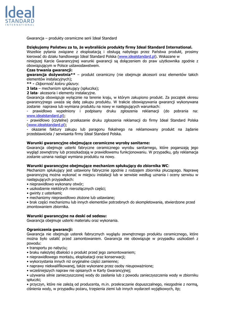 Gwarancja – produkty ceramiczne serii Ideal Standard Dziękujemy Państwu za to, Ŝe wybraliście produkty firmy Ideal Standard International. Wszelkie pytania związane z eksploatacją i obsługą nabytego przez Państwa produkt, prosimy kierować do działu handlowego Ideal Standard Polska (www.idealstandard.pl). Wskazane w niniejszej Karcie Gwarancyjnej warunki gwarancji są dołączeniem do praw uŜytkownika zgodnie z obowiązującym w Polsce ustawodawstwem. Czas trwania gwarancji: gwarancja doŜywotnia** – produkt ceramiczny (nie obejmuje akcesorii oraz elementów takich elementów instalacyjnych); ** - Odporność koloru glazury. 3 lata – mechanizm spłukujący (spłuczka); 2 lata- akcesoria i elementy instalacyjne. Gwarancja obowiązuje wyłącznie na terenie kraju, w którym zakupiono produkt. Za początek okresu gwarancyjnego uwaŜa się datę zakupu produktu. W trakcie obowiązywania gwarancji wykonywana zostanie naprawa lub wymiana produktu na nowy w następujących warunkach: - prawidłowo wypełniony i podpisany druku zgłoszenia reklamacji (do pobrania na: www.idealstandard.pl); - prawidłowo (czytelne) przekazanie druku zgłoszenia reklamacji do firmy Ideal Standard Polska (www.idealstandard.pl); - okazanie faktury zakupu lub paragonu fiskalnego na reklamowany produkt na Ŝądanie przedstawiciela / serwisanta firmy Ideal Standard Polska. Warunki gwarancyjne obejmujące ceramiczne wyroby sanitarne: Gwarancja obejmuje usterki fabryczne ceramicznego wyrobu sanitarnego, które pogarszają jego wygląd zewnętrzny lub przeszkadzają w prawidłowemu funkcjonowaniu. W przypadku, gdy reklamacja zostanie uznana nastąpi wymiana produktu na nowy. Warunki gwarancyjne obejmujące mechanizm spłukujący do zbiornika WC: Mechanizm spłukujący jest ustawiony fabrycznie zgodnie z rodzajem zbiornika płuczącego. Naprawę gwarancyjną moŜna wykonać w miejscu instalacji lub w serwisie według uznania i oceny serwisu w następujących przypadkach: • nieprawidłowo wykonany otwór; • uszkodzenie niektórych nierozłącznych części; • gwinty z usterkami; • mechanizmy nieprawidłowo złoŜone lub ustawiane; • brak części mechanizmu lub innych elementów potrzebnych do skompletowania, stwierdzone przed zmontowaniem zbiornika. Warunki gwarancyjne na deski od sedesu: Gwarancja obejmuje usterki materiału oraz wykonania. Ograniczenia gwarancji: Gwarancja nie obejmuje usterek fabrycznych wyglądu zewnętrznego produktu ceramicznego, które moŜna było ustalić przed zamontowaniem. Gwarancja nie obowiązuje w przypadku uszkodzeń z powodu: • transportu po nabyciu; • braku naleŜytej dbałości o produkt przed jego zamontowaniem; • nieprawidłowego montaŜu, eksploatacji oraz konserwacji; • wykorzystania innych niŜ oryginalne części zamienne; • naprawy niekwalifikowanej, takŜe wykonane przez osoby nieupowaŜnione; • wcześniejszych napraw nie opisanych w Karty Gwarancyjnej; • uŜywania silnie zanieczyszczonej wody do zasilania lub z powodu zanieczyszczenia wody w zbiorniku spłuczki; • przyczyn, które nie zaleŜą od producenta, m.in. przekraczanie dopuszczalnego, niezgodnie z normą, ciśnienia wody, w przypadku poŜaru, trzęsienia ziemi lub innych wydarzeń wyjątkowych, itp; Czas trwania gwarancji nie ulega zmianie z powodu wykonania naprawy gwarancyjnej. Czas trwania gwarancji na części zamienne uŜyte przy naprawie gwarancyjnej jest określony przez czas trwania gwarancji naprawionego produktu. O warunkach i cenach obsługi pozagwarancyjnej i pogwarancyjnej moŜna się dowiedzieć w dziale handlowym Ideal Standard Polska (www.idealstandard.pl) i u autoryzowanych serwisantów produktów Ideal Standard Polska (www.idealstandard.pl). UWAGA! • Firma Ideal Standard Polska zaleca montaŜ produktu przez wykwalifikowany serwis! • Firma Ideal Standard Polska zaleca utrzymywanie produktów w czystości w celu zapobiegania powstawania zanieczyszczeń na powierzchniach produktów lub osadzania się tzw. kamienia kotłowego! • Firma Ideal Standard Polska zaleca stosowanie PH obojętnych środków czyszczących do usuwania kamienia kotłowego. Zbyt częste ich stosowanie na ceramiczne powierzchnie jest niepoŜądane. Zaleca się przestrzeganie instrukcji obsługi producenta. Po zastosowaniu środków czyszczących, ceramiczną powierzchnię naleŜy obficie spłukać wodą! • Nigdy nie naleŜy stosować silnych środków czyszczących lub środków wybielających. Nigdy nie naleŜy pozostawić środków czyszczących na działanie na produkt przez dłuŜszy czas! • Nie naleŜy uŜywać kwasów stęŜonych, zasad oraz / lub materiałów ściernych! • Nigdy nie naleŜy uŜywać w tym samym czasie róŜnych środków czyszczących, istnieje moŜliwość reakcji chemicznej i powstawania gazu trującego! • Nie wlewać do spłuczki środków wybielających, ani innych mocnych środków czyszczących, moŜe to uszkodzić urządzenie spłukujące! • Firma Ideal Standard Polska zaleca naprawiać cieknącą armaturę, zapobiegnie to powstawaniu plam na powierzchni oraz osadzania się kamienia kotłowego. W ten sposób dbamy takŜe o środowisko i własne pieniądze! • Firma Ideal Standard Polska zaleca uŜytkowanie produktów przy temperaturach powyŜej 40C. NaleŜy zabezpieczać produkty przed zamarznięciem wody, np. w spłuczce, w syfonach i w armaturze. Ideal Standard Polska sp. z o.o., ul. Ostrowskiego 7, 53-238 Wrocław, Polska Infolinia 0 801 906 333, Fax +48 71 7868 303, [email protected]