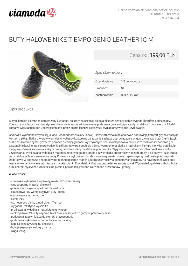 Halina Paszkaniak "ViaModa"odzież, obuwie Ul. Krótka 1, brzozów 604 645 233 BUTY HALOWE NIKE TIEMPO GENIO LEATHER IC M Cena od: 199,00 PLN Opis słownikowy Czas dostawy 1-2 dni robocze Producent NIKE Zastosowanie BUTY HALOWE Opis produktu Buty piłkarskie Tiempo to sprawdzony już fason, po który najczęściej sięgają piłkarze ceniący sobie wygodę i komfort podczas gry. Klasyczny wygląd, charakterystyczne dla modelu szycia i dopasowana podeszwa gwarantują wygodę i stabilność podczas gry. Model został w wielu aspektach unowocześniony, przez co ma jeszcze ciekawszy wygląd oraz wygodę użytkowania. Cholewka wykonana z wysokiej jakości, wodoodpornej skóry licowej. Liczne przeszycia na cholewce poprawiają komfort gry polepszając kontakt z piłką. Siatka otworów wentylacyjnych przy kostce ma za zadanie szybsze odprowadzanie wilgoci z wnętrza buta. Cienki język oraz sznurowanie symetryczne za pomocą średniej grubości wytrzymałych sznurówek pozwala na większe możliwości podczas gry, szczególnie jeżeli chodzi o prowadzenie piłki, strzały oraz podbicia górne. Wzmocniona piętka z nadrukiem Tiempo nie tylko stabilizuje stopę, ale również zapewnia lekką ochronę przed nieudanymi atakami przeciwnika. Wygodna, tekstylna wyściółka zwiększa komfort użytkowania. Profilowana wkładka z materiału tekstylnego doskonale odzwierciedla anatomiczny kształt stopy, a co za tym idzie, stopa jest stabilna, a Ty odczuwasz wygodę. Podeszwa wykonana została z wysokiej jakości gumy, zapewniającej doskonałą przyczepność. Dodatkowo w podeszwie zastosowano technologię non-marking, która uniemożliwia pozostawianie śladów na nawierzchni. Otok buta został wykonany w większej mierze z miękkiej pianki EVA, dzięki której but będzie lekko amortyzował. Wyraziste logo Nike na boku buta oraz charakterystyczne kropeczki na pięcie z pewnością zostaną zauważone przez fanów i graczy. Właściwości: -cholewka wykonana z wysokiej jakości skóry naturalnej -wodoodporny materiał cholewki -przeszycia zwiększające kontrolę nad piłką -siatka otworów wentylacyjnych przy kostce -sznurowanie symetryczne -cienki język -wzmocniona piętka z nadrukiem Tiempo -wygodna, tekstylna wyściółka -profilowana wkładka z materiału tekstylnego -otok z pianki EVA w tylnej oraz środkowej części, oraz z gumy w przedniej części -podeszwa zapewniająca doskonałą przyczepność -podeszwa wykonana w technologii non-marking -logo Nike naszywane na cholewie -buty przeznaczone do gry na hali -waga: 245g Plik wygenerowano: 02-03-2017 Oprogramowanie sklepu: AptusShop Halina Paszkaniak "ViaModa"odzież, obuwie Ul. Krótka 1, brzozów 604 645 233 Materiał: - skóra - cholewka - materiał tekstylny - wyściółka oraz wkładka Kolor: - czarny - żółty - kropeczki na pięcie, obramowanie łyżwy, wyściółka Parametry WYBIERZ ROZMIAR 39 Warianty produktu Buty halowe Nike Tiempo Genio Leather IC M 199,00 PLN Buty halowe Nike Tiempo Genio Leather IC M 631283-007 Galeria Plik wygenerowano: 02-03-2017 Powered by TCPDF (www.tcpdf.org) Oprogramowanie sklepu: AptusShop