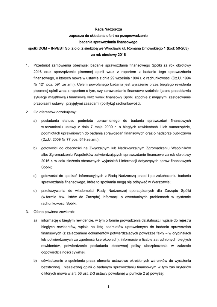Rada Nadzorcza zaprasza do składania ofert na przeprowadzenie badania sprawozdania finansowego spółki DOM – INVEST Sp. z o.o. z siedzibą we Wrocławiu ul. Romana Dmowskiego 1 (kod: 50-203) za rok obrotowy 2016 1. Przedmiot zamówienia obejmuje: badanie sprawozdania finansowego Spółki za rok obrotowy 2016 oraz sporządzenie pisemnej opinii wraz z raportem z badania tego sprawozdania finansowego, o których mowa w ustawie z dnia 29 września 1994 r. o rachunkowości (Dz.U. 1994 Nr 121 poz. 591 ze zm.). Celem powołanego badania jest wyrażenie przez biegłego rewidenta pisemnej opinii wraz z raportem o tym, czy sprawozdanie finansowe rzetelnie i jasno przedstawia sytuację majątkową i finansową oraz wynik finansowy Spółki zgodnie z mającymi zastosowanie przepisami ustawy i przyjętymi zasadami (polityką) rachunkowości. 2. Od oferentów oczekujemy: a) posiadania statusu podmiotu uprawnionego do badania sprawozdań finansowych w rozumieniu ustawy z dnia 7 maja 2009 r. o biegłych rewidentach i ich samorządzie, podmiotach uprawnionych do badania sprawozdań finansowych oraz o nadzorze publicznym (Dz.U. 2009 Nr 77 poz. 649 ze zm.); b) gotowości do obecności na Zwyczajnym lub Nadzwyczajnym Zgromadzeniu Wspólników albo Zgromadzeniu Wspólników zatwierdzających sprawozdanie finansowe za rok obrotowy 2016 r. w celu złożenia stosownych wyjaśnień i informacji dotyczących spraw finansowych Spółki; c) gotowości do spotkań informacyjnych z Radą Nadzorczą przed i po zakończeniu badania sprawozdania finansowego, które to spotkania mogą się odbywać w Warszawie; d) przekazywania do wiadomości Rady Nadzorczej sporządzanych dla Zarządu Spółki (w formie tzw. listów do Zarządu) informacji o ewentualnych problemach w systemie rachunkowości Spółki. 3. Oferta powinna zawierać: a) informację o biegłym rewidencie, w tym o formie prowadzenia działalności, wpisie do rejestru biegłych rewidentów, wpisie na listę podmiotów uprawnionych do badania sprawozdań finansowych (z załączeniem dokumentów potwierdzających powyższe fakty – w oryginałach lub potwierdzonych za zgodność kserokopiach), informacje o liczbie zatrudnionych biegłych rewidentów, potwierdzenie posiadania stosownej polisy ubezpieczenia w zakresie odpowiedzialności cywilnej; b) oświadczenie o spełnieniu przez oferenta ustawowo określonych warunków do wyrażenia bezstronnej i niezależnej opinii o badanym sprawozdaniu finansowym w tym zaś kryteriów o których mowa w art. 56 ust. 2-3 ustawy powołanej w punkcie 2 a) powyżej; 1 c) wskazanie ceny za badanie sprawozdania finansowego oraz sporządzenie pisemnej opinii o badanym sprawozdaniu finansowym, wraz z raportem z badania tego sprawozdania oraz harmonogram płatności ceny; d) informacje na temat doświadczenia oferenta w badaniu sprawozdań finansowych, w tym informacje na temat znajomość branży, w której działa Spółka i wykaz podmiotów badanych w okresie ostatnich 2 lat; e) określenie składu zespołu prowadzącego badanie, z wyszczególnieniem osób posiadających uprawnienia biegłego rewidenta; f) wskazanie metod i terminów badania sprawozdania finansowego. 4. Miejsce badania sprawozdania finansowego: siedziba Spółki. 5. Oczekiwany termin przeprowadzenia badania sprawozdania finansowego: luty 2017 r. 6. Oczekiwany termin przekazania pisemnej opinii wraz z raportem – do 31 marca 2017 r. 7. Opinia biegłego rewidenta wraz z raportem będzie obowiązkowo przedstawiana Zarządowi i Radzie Nadzorczej. 8. Ten sam podmiot nie może przeprowadzać badania sprawozdania finansowego Spółki więcej niż przez 3 (trzy) kolejne lata. 9. Podstawowymi kryteriami oceny przez Radę Nadzorczą będą termin i nakład prac planowany na badanie sprawozdania finansowego, cena i warunki płatności, znajomość branży, w której działa Spółka, pozycja na rynku usług audytorskich. 10. Zainteresowani proszeni są o złożenie pisemnych ofert w terminie do dnia 21 października 2016 r. do godz. 16.00, na adres: DOM – INVEST Sp. z o.o., ul. Romana Dmowskiego 1, Wrocław (kod: 50-203). Oferty należy przesyłać lub składać w zabezpieczonej kopercie, z adnotacją na kopercie „oferta na badanie sprawozdania finansowego spółki”. Za datę złożenia oferty uważa się datę faktycznego wpływu oferty do Spółki. 11. Oferty złożone po upływie terminu określonego w punkcie 10. nie podlegają rozpatrzeniu. 12. Data i miejsce otwarcia ofert są następujące: 24 października 2016 r., godzina 12.30 , Warszawa ul. Nowowiejska 26A (kod: 00-911). 13. Rada Nadzorcza zastrzega sobie prawo swobodnego wyboru oferty, przedłużenia okresu składania ofert, negocjacji warunków umowy dotyczącej badania, odstąpienia od wyboru oferty bez podawania przyczyn i ponoszenia jakichkolwiek skutków prawnych i finansowych. O wynikach wyboru pisemnie poinformowany będzie tylko ten oferent, którego oferta została wybrana. 2