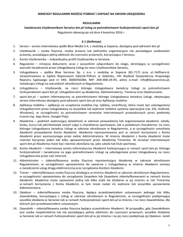 NINIEJSZY REGULAMIN MOŻESZ POBRAĆ I ZAPISAĆ NA SWOIM URZĄDZENIU REGULAMIN świadczenia Użytkownikom Serwisu bm.pl Usług za pośrednictwem funkcjonalności sport.bm.pl Regulamin obowiązuje od dnia 4 kwietnia 2016 r. 1. 2. 3. 4. 5. 6. 7. 8. 9. 10. 11. 12. 13. 14. § 1 (Definicje) Serwis – serwis internetowy spółki Blue Media S.A. z siedzibą w Sopocie, dostępny pod adresem bm.pl. Użytkownik – osoba fizyczna, osoba prawna lub jednostka organizacyjna nie posiadająca osobowości prawnej, posiadająca pełną zdolność do czynności prawnych, korzystająca z Serwisu. Konto Użytkownika – indywidualny profil Użytkownika w Serwisie. Regulamin – niniejszy dokument, wraz z wszystkimi załącznikami do niego, określający w szczególności warunki świadczenia przez Usługodawcę Usług na rzecz Użytkowników Serwisu. Usługodawca – spółka Blue Services Sp. z o.o. z siedzibą w Sopocie (81-717) przy ul. Haffnera 6, zarejestrowana w Sądzie Rejonowym Gdańsk-Północ w Gdańsku, VIII Wydział Gospodarczy Krajowego Rejestru Sądowego pod nr KRS: 0000350284, NIP: 204-000-24-95, adres e-mail: [email protected], świadcząca Usługi na warunkach określonych w Regulaminie. Usługobiorca – Użytkownik, na rzecz którego Usługodawca świadczy Usługi za pośrednictwem funkcjonalności sport.bm.pl. Usługobiorcami są Akademie, Administratorzy, Trenerzy oraz Opiekunowie. sport.bm.pl – system informatyczny za pośrednictwem którego Usługodawca świadczy Usługi, obejmujący serwis internetowy dostępny pod adresem sport.bm.pl oraz Aplikacje mobilne. Aplikacja mobilna – aplikacja na urządzenia mobilne (np. tablety, smartfony), która może być udostępniona Usługobiorcom przez Usługodawcę na wszystkie lub wybrane mobilne systemy operacyjne (np. iOS, Android, Windows), w szczególności za pośrednictwem serwisów internetowych prowadzonych przez podmioty trzecie (np. App Store, Google Play). Akademia – podmiot wykonujący działalność w zakresie prowadzenia lub organizowania akademii, szkoły, klubu, kursu lub jakichkolwiek innych zajęć o charakterze sportowym, lub o podobnym charakterze, na rzecz którego Usługodawca świadczy Usługi w zakresie określonym w Regulaminie, a w szczególności umożliwia Akademii prowadzenie Konta Akademii. Akademia reprezentowana jest w ramach korzystania z Konta Akademii przez wyznaczonego przez siebie Administratora. W imieniu Akademii z Konta Akademii może również korzystać jeden lub kilku upoważnionych przez Akademię Trenerów. W serwisie internetowym sport.bm.pl Akademia może być również określana np. jako szkoła lub klub sportowy. Konto Akademii – internetowy serwis informatyczny Akademii funkcjonujący w ramach sport.bm.pl, którego funkcjonalność i świadczone za jego pośrednictwem Usługi są udostępniane przez Usługodawcę na rzecz Usługobiorców przez sieć Internet. Administrator – zidentyfikowana osoba fizyczna reprezentująca Akademię w zakresie określonym Regulaminem, w szczególności upoważniona do zawarcia z Usługodawcą w imieniu Akademii umowy o świadczenie usług drogą elektroniczną oraz zarządzania Kontem Akademii. Trener – zidentyfikowana osoba fizyczna działająca w imieniu Akademii w zakresie określonym Regulaminem, w szczególności upoważniona do zarządzania Zespołem lub Zespołami zidentyfikowanymi w ramach Konta Akademii. Akademia może upoważnić jedną lub kilka osób do działania w jej imieniu w roli Trenerów w ramach korzystania z Konta Akademii, w tym może nadać im wybrane lub wszystkie uprawnienia Administratora. Opiekun – zidentyfikowana osoba fizyczna, będąca przedstawicielem ustawowym jednego lub kilku Zawodników, korzystająca z Usług w zakresie określonym w Regulaminie, w szczególności podejmująca wszelkie działania w Serwisie lub w ramach funkcjonalności sport.bm.pl w imieniu i na rzecz Zawodników, dla których jest przedstawicielem ustawowym. Zawodnik – zidentyfikowana osoba fizyczna będąca uczestnikiem Akademii. W przypadku, gdy Zawodnikiem jest osoba niepełnoletnia lub nie posiadająca pełnej zdolności do czynności prawnych, wszelkie działania w Serwisie lub w ramach funkcjonalności sport.bm.pl w jej imieniu i na jej rzecz podejmuje jej Opiekun. Jeżeli 1 Regulamin świadczenia Użytkownikom Serwisu bm.pl Usług za pośrednictwem funkcjonalności sport.bm.pl 15. 16. 17. 18. 19. 20. 1. 2. 3. 4. 5. 1. 2. Zawodnik jest pełnoletni i posiada pełną zdolność do czynności prawnych może osobiście pełnić wobec siebie rolę Opiekuna. Zespół – zidentyfikowana w ramach Konta Akademii określona grupa Zawodników. Profil – indywidualne konto Administratora, Trenera, Opiekuna lub Zawodnika w sport.bm.pl. Usługi – usługi świadczone Użytkownikom Serwisu przez Usługodawcę za pośrednictwem sport.bm.pl, w zakresie określonym w Regulaminie, w szczególności opisane w § 3 Regulaminu, będące usługami świadczonymi drogą elektroniczną, w rozumieniu ustawy z dnia 18 lipca 2002 roku o świadczeniu usług drogą elektroniczną. Okres testowy – okres testowego, nieodpłatnego korzystania z Konta Akademii liczony od dnia pierwszego zarejestrowania przez Akademię w sport.bm.pl określonego Konta Akademii, do dnia zakończenia miesiąca kalendarzowego następującego po miesiącu kalendarzowym, w którym zostało zarejestrowane dane Konto Akademii. Okres ważności – okres jednego miesiąca kalendarzowego, w trakcie którego na podstawie uiszczonej przez Akademię odpowiedniej opłaty Akademia ma możliwość korzystania z pełnej funkcjonalności Konta Akademii, którego dotyczy dana opłata. Cennik – Załącznik nr 1 do Regulaminu określający ceny korzystania przez Akademię z Usług. § 2 (Postanowienia wstępne) Zgodnie z wymogami ustawy z dnia 18 lipca 2002 roku o świadczeniu usług drogą elektroniczną (Dz.U.2013.1422 t.j. ze zm.), Usługodawca tworzy niniejszy Regulamin w szczególności w celu okre