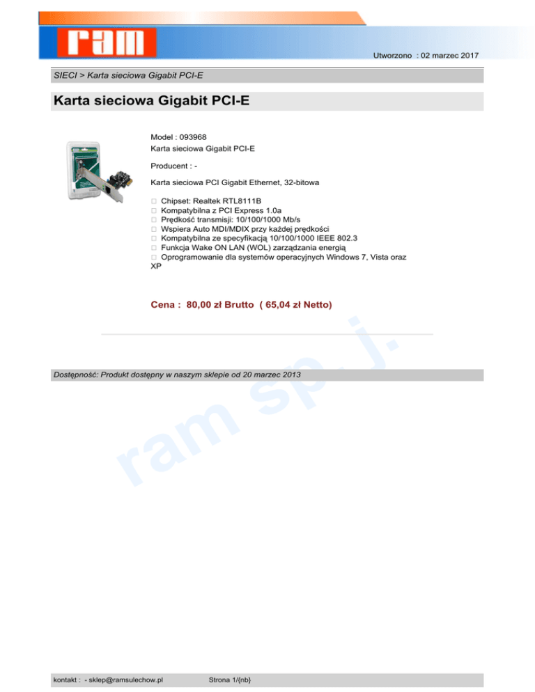 Utworzono : 02 marzec 2017 SIECI > Karta sieciowa Gigabit PCI-E Karta sieciowa Gigabit PCI-E Model : 093968 Karta sieciowa Gigabit PCI-E Producent : Karta sieciowa PCI Gigabit Ethernet, 32-bitowa � Chipset: Realtek RTL8111B � Kompatybilna z PCI Express 1.0a � Prędkość transmisji: 10/100/1000 Mb/s � Wspiera Auto MDI/MDIX przy każdej prędkości � Kompatybilna ze specyfikacją 10/100/1000 IEEE 802.3 � Funkcja Wake ON LAN (WOL) zarządzania energią � Oprogramowanie dla systemów operacyjnych Windows 7, Vista oraz XP . j . Cena : 80,00 zł Brutto ( 65,04 zł Netto) p s Dostępność: Produkt dostępny w naszym sklepie od 20 marzec 2013 m a r kontakt : - [email protected] Strona 1/{nb}