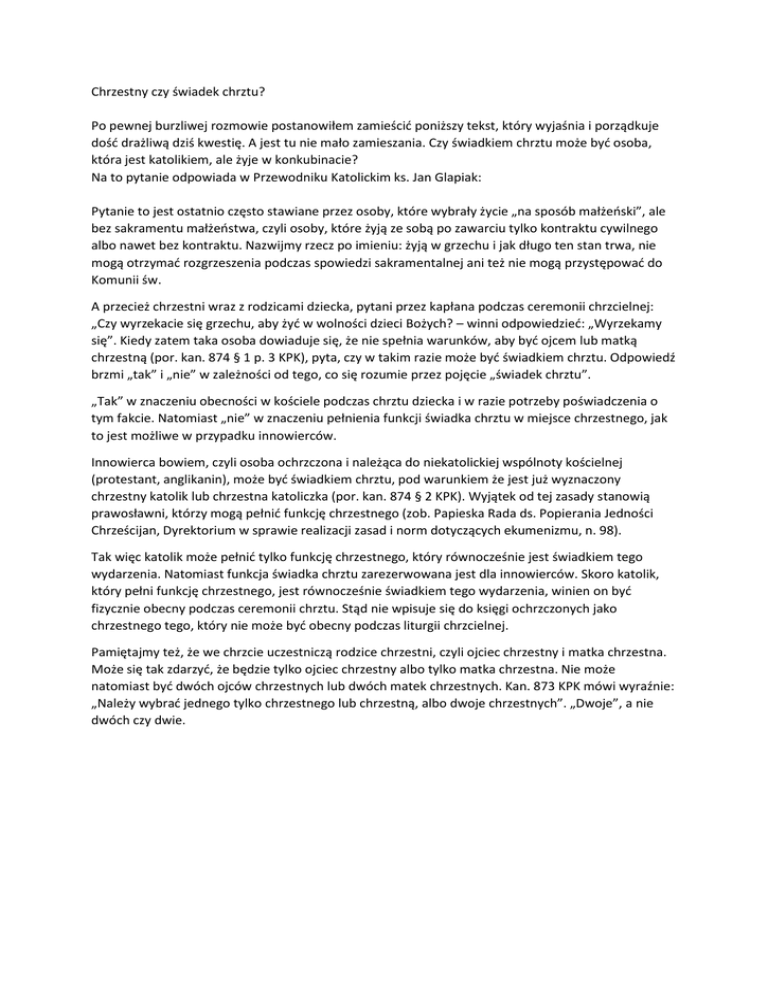 Chrzestny czy świadek chrztu? Po pewnej burzliwej rozmowie postanowiłem zamieścić poniższy tekst, który wyjaśnia i porządkuje dość drażliwą dziś kwestię. A jest tu nie mało zamieszania. Czy świadkiem chrztu może być osoba, która jest katolikiem, ale żyje w konkubinacie? Na to pytanie odpowiada w Przewodniku Katolickim ks. Jan Glapiak: Pytanie to jest ostatnio często stawiane przez osoby, które wybrały życie „na sposób małżeński”, ale bez sakramentu małżeństwa, czyli osoby, które żyją ze sobą po zawarciu tylko kontraktu cywilnego albo nawet bez kontraktu. Nazwijmy rzecz po imieniu: żyją w grzechu i jak długo ten stan trwa, nie mogą otrzymać rozgrzeszenia podczas spowiedzi sakramentalnej ani też nie mogą przystępować do Komunii św. A przecież chrzestni wraz z rodzicami dziecka, pytani przez kapłana podczas ceremonii chrzcielnej: „Czy wyrzekacie się grzechu, aby żyć w wolności dzieci Bożych? – winni odpowiedzieć: „Wyrzekamy się”. Kiedy zatem taka osoba dowiaduje się, że nie spełnia warunków, aby być ojcem lub matką chrzestną (por. kan. 874 § 1 p. 3 KPK), pyta, czy w takim razie może być świadkiem chrztu. Odpowiedź brzmi „tak” i „nie” w zależności od tego, co się rozumie przez pojęcie „świadek chrztu”. „Tak” w znaczeniu obecności w kościele podczas chrztu dziecka i w razie potrzeby poświadczenia o tym fakcie. Natomiast „nie” w znaczeniu pełnienia funkcji świadka chrztu w miejsce chrzestnego, jak to jest możliwe w przypadku innowierców. Innowierca bowiem, czyli osoba ochrzczona i należąca do niekatolickiej wspólnoty kościelnej (protestant, anglikanin), może być świadkiem chrztu, pod warunkiem że jest już wyznaczony chrzestny katolik lub chrzestna katoliczka (por. kan. 874 § 2 KPK). Wyjątek od tej zasady stanowią prawosławni, którzy mogą pełnić funkcję chrzestnego (zob. Papieska Rada ds. Popierania Jedności Chrześcijan, Dyrektorium w sprawie realizacji zasad i norm dotyczących ekumenizmu, n. 98). Tak więc katolik może pełnić tylko funkcję chrzestnego, który równocześnie jest świadkiem tego wydarzenia. Natomiast funkcja świadka chrztu zarezerwowana jest dla innowierców. Skoro katolik, który pełni funkcję chrzestnego, jest równocześnie świadkiem tego wydarzenia, winien on być fizycznie obecny podczas ceremonii chrztu. Stąd nie wpisuje się do księgi ochrzczonych jako chrzestnego tego, który nie może być obecny podczas liturgii chrzcielnej. Pamiętajmy też, że we chrzcie uczestniczą rodzice chrzestni, czyli ojciec chrzestny i matka chrzestna. Może się tak zdarzyć, że będzie tylko ojciec chrzestny albo tylko matka chrzestna. Nie może natomiast być dwóch ojców chrzestnych lub dwóch matek chrzestnych. Kan. 873 KPK mówi wyraźnie: „Należy wybrać jednego tylko chrzestnego lub chrzestną, albo dwoje chrzestnych”. „Dwoje”, a nie dwóch czy dwie.
