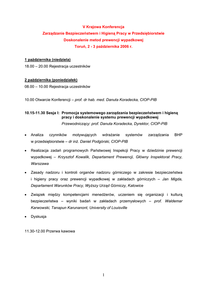 V Krajowa Konferencja Zarządzanie Bezpieczeństwem i Higieną Pracy w Przedsiębiorstwie Doskonalenie metod prewencji wypadkowej Toruń, 2 - 3 października 2006 r. 1 października (niedziela) 18.00 – 20.00 Rejestracja uczestników 2 października (poniedziałek) 08.00 – 10.00 Rejestracja uczestników 10.00 Otwarcie Konferencji – prof. dr hab. med. Danuta Koradecka, CIOP-PIB 10.15-11.30 Sesja I: Promocja systemowego zarządzania bezpieczeństwem i higieną pracy i doskonalenie systemu prewencji wypadkowej Przewodniczący: prof. Danuta Koradecka, Dyrektor, CIOP-PIB • Analiza czynników motywujących wdrażanie systemów zarządzania BHP w przedsiębiorstwie – dr inż. Daniel Podgórski, CIOP-PIB • Realizacja zadań programowych Państwowej Inspekcji Pracy w dziedzinie prewencji wypadkowej – Krzysztof Kowalik, Departament Prewencji, Główny Inspektorat Pracy, Warszawa • Zasady nadzoru i kontroli organów nadzoru górniczego w zakresie bezpieczeństwa i higieny pracy oraz prewencji wypadkowej w zakładach górniczych – Jan Migda, Departament Warunków Pracy, Wyższy Urząd Górniczy, Katowice • Związek między kompetencjami menedżerów, uczeniem się organizacji i kulturą bezpieczeństwa – wyniki badań w zakładach przemysłowych – prof. Waldemar Karwowski, Tanapun Karunanont, University of Louisville • Dyskusja 11.30-12.00 Przerwa kawowa 1 12.00-13.00 Sesja II A: Doskonalenie zarządzania BHP w przedsiębiorstwach Przewodniczący: Jan Migda, Wyższy Urząd Górniczy • Zintegrowany wskaźnik zarządzania jako Departament narzędzie Warunków oceny Pracy, funkcjonowania przedsiębiorstwa w obszarze bezpieczeństwa i higieny pracy – dr inż. Zofia Pawłowska, CIOP-PIB • Ocena skuteczności zarządzania bezpieczeństwem w polskich kopalniach węgla kamiennego – prof. dr hab. Józef Dubiński, dr Joanna Martyka, dr inż. Piotr Rosmus, Główny Instytut Górnictwa, Katowice • Kultura bezpieczeństwa pracy w kształceniu kadr dydaktycznych – Julian Wójtowicz, Uniwersytet Medyczny, Łódź • Dyskusja 13.00-14.00 Przerwa obiadowa 14.00-15.30 Sesja II B: Doskonalenie zarządzania BHP w przedsiębiorstwach Przewodniczący: prof. Waldemar Karwowski, University of Louisville • Skuteczność systemów zarządzania BHP – Bogusław Ziędalski, Oddział Toruńskiego Stowarzyszenia Ochrony Pracy, Toruń • Ocena zarządzania bezpieczeństwem i higieną pracy w PKN ORLEN S.A. – Marek Witkowski, PKN ORLEN, Płock • Ocena zarządzania bezpieczeństwem i higieną pracy w przedsiębiorstwie – Jan Rogalski, BOT Elektrownia Bełchatów S.A. • Monitoring bezpieczeństwa pracy na budowie. - Wojciech Prusiński, Artur Stala, Wiesław Poprawa, Skanska S.A., Kielce • Podnoszenie poziomu bezpieczeństwa pracy – misja firmy DuPont – Magdalena Aleksandrowicz, DuPont, Warszawa • Dyskusja 2 15.30-16.00 Przerwa kawowa 16.00 – 17.00 Sesja III: Czynniki środowiska pracy i profilaktyka wydarzeń wypadkowych Przewodniczący: dr inż. Katarzyna Majchrzycka, Zakład Ochron Osobistych, CIOP-PIB • Zapobieganie zagrożeniom wypadkowym w magazynach wysokiego składowania – dr inż. Krystyna Myrcha, CIOP-PIB • Zastosowanie wirtualnego środowiska do tworzenia materiałów szkoleniowych z zakresu bezpieczeństwa pracy w zakładach górniczych – doc. dr hab. inż. Teodor Winkler prof. nzw. w Pol. Śl., mgr inż. Dariusz Michalak, mgr inż. Łukasz Jaszczyk, mgr inż. Szczepan Bojara, Centrum Mechanizacji Górnictwa KOMAG • Wybrane czynniki kształtujące środowisko pracy a ryzyko zawodowe w przedsiębiorstwie branży obuwniczej – Małgorzata Jaworska, Wydział Ekonomiczny Katedra Nauk o Jakości, Politechnika Radomska • Dyskusja 19. 00 Kolacja uroczysta 3 października (wtorek) 9.00-10.30 Sesja IV: Badanie i rejestrowanie przedsiębiorstwach wydarzeń wypadkowych w Przewodniczący: dr inż. Zofia Pawłowska, Zakład Zarządzania Bezpieczeństwem i Higieną Pracy, CIOP-PIB • Rejestrowanie zdarzeń potencjalnie wypadkowych w przedsiębiorstwach – mgr inż. Grzegorz Dudka, CIOP-PIB • Technologia „Behavioral Accident Prevention Pocess- BAPP firmy BST – Proces Zapobiegania Wypadkom Przemysłowym Oparty na Zachowaniach – Antonina Polok, Mirosław Koźlik TUV Consulting Polska • Program rejestracji wypadków przy pracy w Poczcie Polskiej – Andrzej Garwacki, Poczta Polska, Dyrekcja Okręgu Poczty, Poznań • Motywowanie pracowników do bezpiecznych zachowań jako narzędzie prewencji wypadkowej - dr hab. Zygmunt Niczyporuk, mgr inż. Wioletta Przenniak, Wydział 3 Organizacji i Zarządzania, Katedra Zarządzania Środowiskiem i Bezpieczeństwem, Politechnika Śląska, Gliwice • Dyskusja 10.30 – 11.00 Przerwa kawowa 11.00 – 12.00 Sesja V: Stosowanie środków ochrony indywidualnej w prewencji wypadkowej Przewodniczący: dr inż. Daniel Podgórski, Zastępca Dyrektora ds. Systemów Zarządzania i Certyfikacji, CIOP-PIB • Zasady bezpiecznego stosowania środków ochrony indywidualnej – dr inż. Katarzyna Majchrzycka, CIOP-PIB • Programy komputerowe wspomagające dobór środków ochrony indywidualnej – dr inż. Adam Pościk, CIOP-PIB • Zasady doboru i stosowania sprzętu chroniącego przed upadkiem z wysokości – Jacek Sosnowski, Zygmunt Zrobek, PROTEKT Grzegorz Łaszkiewicz, Łódź • Dyskusja 12.00 – 12.30 Podsumowanie i zakończenie Konferencji 13.00 Obiad 4