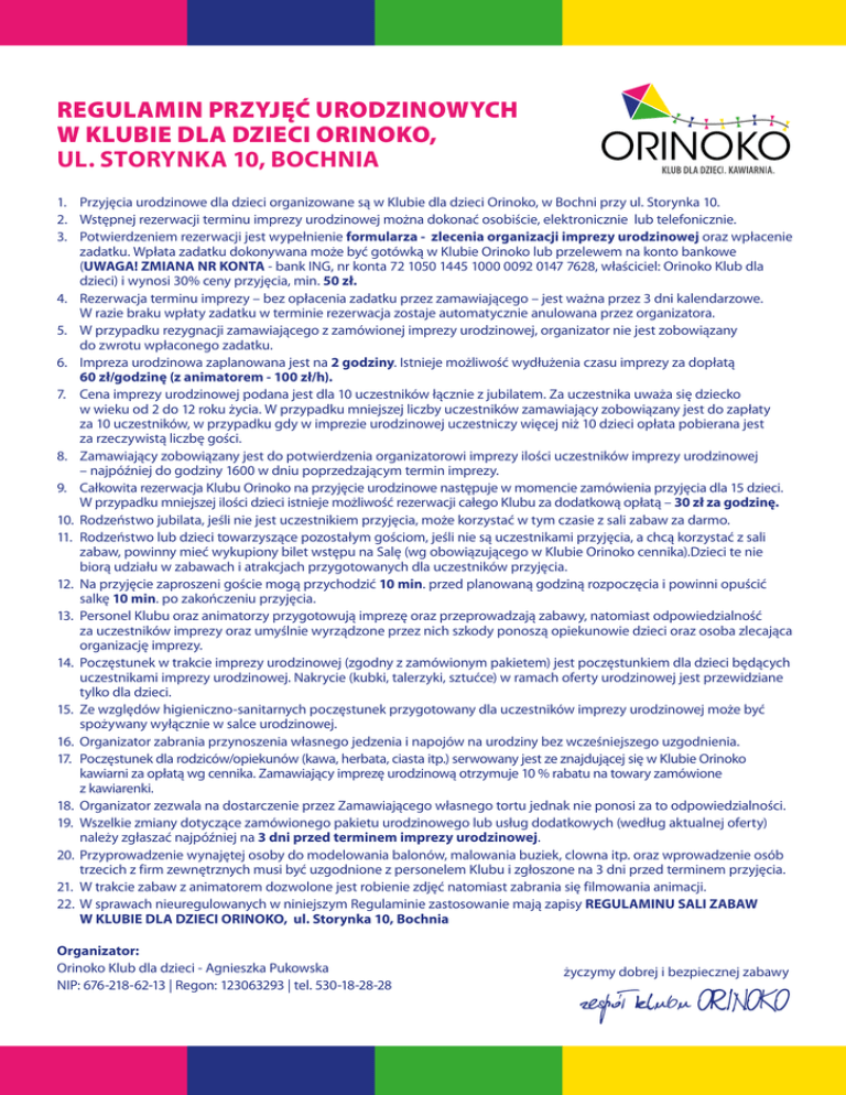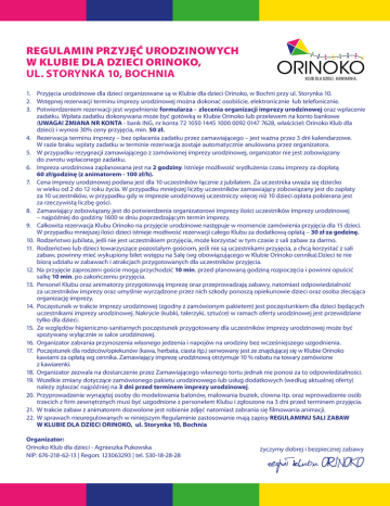 REGULAMIN PRZYJĘĆ URODZINOWYCH W KLUBIE DLA DZIECI ORINOKO, UL. STORYNKA 10, BOCHNIA 1. Przyjęcia urodzinowe dla dzieci organizowane są w Klubie dla dzieci Orinoko, w Bochni przy ul. Storynka 10. 2. Wstępnej rezerwacji terminu imprezy urodzinowej można dokonać osobiście, elektronicznie lub telefonicznie. 3. Potwierdzeniem rezerwacji jest wypełnienie formularza - zlecenia organizacji imprezy urodzinowej oraz wpłacenie zadatku. Wpłata zadatku dokonywana może być gotówką w Klubie Orinoko lub przelewem na konto bankowe (UWAGA! ZMIANA NR KONTA - bank ING, nr konta 72 1050 1445 1000 0092 0147 7628, właściciel: Orinoko Klub dla dzieci) i wynosi 30% ceny przyjęcia, min. 50 zł. 4. Rezerwacja terminu imprezy – bez opłacenia zadatku przez zamawiającego – jest ważna przez 3 dni kalendarzowe. W razie braku wpłaty zadatku w terminie rezerwacja zostaje automatycznie anulowana przez organizatora. 5. W przypadku rezygnacji zamawiającego z zamówionej imprezy urodzinowej, organizator nie jest zobowiązany do zwrotu wpłaconego zadatku. 6. Impreza urodzinowa zaplanowana jest na 2 godziny. Istnieje możliwość wydłużenia czasu imprezy za dopłatą 60 zł/godzinę (z animatorem - 100 zł/h). 7. Cena imprezy urodzinowej podana jest dla 10 uczestników łącznie z jubilatem. Za uczestnika uważa się dziecko w wieku od 2 do 12 roku życia. W przypadku mniejszej liczby uczestników zamawiający zobowiązany jest do zapłaty za 10 uczestników, w przypadku gdy w imprezie urodzinowej uczestniczy więcej niż 10 dzieci opłata pobierana jest za rzeczywistą liczbę gości. 8. Zamawiający zobowiązany jest do potwierdzenia organizatorowi imprezy ilości uczestników imprezy urodzinowej – najpóźniej do godziny 1600 w dniu poprzedzającym termin imprezy. 9. Całkowita rezerwacja Klubu Orinoko na przyjęcie urodzinowe następuje w momencie zamówienia przyjęcia dla 15 dzieci. W przypadku mniejszej ilości dzieci istnieje możliwość rezerwacji całego Klubu za dodatkową opłatą – 30 zł za godzinę. 10. Rodzeństwo jubilata, jeśli nie jest uczestnikiem przyjęcia, może korzystać w tym czasie z sali zabaw za darmo. 11. Rodzeństwo lub dzieci towarzyszące pozostałym gościom, jeśli nie są uczestnikami przyjęcia, a chcą korzystać z sali zabaw, powinny mieć wykupiony bilet wstępu na Salę (wg obowiązującego w Klubie Orinoko cennika).Dzieci te nie biorą udziału w zabawach i atrakcjach przygotowanych dla uczestników przyjęcia. 12. Na przyjęcie zaproszeni goście mogą przychodzić 10 min. przed planowaną godziną rozpoczęcia i powinni opuścić salkę 10 min. po zakończeniu przyjęcia. 13. Personel Klubu oraz animatorzy przygotowują imprezę oraz przeprowadzają zabawy, natomiast odpowiedzialność za uczestników imprezy oraz umyślnie wyrządzone przez nich szkody ponoszą opiekunowie dzieci oraz osoba zlecająca organizację imprezy. 14. Poczęstunek w trakcie imprezy urodzinowej (zgodny z zamówionym pakietem) jest poczęstunkiem dla dzieci będących uczestnikami imprezy urodzinowej. Nakrycie (kubki, talerzyki, sztućce) w ramach oferty urodzinowej jest przewidziane tylko dla dzieci. 15. Ze względów higieniczno-sanitarnych poczęstunek przygotowany dla uczestników imprezy urodzinowej może być spożywany wyłącznie w salce urodzinowej. 16. Organizator zabrania przynoszenia własnego jedzenia i napojów na urodziny bez wcześniejszego uzgodnienia. 17. Poczęstunek dla rodziców/opiekunów (kawa, herbata, ciasta itp.) serwowany jest ze znajdującej się w Klubie Orinoko kawiarni za opłatą wg cennika. Zamawiający imprezę urodzinową otrzymuje 10 % rabatu na towary zamówione z kawiarenki. 18. Organizator zezwala na dostarczenie przez Zamawiającego własnego tortu jednak nie ponosi za to odpowiedzialności. 19. Wszelkie zmiany dotyczące zamówionego pakietu urodzinowego lub usług dodatkowych (według aktualnej oferty) należy zgłaszać najpóźniej na 3 dni przed terminem imprezy urodzinowej. 20. Przyprowadzenie wynajętej osoby do modelowania balonów, malowania buziek, clowna itp. oraz wprowadzenie osób trzecich z firm zewnętrznych musi być uzgodnione z personelem Klubu i zgłoszone na 3 dni przed terminem przyjęcia. 21. W trakcie zabaw z animatorem dozwolone jest robienie zdjęć natomiast zabrania się filmowania animacji. 22. W sprawach nieuregulowanych w niniejszym Regulaminie zastosowanie mają zapisy REGULAMINU SALI ZABAW W KLUBIE DLA DZIECI ORINOKO, ul. Storynka 10, Bochnia Organizator: Orinoko Klub dla dzieci - Agnieszka Pukowska NIP: 676-218-62-13 | Regon: 123063293 | tel. 530-18-28-28 życzymy dobrej i bezpiecznej zabawy zespół klubu ORINOKO