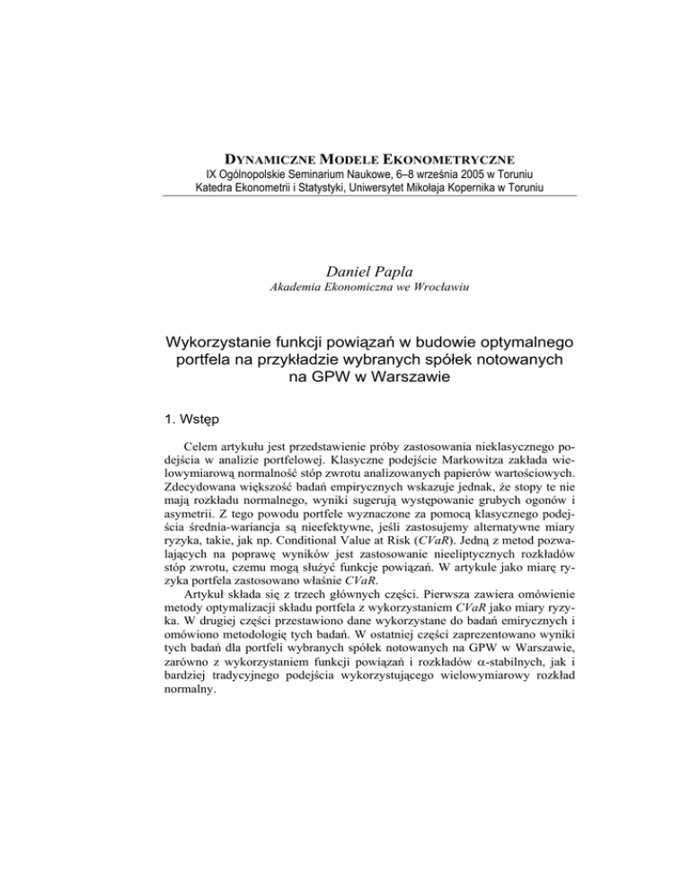 stóp zwrotu, czemu mogą służyć funkcje powiązań. W artykule jako miarę ryzyka portfela zastosowano właśnie CVaR.