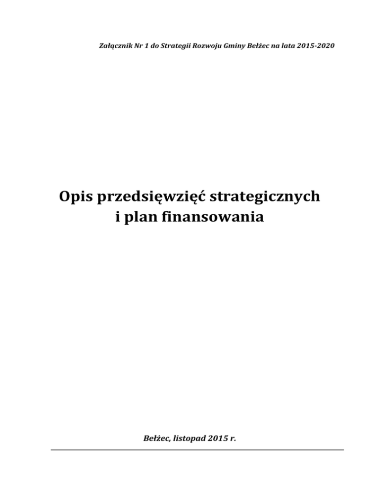 Załącznik Nr 1 do Strategii Rozwoju Gminy Bełżec na lata 2015-2020 Opis przedsięwzięć strategicznych i plan finansowania Bełżec, listopad 2015 r. Załącznik Nr 1 do Strategii Rozwoju Gminy Bełżec na lata 2015-2020 1. Wykorzystanie walorów turystycznych Gminy Bełżec poprzez powiązanie z atrakcjami Miasta Tomaszów Lubelski Nazwa zadania Ukazanie naturalnego potencjału Geoparku Kamienny Las poprzez wykorzystanie walorów turystycznych miasta Tomaszów Lubelski oraz okolicznych gmin (Przedsięwzięcie Zintegrowane M. Tomaszów Lubelski – Lider): „Wykorzystanie walorów turystycznych Gminy Bełżec poprzez powiązanie z atrakcjami Miasta Tomaszów Lubelski” (jeden z partnerów) Termin realizacji 2018-2020 Szacunkowy koszt zadania Źródła finansowania 367 000,00 zł Regionalny Program Operacyjny Województwa Lubelskiego na lata 2014 – 2020, Działanie 7.4 Turystyka przyrodnicza 2. E-turysta – Aktywne Roztocze Nazwa zadania E-turysta – Aktywne Roztocze (Przedsięwzięcie Zintegrowane – M. Tomaszów Lubelski – Lider Projekt Partnerski ze wszystkimi partnerami przedsięwzięcia „Od kultury do natury”) Termin realizacji 2018-2020 Szacunkowy koszt zadania Źródła finansowania 10 000,00 zł Regionalny Program Operacyjny Województwa Lubelskiego na lata 2014 – 2020, Działanie 2.1. Cyfrowe lubelskie 3. Promocja zintegrowanego produktu turystycznego „Aktywne Roztocze – od – kultury do natury Nazwa zadania Promocja zintegrowanego produktu turystycznego „Aktywne Roztocze – od – kultury do natury (Przedsięwzięcie Zintegrowane – M. Tomaszów Lubelski – Lider Projekt Partnerski ze wszystkimi partnerami przedsięwzięcia „Od kultury do natury”) Termin realizacji 2018-2020 Szacunkowy koszt zadania 76 500,00 zł 2 Załącznik Nr 1 do Strategii Rozwoju Gminy Bełżec na lata 2015-2020 Źródła finansowania Regionalny Program Operacyjny Województwa Lubelskiego na lata 2014 – 2020, Działanie 3.6. Marketing gospodarczy 4. Poprawa dostępności społecznej i gospodarczej miejscowości Bełżec – Budowa drogi ul. Ogrodowa od km 0+000 do km 0+374 Nazwa zadania Poprawa dostępności społecznej i gospodarczej miejscowości Bełżec – Budowa drogi ul. Ogrodowa od km 0+000 do km 0+374 Termin realizacji do końca czerwca 2018 r. Szacunkowy koszt zadania 186 425,36 zł Źródła finansowania Program Rozwoju Obszarów Wiejskich na lata 2014-2020 „Budowa lub modernizacja dróg lokalnych”, w ramach poddziałania „Wsparcie inwestycji związanych z tworzeniem, ulepszaniem lub rozbudową wszystkich rodzajów małej infrastruktury, w tym inwestycji w energię odnawialną i w oszczędzanie energii” 5. Przebudowa drogi - ul. Jana Sobieskiego w Bełżcu w km 0+000 - 0+504 Nazwa zadania Przebudowa drogi - ul. Jana Sobieskiego w Bełżcu w km 0+000 - 0+504 Termin realizacji do końca czerwca 2018 r. Szacunkowy koszt zadania 145 657,19 zł Źródła finansowania Program Rozwoju Obszarów Wiejskich na lata 2014-2020 „Budowa lub modernizacja dróg lokalnych”, w ramach poddziałania „Wsparcie inwestycji związanych z tworzeniem, ulepszaniem lub rozbudową wszystkich rodzajów małej infrastruktury, w tym inwestycji w energię odnawialną i w oszczędzanie energii” 6. Poprawa dostępności społecznej i gospodarczej miejscowości Bełżec – Budowa drogi ul. Stawowa w km 0+000 do km 0+235 Nazwa zadania Poprawa dostępności społecznej i gospodarczej miejscowości Bełżec – Budowa drogi ul. Stawowa w km 0+000 do km 0+235 3 Załącznik Nr 1 do Strategii Rozwoju Gminy Bełżec na lata 2015-2020 Termin realizacji 2018 r. Szacunkowy koszt zadania 145 703,44 zł Źródła finansowania Program Rozwoju Obszarów Wiejskich na lata 2014-2020 „Budowa lub modernizacja dróg lokalnych”, w ramach poddziałania „Wsparcie inwestycji związanych z tworzeniem, ulepszaniem lub rozbudową wszystkich rodzajów małej infrastruktury, w tym inwestycji w energię odnawialną i w oszczędzanie energii” 7. Przebudowa drogi gminnej Nr 111922L Bełżec – Żyłka od km 3+093 do km 3+465 Nazwa zadania Przebudowa drogi gminnej Nr 111922L Bełżec – Żyłka od km 3+093 do km 3+465 Termin realizacji do końca grudnia 2017 r Szacunkowy koszt zadania 319 196,82 zł Źródła finansowania Program Rozwoju Obszarów Wiejskich na lata 2014-2020 „Budowa lub modernizacja dróg lokalnych”, w ramach poddziałania „Wsparcie inwestycji związanych z tworzeniem, ulepszaniem lub rozbudową wszystkich rodzajów małej infrastruktury, w tym inwestycji w energię odnawialną i w oszczędzanie energii” 8. Przebudowa budynku - wydzielenie pomieszczeń dydaktycznych dla potrzeb Zespołu SzkolnoPrzedszkolnego w celu zwiększenia dostępu do edukacji przedszkolnej w Gminie Bełżec Nazwa zadania Przebudowa budynku - wydzielenie pomieszczeń dydaktycznych dla potrzeb Zespołu Szkolno-Przedszkolnego w celu zwiększenia dostępu do edukacji przedszkolnej w Gminie Bełżec Termin realizacji 2017 r. Szacunkowy koszt zadania 678 073,42 zł Źródła finansowania Regionalny Program Operacyjny Województwa Lubelskiego na lata 2014 – 2020, Oś Priorytetowa 13 Infrastruktura społeczna, Działanie 13.5 Infrastruktura przedszkolna Budżet Beneficjenta: 169 346,20 zł Fundusze UE: 508 727,22 zł 4 Załącznik Nr 1 do Strategii Rozwoju Gminy Bełżec na lata 2015-2020 9. Budowa sieci kanalizacji sanitarnej w miejscowości Bełżec, Kolektor KP-1 - kontynuacja Nazwa zadania Budowa sieci kanalizacji sanitarnej w miejscowości Bełżec, Kolektor KP1 - kontynuacja Termin realizacji 2018 r., 2019 r., 2020 r. Szacunkowy koszt zadania 7 036 786,68 zł Źródła finansowania Regionalny Program Operacyjny Województwa Lubelskiego na lata 2014 – 2020, Oś Priorytetowa 6 Ochrona środowiska i efektywne wykorzystanie zasobów, Działanie 6.4 Gospodarka wodno-ściekowa Budżet Beneficjenta: 3 389 671,64 zł Fundusze UE: 3 647 115,04 zł 10. Poprawa jakości środowiska naturalnego w obszarze przygra