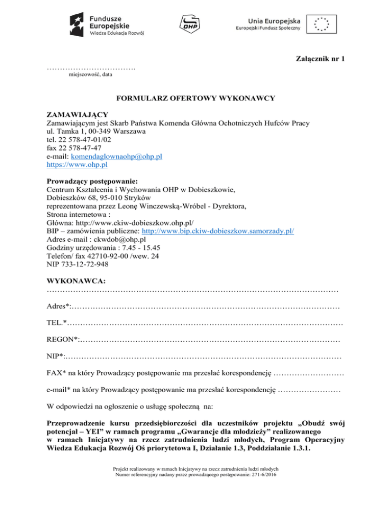 Załącznik nr 1 ……………………………. miejscowość, data FORMULARZ OFERTOWY WYKONAWCY ZAMAWIAJĄCY Zamawiającym jest Skarb Państwa Komenda Główna Ochotniczych Hufców Pracy ul. Tamka 1, 00-349 Warszawa tel. 22 578-47-01/02 fax 22 578-47-47 e-mail: [email protected] https://www.ohp.pl Prowadzący postępowanie: Centrum Kształcenia i Wychowania OHP w Dobieszkowie, Dobieszków 68, 95-010 Stryków reprezentowana przez Leonę Winczewską-Wróbel - Dyrektora, Strona internetowa : Główna: http://www.ckiw-dobieszkow.ohp.pl/ BIP – zamówienia publiczne: http://www.bip.ckiw-dobieszkow.samorzady.pl/ Adres e-mail : [email protected] Godziny urzędowania : 7.45 - 15.45 Telefon/ fax 42710-92-00 /wew. 24 NIP 733-12-72-948 WYKONAWCA: ………………………………………………………………………………………………… Adres*:………………………………………………………………………………………… TEL.*…………………………………………………………………………………………… REGON*:……………………………………………………………………………………… NIP*:…………………………………………………………………………………………… FAX* na który Prowadzący postępowanie ma przesłać korespondencję ……………………… e-mail* na który Prowadzący postępowanie ma przesłać korespondencję …………………… W odpowiedzi na ogłoszenie o usługę społeczną na: Przeprowadzenie kursu przedsiębiorczości dla uczestników projektu „Obudź swój potencjał – YEI” w ramach programu „Gwarancje dla młodzieży” realizowanego w ramach Inicjatywy na rzecz zatrudnienia ludzi młodych, Program Operacyjny Wiedza Edukacja Rozwój Oś priorytetowa I, Działanie 1.3, Poddziałanie 1.3.1. Projekt realizowany w ramach Inicjatywy na rzecz zatrudnienia ludzi młodych Numer referencyjny nadany przez prowadzącego postępowanie: 271-6/2016 Oświadczamy, że: Zapoznaliśmy się z treścią WZUS dla niniejszego zamówienia i akceptujemy w całości wszystkie warunki zawarte w dokumentacji i załącznikach do zamówienia na usługi społeczne. Gwarantujemy wykonanie niniejszego zamówienia zgodnie z treścią: WZUS, wyjaśnień do WZUS oraz jego modyfikacji. Oferujemy wykonanie zamówienia na usługi społeczne w pełnym rzeczowym zakresie za cenę: za cenę łączną brutto …………………… zł za cały kurs przedsiębiorczości dla 1 uczestnika słownie: ………………………………………………………………………………………… Powyższe ceny obejmują zakres zamówienia określony w WZUS. W cenę wliczono wszystkie koszty niezbędne do realizacji zamówienia. Oświadczam/oświadczamy że: Wykonam zamówienie w okresie trwania projektu tj. : w okresie od podpisania umowy do 31.10.2016 r. w ilości 20 godzin lekcyjnych. W związku z realizacją dużej ilością zajęć w projekcie „Obudź swój potencjał – YEI” szczegółowy harmonogram zostanie określony i zatwierdzony przez koordynatora w porozumieniu z Wykonawcą. Osoby do kontaktów z Zamawiającym Osoba / osoby do kontaktów z Zamawiającym odpowiedzialne za wykonanie zobowiązań umowy:……………………………..tel. kontaktowy…………………., faks: ……………… e-mail: ………………………………….. zakres odpowiedzialności………………………… …………………………………………………………………………………………………. …………………………………………………………………………………………………. Oświadczamy, że akceptujemy warunki płatności (30 dni) określone przez Prowadzącego postępowanie w WZUS przedmiotowego zamówienia. Niniejsza oferta jest ważna przez 60 dni, od upływu terminu przewidzianego na złożenie ofert. Akceptujemy bez zastrzeżeń warunki zawarte we wzorze umowy na realizację usługi społecznej. W przypadku uznania naszej oferty za najkorzystniejszą, umowę zobowiązujemy się zawrzeć w miejscu i terminie jakie zostaną wskazane przez Zamawiającego. Składam(y) niniejszą ofertę [we własnym imieniu] / [jako Wykonawcy wspólnie ubiegający się o udzielenie zamówienia]1. Nie uczestniczymy jako Wykonawca w jakiejkolwiek innej ofercie złożonej w celu udzielenia niniejszego zamówienia. 1 Wykonawca usuwa/skreśla niepotrzebne. Projekt realizowany w ramach Inicjatywy na rzecz zatrudnienia ludzi młodych Numer referencyjny nadany przez prowadzącego postępowanie: 271-6/2016 Informujemy, że w niniejszym postępowaniu zatrudnimy/nie zatrudnimy podwykonawców1, którym powierzymy wymienione niżej prace:……………………………………………….. Na podstawie art. 8 ust. 3 ustawy z dnia 29 stycznia 2004 r. prawo zamówień publicznych (Dz. U. z 2013 r poz.907 ze zm.), [żadne z informacji zawartych w ofercie nie stanowią tajemnicy przedsiębiorstwa w rozumieniu przepisów o zwalczaniu nieuczciwej konkurencji / wskazane poniżej informacje zawarte w ofercie stanowią tajemnicę przedsiębiorstwa w rozumieniu przepisów o zwalczaniu nieuczciwej konkurencji i w związku z niniejszym nie mogą być one udostępniane, w szczególności innym uczestnikom postępowania2: l.p . a) Oznaczenie rodzaju (nazwy) informacji Strony w ofercie (wyrażone cyfrą) Od Do b) Pełnomocnik w przypadku składania oferty wspólnej Nazwisko, imię .................................................................................................... Stanowisko ........................................................................................................... Telefon...................................................Fax......................................................... Zakres: - do reprezentowania w postępowaniu i zawarcia umowy Inne informacje wykonawcy: ……………………………