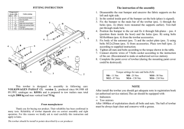 FITTING INSTRUCTION Clamp mark in acc. with ISO PN 1 L 2 + 3 31 4 R 5 58R 6 54 7 58L The instruction of the assembly Cables joining Left directional lights Rear fog lights Ground Right directional lights Right side parking lights Stoplights Left side parking lights 4 B A 6 1 4 B 6 5 7 A 3 2 This towbar is designed to assembly in following cars: VOLKSWAGEN PASSAT CL version 2, produced since 04.1988 till 09.1993, catalogue no. K010A and is prepared to tow trailers max total weight 2000 kg and max vertical load 75 kg. From manufacturer Thank you for buying our product. Their reliability has been confirmed in many tests. Reliability of towbar depends also on correct assembly and right operation. For this reasons we kindly ask to read carefully this instruction and apply to hints. The towbar should be install in points described by a car producer. 1. Disassemble the rear bumper and unscrew the fabric supports on the left and right side. 2. In the central inside part of the bumper cut the hole (place is signed). 3. Fix the bumper to the main bar of the towbar (pos. 1) through the holes (pos. A) (there were mounted the supports earlier). Tow-ball put through made hole. 4. Position the bumper to the car and fix it through fish-plates – pos. 4 (position them inside the boot) and the holes (pos. B) using bolts M10x40mm (pos. 6) from the towbar accessories. 5. Fix body of the automat (pos. 7) and the socket plate (pos. 3) using bolts M12x25mm (pos. 5) from accessories. Place tow-ball (pos. 2) according to supplied instruction. 6. Tighten all nuts and bolts according to the torque shown in the table. 7. Connect electric wires of 7-bolts socket according to the instruction of the car. (Recommend to make at authorized service station). 8. Complete the paint cover of towbar (during the mounting paint cover could be destroyed). Torque settings for nuts and bolts (8,8): M6 - 11 Nm M8 - 25 Nm M10 - 50 Nm M12 - 87 Nm M14 - 138 Nm M16 - 210 Nm NOTE After install the towbar you should get adequate note in registration book (at authorised service station).The car should be equipped with: • Indicators • Tow mirrors After 1000km of exploitation check all bolts and nuts. The ball of towbar must be always kept clear and conserve with a grease. PPUH AUTO-HAK Sp.J. Towbar accessories: Produkcja Zaczepów Kulowych Henryk & Zbigniew Nejman 76-200 SŁUPSK ul. Słoneczna 16K tel/fax (059) 8-414-414; 8-414-413 E-mail: [email protected] www. autohak.com.pl Towing hitch (without electrical set) Class: A50-X Cat. no. K010A Designed for: Manufacturer: VOLKSWAGEN Model: PASSAT CL Type: version 2 produced since 04.1988 till 09.1993 Technical data: D-value: 9,10 kN maximum trailer weight: 2000 kg maximum vertical cup load: 75 kg Approval number according to Directive 94/20/EC: e20*94/20*1158*00 Foreword This towbar is designed according to rules of safety traffic regulations. The towing hitch is a safety component and can be install only by qualified personnel. Any alteration or conversion of the towing hitch is prohibited and would lead to cancellation of design certification. Remove insulating compound and underseal from vehicle (if present) in the area of the matting surfaces of the towing hitch. The vehicle manufacturer’s specifications regarding trailer load and max. vertical cup load are decisive for driving whereat values for the towing hitch cannot be exceeded. D-value formula: Max trailer weight [kg] x Max trailer weight [kg] + Max vehicle weight [kg] Max vehicle weight [kg] X 9,81 1000 = D [kN] INSTRUKCJA montaŜu i eksploatacji zaczepu kulowego Oznaczenie zacisku wg ISO PN 1 L 2 + 3 31 4 R 5 58R 6 54 7 58L Kolejność czynności przy montaŜu Łączenie przewodów Kierunkowskazy lewe Tylne światła przeciwmgłowe Masa Kierunkowskazy prawe Światła pozycyjne prawe Światła hamowania Światła pozycyjne lewe 4 B A 6 1 4 B 6 5 7 A 3 2 Zaczep kulowy przeznaczony jest do zamontowania w samochodzie: VOLKSWAGEN PASSAT CL wersja 2, produkowanym od 04.1988r. do 09.1993r., numer katalogowy K010A, i słuŜy do ciągnięcia przyczep o masie całkowitej 2000 kg i nacisku na kulę max 75 kg. OD PRODUCENTA Dziękujemy za wybór produkowanego przez naszą firmę zaczepu kulowego. Jego niezawodność została potwierdzona licznymi testami oraz opiniami zadowolonych klientów. JednakŜe niezawodność zaczepów kulowych jest zaleŜna równieŜ od prawidłowego montaŜu oraz prawidłowej eksploatacji. Z tego powodu prosimy Państwa o staranne przeczytanie niniejszej instrukcji montaŜu oraz przestrzeganie zawartych wskazówek. Zaczep naleŜy zamontować w miejscach do tego celu przeznaczonych przez producenta samochodu. 1. W celu zamontowania zaczepu naleŜy zdemontować zderzak, a następnie odkręcić fabryczne uchwyty mocujące po lewej i prawej stronie. 2. Od wewnętrznej strony czaszy zderzaka wyciąć otwór (wyraźne nacięcie w centralnym punkcie czaszy). 3. Zderzak przykręcić do belki głównej zaczepu (poz. 1) poprzez otwory zaczepu (poz. A) w miejsce zdemontowanych wsporników (część kulistą przełoŜyć poprzez wykonany otwór). 4. Tak przygotowany zderzak z zaczepem zamontować do samochodu i przykręcić poprzez nakładki (poz. 4) przyłoŜone w bagaŜniku oraz otwory (poz. B) śrubami M10x40mm (poz. 6) z wyposaŜenia zaczepu. 5. Do zamontowanego juŜ zaczepu przykręcić korpus automatu (poz. 7) śrubami M12x25mm (poz. 5) wraz z blachą pod gniazdo (poz. 3). Zamocować kulę zgodnie z instrukcją dołączaną do zaczepu z końcówką szybkodemontowalną. 6. Dokręcić wszystkie śruby z momentem jak pokazano w tabeli. 7. Podłączyć przewody z gniazdka 7 – bieg. do instalacji elektrycznej zgodnie z instrukcją fabryczną samochodu (zaleca się wykonanie w ASO). 8. Uzupełnić ewentualne ubytki powłoki malarskiej zaczepu powstałe w trakcie montaŜu. Zalecany moment skręcający dla śrub i nakrętek 8,8: M6 - 11 Nm M8 - 25 Nm M10 - 50 Nm M12 - 87 Nm M14 - 138 Nm M16 - 210 Nm UWAGA Po zamontowaniu z