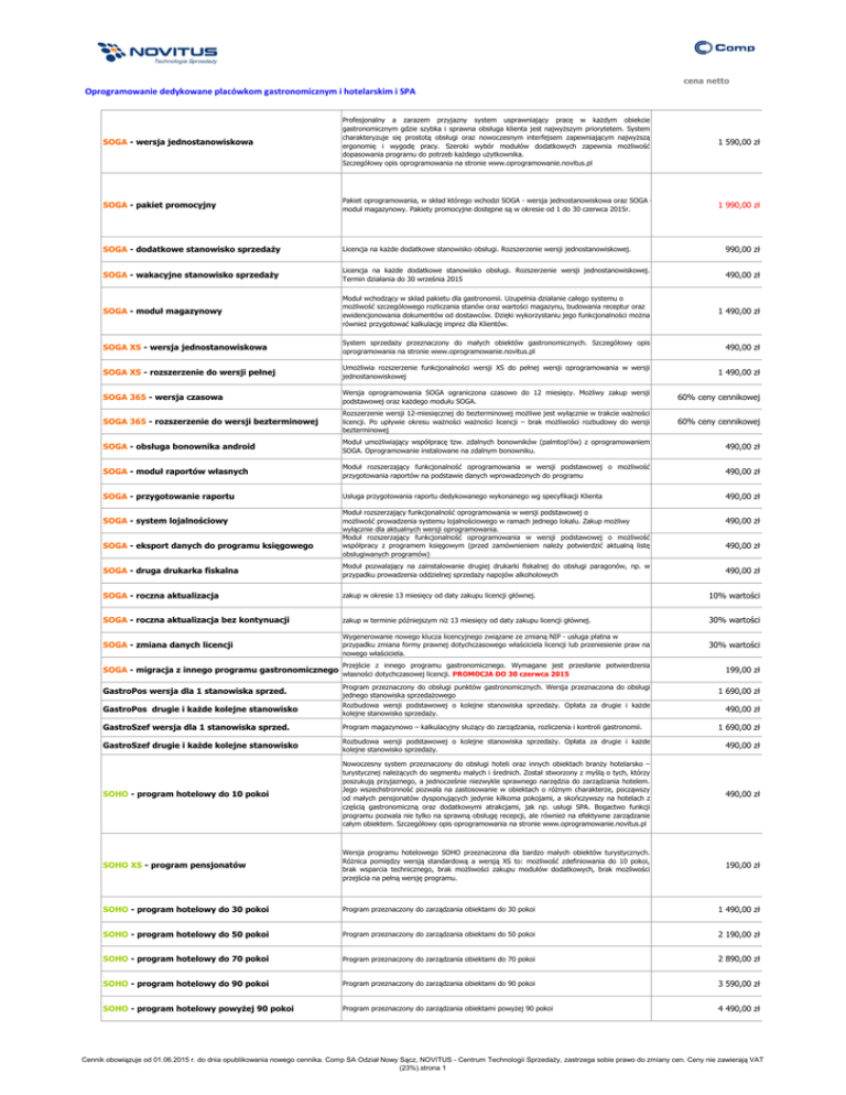 cena netto Oprogramowanie dedykowane placówkom gastronomicznym i hotelarskim i SPA SOGA - wersja jednostanowiskowa Profesjonalny a zarazem przyjazny system usprawniający pracę w każdym obiekcie gastronomicznym gdzie szybka i sprawna obsługa klienta jest najwyższym priorytetem. System charakteryzuje się prostotą obsługi oraz nowoczesnym interfejsem zapewniającym najwyższą ergonomię i wygodę pracy. Szeroki wybór modułów dodatkowych zapewnia możliwość dopasowania programu do potrzeb każdego użytkownika. Szczegółowy opis oprogramowania na stronie www.oprogramowanie.novitus.pl 1 590,00 zł SOGA - pakiet promocyjny Pakiet oprogramowania, w skład którego wchodzi SOGA - wersja jednostanowiskowa oraz SOGA moduł magazynowy. Pakiety promocyjne dostępne są w okresie od 1 do 30 czerwca 2015r. 1 990,00 zł SOGA - dodatkowe stanowisko sprzedaży Licencja na każde dodatkowe stanowisko obsługi. Rozszerzenie wersji jednostanowiskowej. 990,00 zł SOGA - wakacyjne stanowisko sprzedaży Licencja na każde dodatkowe stanowisko obsługi. Rozszerzenie wersji jednostanowiskowej. Termin działania do 30 września 2015 490,00 zł SOGA - moduł magazynowy Moduł wchodzący w skład pakietu dla gastronomii. Uzupełnia działanie całego systemu o możliwość szczegółowego rozliczania stanów oraz wartości magazynu, budowania receptur oraz ewidencjonowania dokumentów od dostawców. Dzięki wykorzystaniu jego funkcjonalności można również przygotować kalkulację imprez dla Klientów. 1 490,00 zł SOGA XS - wersja jednostanowiskowa System sprzedaży przeznaczony do małych obiektów gastronomicznych. Szczegółowy opis oprogramowania na stronie www.oprogramowanie.novitus.pl 490,00 zł SOGA XS - rozszerzenie do wersji pełnej Umożliwia rozszerzenie funkcjonalności wersji XS do pełnej wersji oprogramowania w wersji jednostanowiskowej 1 490,00 zł SOGA 365 - wersja czasowa Wersja oprogramowania SOGA ograniczona czasowo do 12 miesięcy. Możliwy zakup wersji podstawowej oraz każdego modułu SOGA. 60% ceny cennikowej SOGA 365 - rozszerzenie do wersji bezterminowej Rozszerzenie wersji 12-miesięcznej do bezterminowej możliwe jest wyłącznie w trakcie ważności licencji. Po upływie okresu ważności ważności licencji – brak możliwości rozbudowy do wersji bezterminowej 60% ceny cennikowej SOGA - obsługa bonownika android Moduł umożliwiający współpracę tzw. zdalnych bonowników (palmtop'ów) z oprogramowaniem SOGA. Oprogramowanie instalowane na zdalnym bonowniku. 490,00 zł SOGA - moduł raportów własnych Moduł rozszerzający funkcjonalność oprogramowania w wersji podstawowej o możliwość przygotowania raportów na podstawie danych wprowadzonych do programu 490,00 zł SOGA - przygotowanie raportu Usługa przygotowania raportu dedykowanego wykonanego wg specyfikacji Klienta 490,00 zł SOGA - system lojalnościowy SOGA - eksport danych do programu księgowego Moduł rozszerzający funkcjonalność oprogramowania w wersji podstawowej o możliwość prowadzenia systemu lojalnościowego w ramach jednego lokalu. Zakup możliwy wyłącznie dla aktualnych wersji oprogramowania. Moduł rozszerzający funkcjonalność oprogramowania w wersji podstawowej o możliwość współpracy z programem księgowym (przed zamównieniem należy potwierdzić aktualną listę obsługiwanych programów) 490,00 zł 490,00 zł SOGA - druga drukarka fiskalna Moduł pozwalający na zainstalowanie drugiej drukarki fiskalnej do obsługi paragonów, np. w przypadku prowadzenia oddzielnej sprzedaży napojów alkoholowych SOGA - roczna aktualizacja zakup w okresie 13 miesięcy od daty zakupu licencji głównej. 10% wartości SOGA - roczna aktualizacja bez kontynuacji zakup w terminie późniejszym niż 13 miesięcy od daty zakupu licencji głównej. 30% wartości SOGA - zmiana danych licencji Wygenerowanie nowego klucza licencyjnego związane ze zmianą NIP - usługa płatna w przypadku zmiana formy prawnej dotychczasowego właściciela licencji lub przeniesienie praw na nowego właściciela. 30% wartości Przejście z innego programu gastronomicznego. Wymagane jest przesłanie potwierdzenia SOGA - migracja z innego programu gastronomicznego własności dotychczasowej licencji. PROMOCJA DO 30 czerwca 2015 GastroPos wersja dla 1 stanowiska sprzed. GastroPos drugie i każde kolejne stanowisko Program przeznaczony do obsługi punktów gastronomicznych. Wersja przeznaczona do obsługi jednego stanowiska sprzedażowego Rozbudowa wersji podstawowej o kolejne stanowiska sprzedaży. Opłata za drugie i każde kolejne stanowisko sprzedaży. 490,00 zł 199,00 zł 1 690,00 zł 490,00 zł 1 690,00 zł GastroSzef wersja dla 1 stanowiska sprzed. Program magazynowo – kalkulacyjny służący do zarządzania, rozliczenia i kontroli gastronomii. GastroSzef drugie i każde kolejne stanowisko Rozbudowa wersji podstawowej o kolejne stanowiska sprzedaży. Opłata za drugie i każde kolejne stanowisko sprzedaży. 490,00 zł SOHO - program hotelowy do 10 pokoi Nowoczesny system przeznaczony do obsługi hoteli oraz innych obiektach branży hotelarsko – turystycznej należących do segmentu małych i średnich. Został stworzony z myślą o tych, którzy poszukują przyjaznego, a jednocześnie niezwykle sprawnego narzędzia do zarządzania hotelem. Jego wszechstronność pozwala na zastosowanie w obiektach o różnym charakterze, począwszy od małych pensjonatów dysponujących jedynie kilkoma pokojami, a skończywszy na hotelach z częścią gastronomiczną oraz dodatkowymi atrakcjami, jak np. usługi SPA. Bogactwo funkcji programu pozwala nie tylko na sprawną obsługę recepcji, ale również na efektywne zarządzanie całym obiektem. Szczegółowy opis oprogramowania na stronie www.oprogramowanie.novitus.pl 490,00 zł SOHO XS - program pensjonatów Wersja programu hotelowego SOHO przeznaczona dla bardzo małych obiektów turystycznych. Różnica pomiędzy wersją standardową a wersją XS to: możliwość zdefi