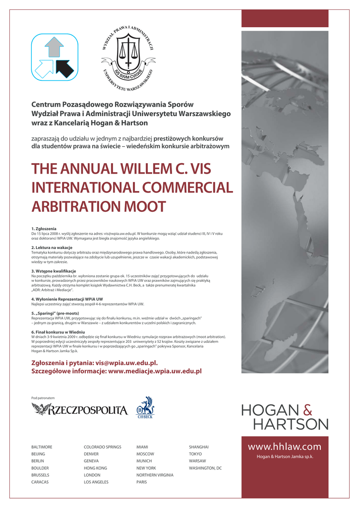 Centrum Pozasądowego Rozwiązywania Sporów Wydział Prawa i Administracji Uniwersytetu Warszawskiego wraz z Kancelarią Hogan & Hartson zapraszają do udziału w jednym z najbardziej prestiżowych konkursów dla studentów prawa na świecie – wiedeńskim konkursie arbitrażowym THE ANNUAL WILLEM C. VIS INTERNATIONAL COMMERCIAL ARBITRATION MOOT 1. Zgłoszenia Do 15 lipca 2008 r. wyślij zgłoszenie na adres: [email protected]. W konkursie mogą wziąć udział studenci III, IV i V roku oraz doktoranci WPiA UW. Wymagana jest biegła znajomość języka angielskiego. 2. Lektura na wakacje Tematyka konkursu dotyczy arbitrażu oraz międzynarodowego prawa handlowego. Osoby, które nadeślą zgłoszenia, otrzymają materiały pozwalające na zdobycie lub uzupełnienie, jeszcze w czasie wakacji akademickich, podstawowej wiedzy w tym zakresie. 3. Wstępne kwalifikacje Na początku października br. wyłoniona zostanie grupa ok. 15 uczestników zajęć przygotowujących do udziału w konkursie, prowadzonych przez pracowników naukowych WPiA UW oraz prawników zajmujących się praktyką arbitrażową. Każdy otrzyma komplet książek Wydawnictwa C.H. Beck, a także prenumeratę kwartalnika „ADR: Arbitraż i Mediacje”. 4. Wyłonienie Reprezentacji WPiA UW Najlepsi uczestnicy zajęć stworzą zespół 4-6 reprezentantów WPiA UW. 5. „Sparingi” (pre-moots) Reprezentacja WPiA UW, przygotowując się do finału konkursu, m.in. weźmie udział w dwóch „sparingach” – jednym za granicą, drugim w Warszawie – z udziałem konkurentów z uczelni polskich i zagranicznych. 6. Finał konkursu w Wiedniu W dniach 3-9 kwietnia 2009 r. odbędzie się finał konkursu w Wiedniu: symulacje rozpraw arbitrażowych (moot arbitration). W poprzedniej edycji uczestniczyły zespoły reprezentujące 203 uniwersytety z 52 krajów. Koszty związane z udziałem reprezentacji WPiA UW w finale konkursu i w poprzedzających go „sparingach” pokrywa Sponsor, Kancelaria Hogan & Hartson Jamka Sp.k. Zgłoszenia i pytania: [email protected]. Szczegółowe informacje: www.mediacje.wpia.uw.edu.pl Pod patronatem BALTIMORE COLORADO SPRINGS MIAMI SHANGHAI BEIJING DENVER MOSCOW TOKYO BERLIN GENEVA MUNICH WARSAW BOULDER HONG KONG NEW YORK WASHINGTON, DC BRUSSELS LONDON NORTHERN VIRGINIA CARACAS LOS ANGELES PARIS www.hhlaw.com Hogan & Hartson Jamka sp.k.