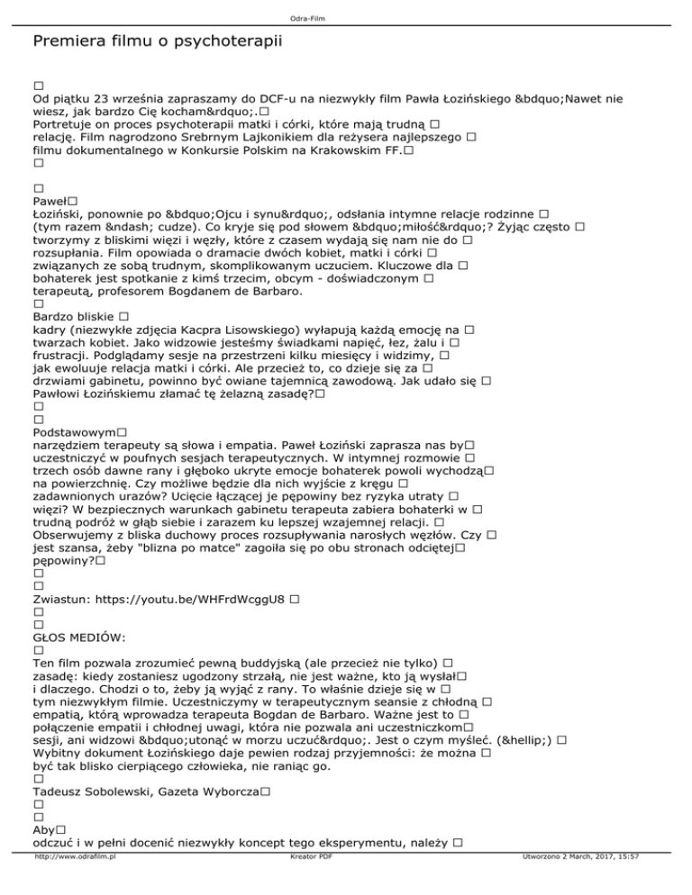 Odra-Film Premiera filmu o psychoterapii Od piątku 23 września zapraszamy do DCF-u na niezwykły film Pawła Łozińskiego „Nawet nie wiesz, jak bardzo Cię kocham”. Portretuje on proces psychoterapii matki i córki, które mają trudną relację. Film nagrodzono Srebrnym Lajkonikiem dla reżysera najlepszego filmu dokumentalnego w Konkursie Polskim na Krakowskim FF. Paweł Łoziński, ponownie po „Ojcu i synu”, odsłania intymne relacje rodzinne (tym razem – cudze). Co kryje się pod słowem „miłość”? Żyjąc często tworzymy z bliskimi więzi i węzły, które z czasem wydają się nam nie do rozsupłania. Film opowiada o dramacie dwóch kobiet, matki i córki związanych ze sobą trudnym, skomplikowanym uczuciem. Kluczowe dla bohaterek jest spotkanie z kimś trzecim, obcym - doświadczonym terapeutą, profesorem Bogdanem de Barbaro. Bardzo bliskie kadry (niezwykłe zdjęcia Kacpra Lisowskiego) wyłapują każdą emocję na twarzach kobiet. Jako widzowie jesteśmy świadkami napięć, łez, żalu i frustracji. Podglądamy sesje na przestrzeni kilku miesięcy i widzimy, jak ewoluuje relacja matki i córki. Ale przecież to, co dzieje się za drzwiami gabinetu, powinno być owiane tajemnicą zawodową. Jak udało się Pawłowi Łozińskiemu złamać tę żelazną zasadę? Podstawowym narzędziem terapeuty są słowa i empatia. Paweł Łoziński zaprasza nas by uczestniczyć w poufnych sesjach terapeutycznych. W intymnej rozmowie trzech osób dawne rany i głęboko ukryte emocje bohaterek powoli wychodzą na powierzchnię. Czy możliwe będzie dla nich wyjście z kręgu zadawnionych urazów? Ucięcie łączącej je pępowiny bez ryzyka utraty więzi? W bezpiecznych warunkach gabinetu terapeuta zabiera bohaterki w trudną podróż w głąb siebie i zarazem ku lepszej wzajemnej relacji. Obserwujemy z bliska duchowy proces rozsupływania narosłych węzłów. Czy jest szansa, żeby "blizna po matce" zagoiła się po obu stronach odciętej pępowiny? Zwiastun: https://youtu.be/WHFrdWcggU8 GŁOS MEDIÓW: Ten film pozwala zrozumieć pewną buddyjską (ale przecież nie tylko) zasadę: kiedy zostaniesz ugodzony strzałą, nie jest ważne, kto ją wysłał i dlaczego. Chodzi o to, żeby ją wyjąć z rany. To właśnie dzieje się w tym niezwykłym filmie. Uczestniczymy w terapeutycznym seansie z chłodną empatią, którą wprowadza terapeuta Bogdan de Barbaro. Ważne jest to połączenie empatii i chłodnej uwagi, która nie pozwala ani uczestniczkom sesji, ani widzowi „utonąć w morzu uczuć”. Jest o czym myśleć. (…) Wybitny dokument Łozińskiego daje pewien rodzaj przyjemności: że można być tak blisko cierpiącego człowieka, nie raniąc go. Tadeusz Sobolewski, Gazeta Wyborcza Aby odczuć i w pełni docenić niezwykły koncept tego eksperymentu, należy http://www.odrafilm.pl Kreator PDF Utworzono 2 March, 2017, 15:57 Odra-Film wczytać się uważnie w napisy końcowe. (...) zapis intymnych zwierzeń matki i córki podczas zarejestrowanych spotkań z prof. Bohdanem de Barbaro, wybitnym psychiatrą, psychoterapeutą, kierownikiem Zakładu Terapii Rodzin Katedry Psychiatrii Collegium Medicum UJ, w żadnym stopniu nie wydaje się wyreżyserowany. Przeżywane emocje są prawdziwe. Reakcje spontaniczne. Wszyscy troje są autentyczni, a pokora, życzliwość i mądrość lekarza wydają się wręcz imponujące. (...) Czym jest więc ten film? Stosując psychoanalityczny klucz, można powiedzieć, że poruszającym, głęboko autorskim dziełem, którym Paweł Łoziński, dokonując swoistej ekspiacji za swój wcześniejszy film „Ojciec i syn”, śle list miłosny swemu ojcu, podejmując próbę rodzinnego pojednania. Janusz Wróblewski, Polityka (…) ból wypowiedziany i nazwany jest obietnicą skutecznej terapii. Podglądanie w pracy wybitnego krakowskiego psychologa Bogdana de Barbaro to zatem nie tylko relacja z niedostępnego zazwyczaj dla kamery gabinetu psychoterapeuty. To również autotematyczna opowieść o kinie, które leczy. (...) Psycholog zdziera z bohaterek kolejne warstwy pancerza, podpuszcza je i hamuje, prowadzi jedną drogą, by następnie przekierować na inne tory. One także – mając świadomość konwencji, w którą weszły po przekroczeniu progu gabinetu – chciałyby swojego "przeciwnika" zagiąć, skontrować, podważyć autorytet. Ilekroć jednak próbują go wyprzedzić i przeciąć mu drogę, okazuje się, że de Babraro, niczym szachowy mistrz, przewiduje kilkanaście ruchów naprzód. Są to fascynujące momenty, pokazują terapię jako nieustanną grę napięć... Michał Walkiewicz, Filmweb.pl Łoziński nie tylko pokazuje proces terapeutyczny, ale również go analizuje. Sposób, w jaki prof. de Barbaro pracuje, jest fascynujący. Wydobywa ze swoich pacjentek głęboko skrywane emocje, rozkłada je na czynniki pierwsze, wreszcie - wnikliwie im się przygląda i analizuje. (...) Podobne rozmowy toczą się każdego dnia, jednak zawsze za zamkniętymi drzwiami. Nie wychodzą one poza cztery ściany. Tutaj jednak wszystko zostało nagrane. Czy reżyser miał do tego prawo? A może właśnie rolą dokumentu jest przełamywanie wszelkich ograniczeń, zadawanie prowokujących pytań, przełamywanie tabu i naginanie granic? Jedno jest pewne: niezwykle rzadko trafia się dokument, który tak perfekcyjnie gra emocjami - nie tylko bohaterek, ale również widzów. Krzysztof Czapiga, Redaktor Onet Film (…) film Pawła Łozińskiego nie pokazuje tylko terapeutycznej sesji – pokazuje, jak bardzo jesteśmy niewolnikami własnych narracji: tych, które tworzymy i tych, które wypieramy, jaką magiczną, niemal szamańską moc mają słowa – nazywanie i szukanie emocji za nazwą jest jednym z tematów terapii Hani i Ewy. Oraz to, że prawda – jakkolwiek banalnie to zabrzmi – naprawdę wyzwala. Magdalena Felis, Stopklatka.pl Mistrzowsko poprowadzone kino, zbudowane prostymi środkami (w kadrze na zmianę twarze trojga uczestników 