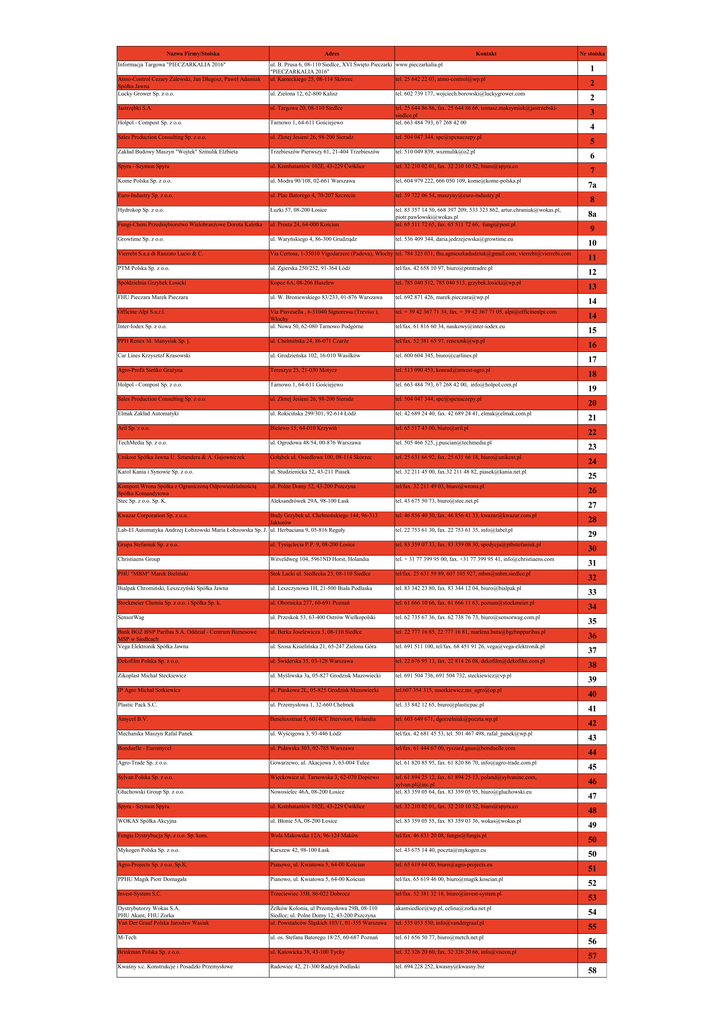 Nazwa Firmy/Stoiska Informacja Targowa "PIECZARKALIA 2016" Atmo-Control Cezary Zalewski, Jan Długosz, Paweł Adamiak Spółka Jawna Lucky Grower Sp. z o.o. Adres Kontakt ul. B. Prusa 6, 08-110 Siedlce, XVI Święto Pieczarki www.pieczarkalia.pl "PIECZARKALIA 2016" ul. Kameckiego 25, 08-114 Skórzec tel. 25 642 22 03, [email protected] ul. Zielona 12, 62-800 Kalisz tel. 602 739 177, [email protected] Jastrzębki S.A. ul. Targowa 20, 08-110 Siedlce Holpol - Compost Sp. z o.o. Tarnowo 1, 64-611 Gościejewo tel. 25 644 86 86, fax. 25 644 86 66, [email protected] tel. 663 484 793, 67 268 42 00 Sales Production Consulting Sp. z o.o. ul. Złotej Jesieni 26, 98-200 Sieradz tel. 504 047 344, [email protected] Zakład Budowy Maszyn "Wojtek" Szmulik Elżbieta Trzebieszów Pierwszy 61, 21-404 Trzebieszów tel. 510 049 839, [email protected] Spyra - Szymon Spyra ul. Kombatantów 102E, 43-229 Ćwiklice tel. 32 210 02 01, fax. 32 210 10 52, [email protected] Kome Polska Sp. z o.o. ul. Modra 90/108, 02-661 Warszawa tel. 604 979 222, 666 050 109, [email protected] Euro-Industry Sp. z o.o. ul. Plac Batorego 4, 70-207 Szczecin tel. 59 722 06 54, [email protected] Hydrokop Sp. z o.o. Łuzki 57, 08-200 Łosice Fungi-Chem Przedsiębiorstwo Wielobranżowe Dorota Kaletka ul. Prosta 24, 64-000 Kościan tel. 83 357 14 50, 668 397 209, 533 323 862, [email protected], [email protected] tel. 65 511 72 65, fax. 65 511 72 66, [email protected] Growtime Sp. z o.o. ul. Waryńskiego 4, 86-300 Grudziądz tel. 536 409 344, [email protected] Vierrebi S.a.a di Ranzato Lucio & C. Via Certosa, 1-35010 Vigodarzere (Padova), Włochy tel. 784 325 031, [email protected], [email protected] PTM Polska Sp. z o.o. ul. Zgierska 250/252, 91-364 Łódź tel/fax. 42 658 10 97, [email protected] Spółdzielnia Grzybek Łosicki Kopce 6A, 08-206 Huszlew tel. 785 040 512, 785 040 513, [email protected] FHU Pieczara Marek Pieczara ul. W. Broniewskiego 83/233, 01-876 Warszawa tel. 692 871 426, [email protected] Officine Alpi S.u.r.l. tel. + 39 42 367 71 34, fax. + 39 42 367 71 05, [email protected] Inter-Iodex Sp. z o.o. Via Piavesella , 6-31040 Signoressa (Treviso ), Włochy ul. Nowa 50, 62-080 Tarnowo Podgórne PPH Renex M. Manysiak Sp. j. ul. Chełmińska 24, 86-071 Czarże tel/fax. 52 381 65 97, [email protected] Car Lines Krzysztof Krasowski ul. Grodzieńska 102, 16-010 Wasilków tel. 600 604 345, [email protected] Agro-Profit Sieńko Grażyna Tereszyn 25, 21-030 Motycz tel. 513 090 453, [email protected] Holpol - Compost Sp. z o.o. Tarnowo 1, 64-611 Gościejewo tel. 663 484 793, 67 268 42 00, [email protected] Sales Production Consulting Sp. z o.o. ul. Złotej Jesieni 26, 98-200 Sieradz tel. 504 047 344, [email protected] Elmak Zakład Automatyki ul. Rokicińska 299/301, 92-614 Łódź tel. 42 689 24 40, fax. 42 689 24 41, [email protected] Aril Sp. z o.o. Bielewo 15, 64-010 Krzywiń tel. 65 517 43 00, [email protected] TechMedia Sp. z o.o. ul. Ogrodowa 48/54, 00-876 Warszawa tel. 505 466 525, [email protected] Unikost Spółka Jawna U. Sztandera & A. Gajowniczek Gołąbek ul. Osiedlowa 100, 08-114 Skórzec tel. 25 631 66 92, fax. 25 631 66 18, [email protected] Karol Kania i Synowie Sp. z o.o. ul. Studzienicka 52, 43-211 Piasek tel. 32 211 45 00, fax.32 211 48 82, [email protected] Kompost Wrona Spółka z Ograniczoną Odpowiedzialnością Spółka Komandytowa Stec Sp. z o.o. Sp. K. ul. Polne Domy 52, 43-200 Pszczyna tel/fax. 32 211 49 03, [email protected] Aleksandrówek 29A, 98-100 Łask tel. 43 675 50 73, [email protected] Budy Grzybek ul. Chełmońskiego 144, 96-313 Jaktorów Lab-El Automatyka Andrzej Łobzowski Maria Łobzowska Sp. J. ul. Herbaciana 9, 05-816 Reguły Kwazar Corporation Sp. z o.o. tel/fax. 61 816 60 34, [email protected] tel. 46 856 40 30, fax. 46 856 41 33, [email protected] tel. 22 753 61 30, fax. 22 753 61 35, [email protected] Grupa Stefaniuk Sp. z o.o. ul. Tysiąclecia P.P. 9, 08-200 Łosice tel. 83 359 07 33, fax. 83 359 08 30, [email protected] Christiaens Group Witveldweg 104, 5961ND Horst, Holandia tel. + 31 77 399 95 00, fax. +31 77 399 95 41, [email protected] PHU "MBM" Marek Bieliński Stok Lacki ul. Siedlecka 25, 08-110 Siedlce tel/fax. 25 631 59 89, 607 105 927, [email protected] Bialpak Chromiński, Leszczyński Spółka Jawna ul. Leszczynowa 1H, 21-500 Biała Podlaska tel. 83 342 23 80, fax. 83 344 12 04, [email protected] Stockmeier Chemia Sp. z o.o. i Spółka Sp. k. ul. Obornicka 277, 60-691 Poznań tel. 61 666 10 66, fax. 61 666 11 63, [email protected] SensorWag ul. Przeskok 53, 63-400 Ostrów Wielkopolski tel. 62 735 67 36, fax. 62 738 76 73, [email protected] Bank BGŻ BNP Paribas S.A. Oddział - Centrum Biznesowe MSP w Siedlcach Vega Elektronik Spółka Jawna ul. Berka Joselewicza 3, 08-110 Siedlce tel. 22 777 16 85, 22 777 16 81, [email protected] ul. Szosa Kisielińska 21, 65-247 Zielona Góra tel. 691 511 100, tel/fax. 68 451 91 26, [email protected] Dekofilm Polska Sp. z o.o. ul. Świderska 35, 03-128 Warszawa tel. 22 676 95 13, fax. 22 814 26 08, [email protected] Zikoplast Michał Steckiewicz ul. Myśliwska 3a, 05-827 Grodzisk Mazowiecki tel. 691 504 736, 691 504 732, [email protected] IP Agro Michał Sotkiewicz ul. Piaskowa 2L, 05-825 Grodzisk Mazowiecki tel.607 354 315, [email protected] Plastic Pack S.C. ul. Przemysłowa 1, 32-660 Chełmek tel. 33 842 12 65, [email protected] Amycel B.V. Beneluxstraat 5, 6014CC Ittervoort, Holandia tel. 603 649 671, [email protected] Mechanika Maszyn Rafal Panek ul. Wyścigowa 3, 93-446 Łódź tel/fax. 42 681 45 53, tel. 501 467 498, [email protected] Bonduelle - Euromycel ul. Puławska 303, 02-785 Warszawa tel/fax. 61 444 67 00, [email protected] Agro-Trade Sp. z o.o. Gowarzewo, ul. Akacjowa 3, 63-004 Tulce tel. 61 820 85 95, fax. 61 820 86 70, [email protected] Sylvan Polska Sp. z o.o. Więckowice ul. Tarnowska 3, 62-070 Dopiewo Głuchowski Group Sp. z o.o. Nowosielec 46A, 08-200 Łosice tel. 61 894 25 12, fax. 61 894 25 13, [email protected], [em