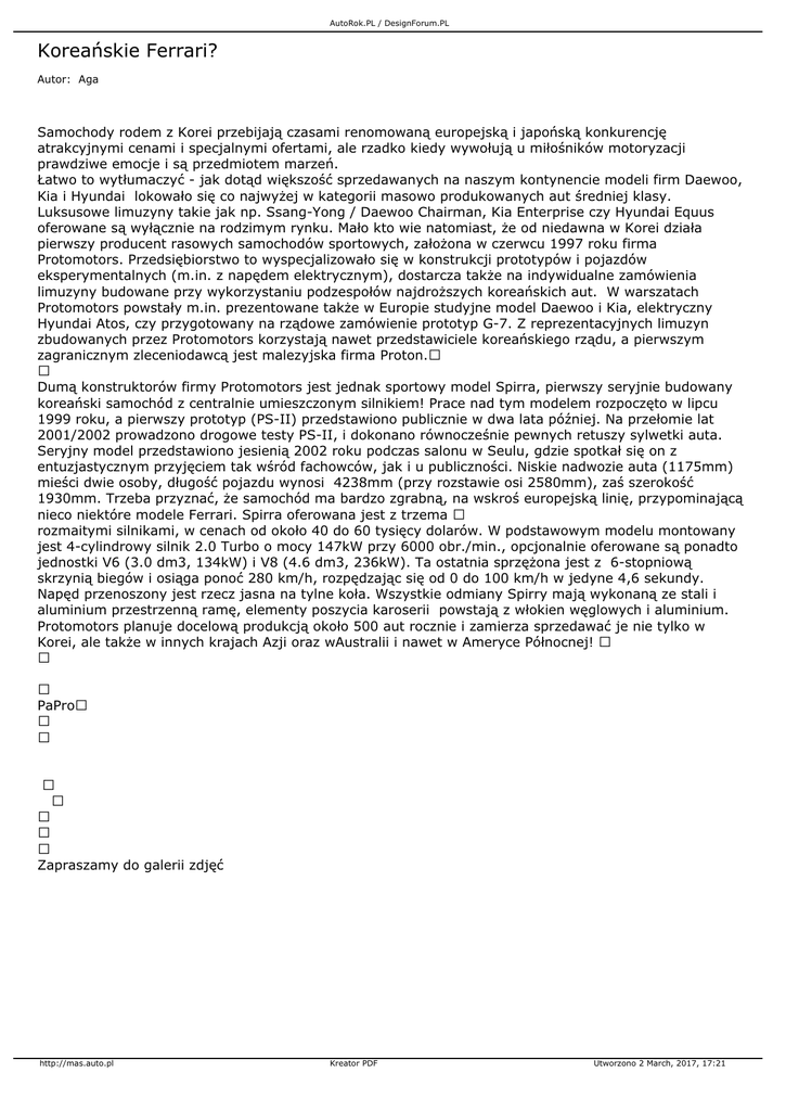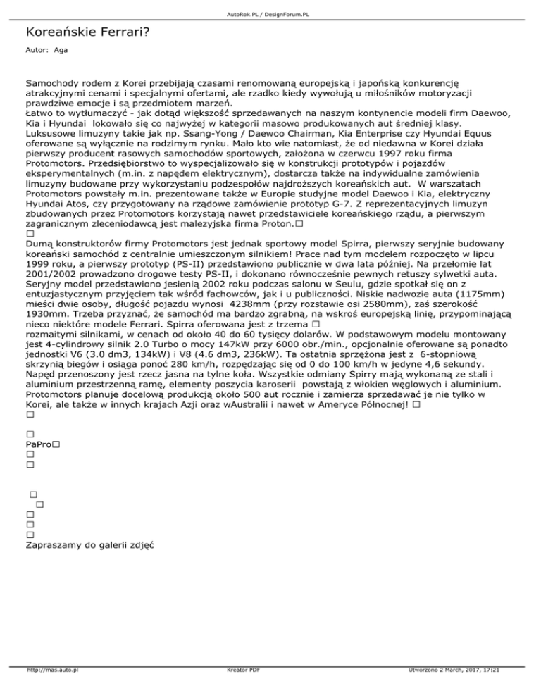 AutoRok.PL / DesignForum.PL Koreańskie Ferrari? Autor: Aga Samochody rodem z Korei przebijają czasami renomowaną europejską i japońską konkurencję atrakcyjnymi cenami i specjalnymi ofertami, ale rzadko kiedy wywołują u miłośników motoryzacji prawdziwe emocje i są przedmiotem marzeń. Łatwo to wytłumaczyć - jak dotąd większość sprzedawanych na naszym kontynencie modeli firm Daewoo, Kia i Hyundai lokowało się co najwyżej w kategorii masowo produkowanych aut średniej klasy. Luksusowe limuzyny takie jak np. Ssang-Yong / Daewoo Chairman, Kia Enterprise czy Hyundai Equus oferowane są wyłącznie na rodzimym rynku. Mało kto wie natomiast, że od niedawna w Korei działa pierwszy producent rasowych samochodów sportowych, założona w czerwcu 1997 roku firma Protomotors. Przedsiębiorstwo to wyspecjalizowało się w konstrukcji prototypów i pojazdów eksperymentalnych (m.in. z napędem elektrycznym), dostarcza także na indywidualne zamówienia limuzyny budowane przy wykorzystaniu podzespołów najdroższych koreańskich aut. W warszatach Protomotors powstały m.in. prezentowane także w Europie studyjne model Daewoo i Kia, elektryczny Hyundai Atos, czy przygotowany na rządowe zamówienie prototyp G-7. Z reprezentacyjnych limuzyn zbudowanych przez Protomotors korzystają nawet przedstawiciele koreańskiego rządu, a pierwszym zagranicznym zleceniodawcą jest malezyjska firma Proton. Dumą konstruktorów firmy Protomotors jest jednak sportowy model Spirra, pierwszy seryjnie budowany koreański samochód z centralnie umieszczonym silnikiem! Prace nad tym modelem rozpoczęto w lipcu 1999 roku, a pierwszy prototyp (PS-II) przedstawiono publicznie w dwa lata później. Na przełomie lat 2001/2002 prowadzono drogowe testy PS-II, i dokonano równocześnie pewnych retuszy sylwetki auta. Seryjny model przedstawiono jesienią 2002 roku podczas salonu w Seulu, gdzie spotkał się on z entuzjastycznym przyjęciem tak wśród fachowców, jak i u publiczności. Niskie nadwozie auta (1175mm) mieści dwie osoby, długość pojazdu wynosi 4238mm (przy rozstawie osi 2580mm), zaś szerokość 1930mm. Trzeba przyznać, że samochód ma bardzo zgrabną, na wskroś europejską linię, przypominającą nieco niektóre modele Ferrari. Spirra oferowana jest z trzema rozmaitymi silnikami, w cenach od około 40 do 60 tysięcy dolarów. W podstawowym modelu montowany jest 4-cylindrowy silnik 2.0 Turbo o mocy 147kW przy 6000 obr./min., opcjonalnie oferowane są ponadto jednostki V6 (3.0 dm3, 134kW) i V8 (4.6 dm3, 236kW). Ta ostatnia sprzężona jest z 6-stopniową skrzynią biegów i osiąga ponoć 280 km/h, rozpędzając się od 0 do 100 km/h w jedyne 4,6 sekundy. Napęd przenoszony jest rzecz jasna na tylne koła. Wszystkie odmiany Spirry mają wykonaną ze stali i aluminium przestrzenną ramę, elementy poszycia karoserii powstają z włokien węglowych i aluminium. Protomotors planuje docelową produkcją około 500 aut rocznie i zamierza sprzedawać je nie tylko w Korei, ale także w innych krajach Azji oraz wAustralii i nawet w Ameryce Północnej! PaPro Zapraszamy do galerii zdjęć http://mas.auto.pl Kreator PDF Utworzono 2 March, 2017, 17:21